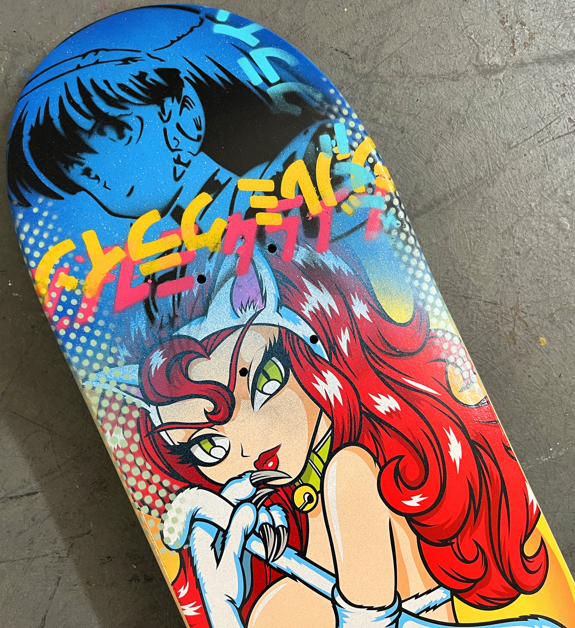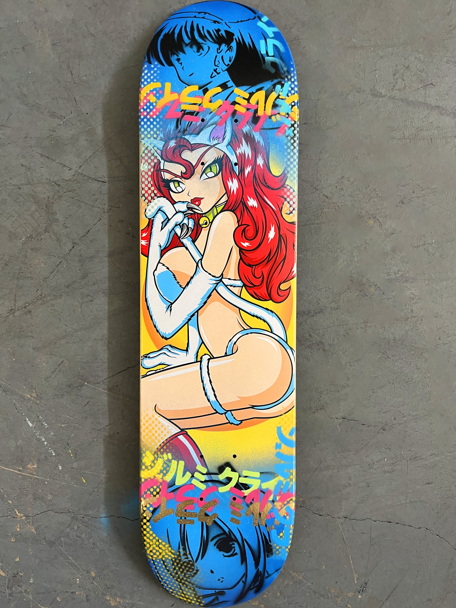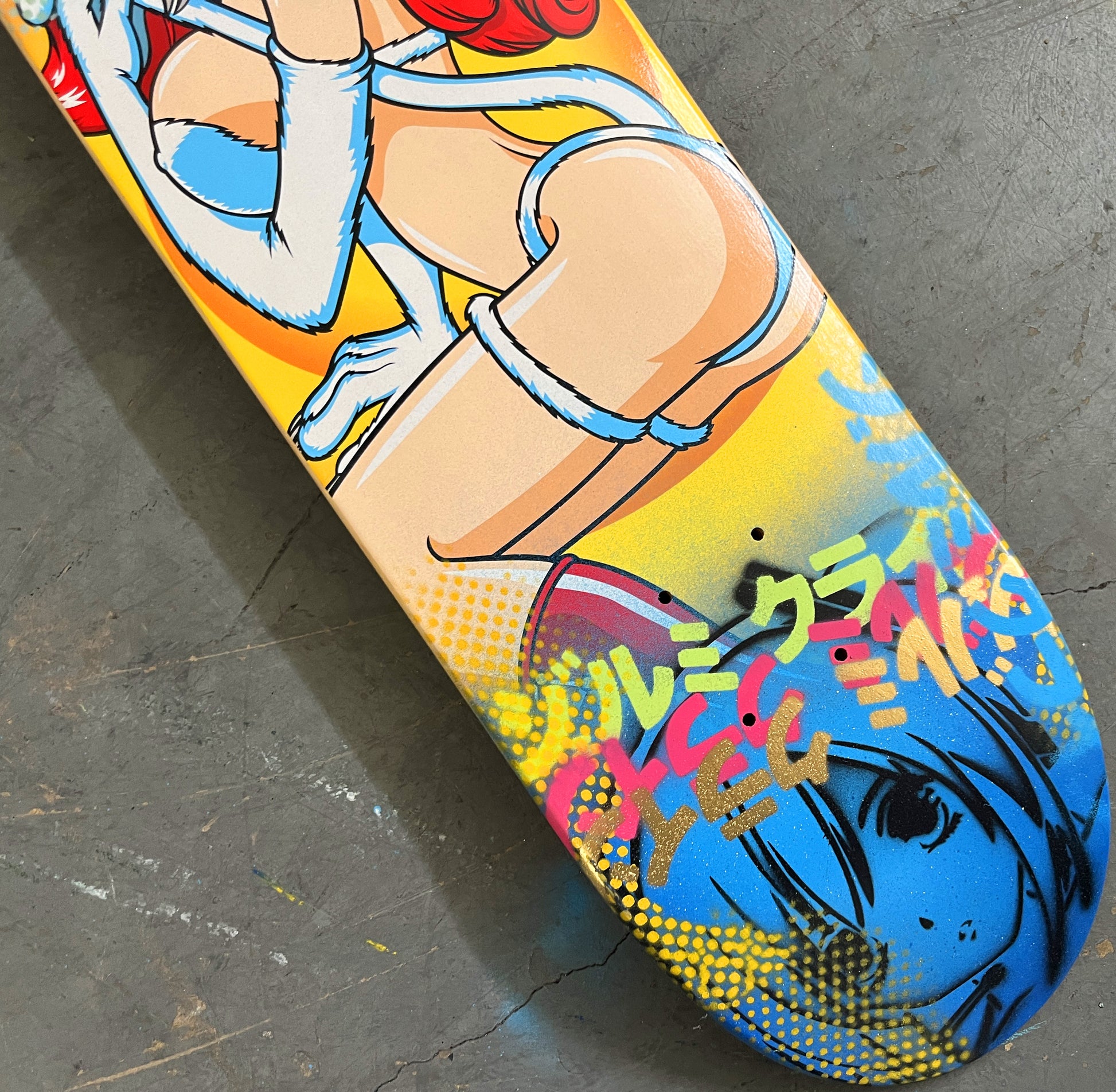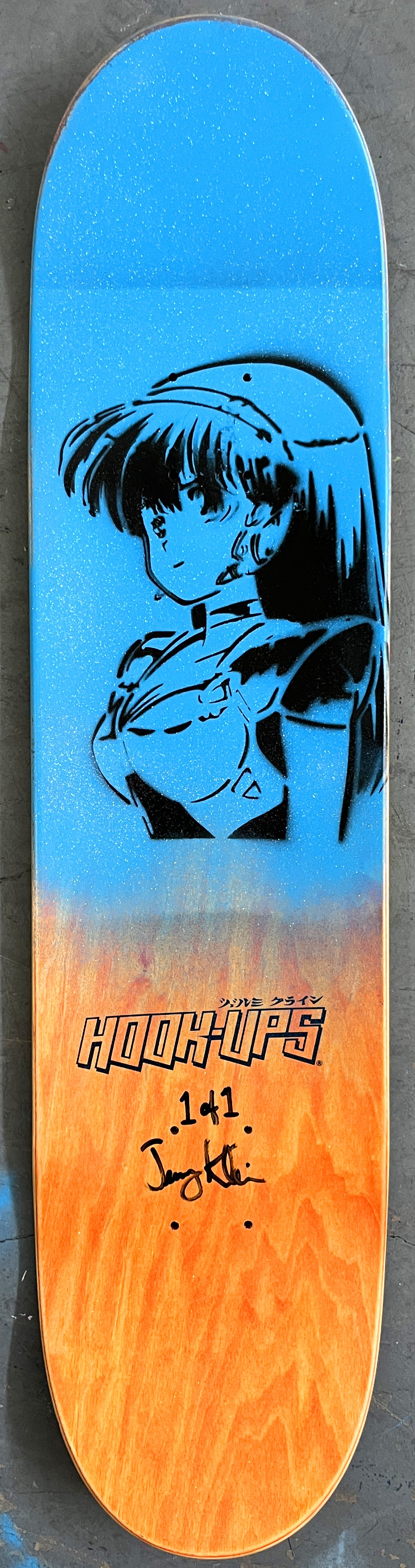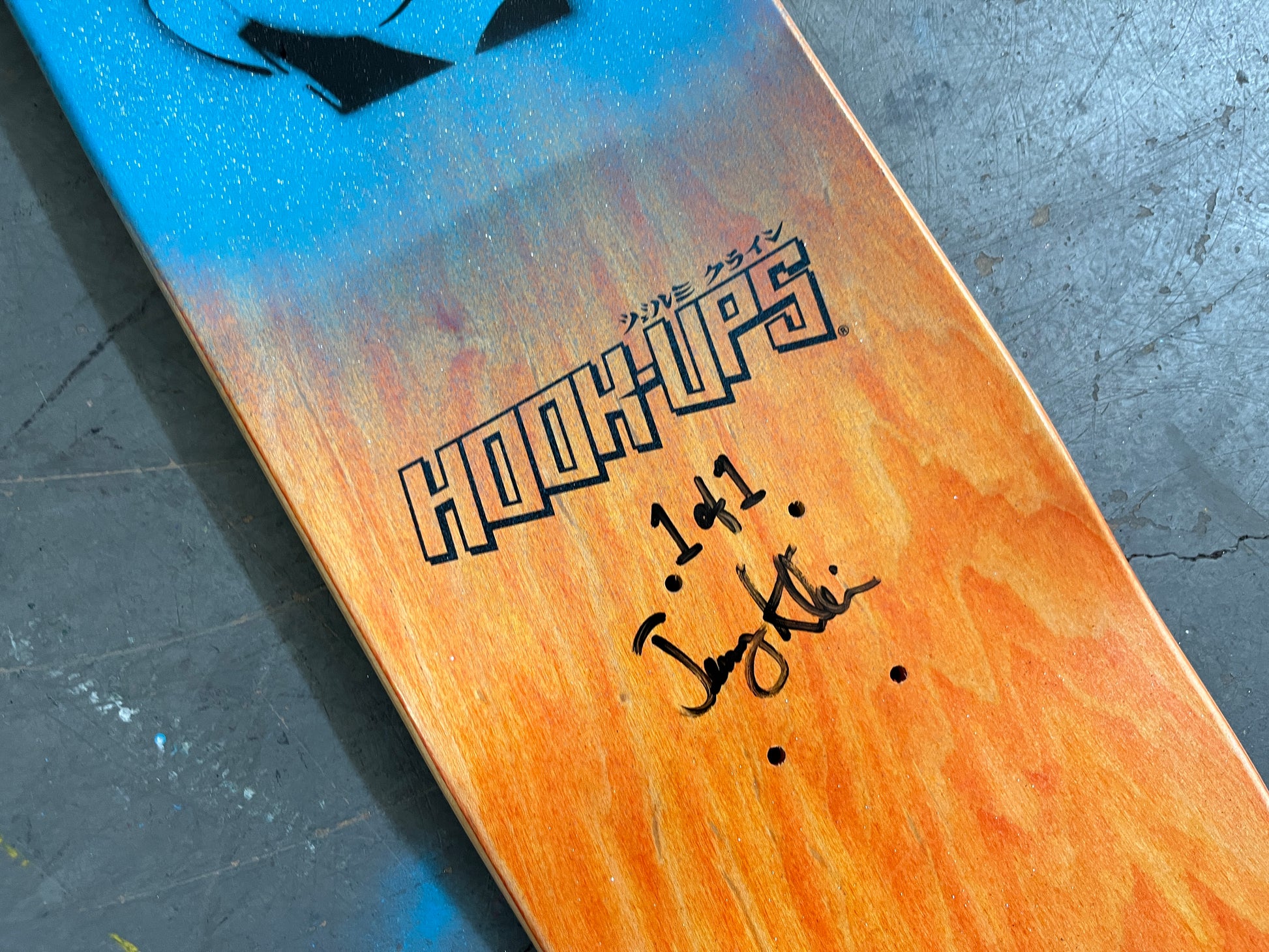 akiko 8.0 X 31.75 BLUE GLITTER MIXED PROCESS SIGNED 1 of 1, heat transfer with hand spray paint, and signed on top. 1 of 1