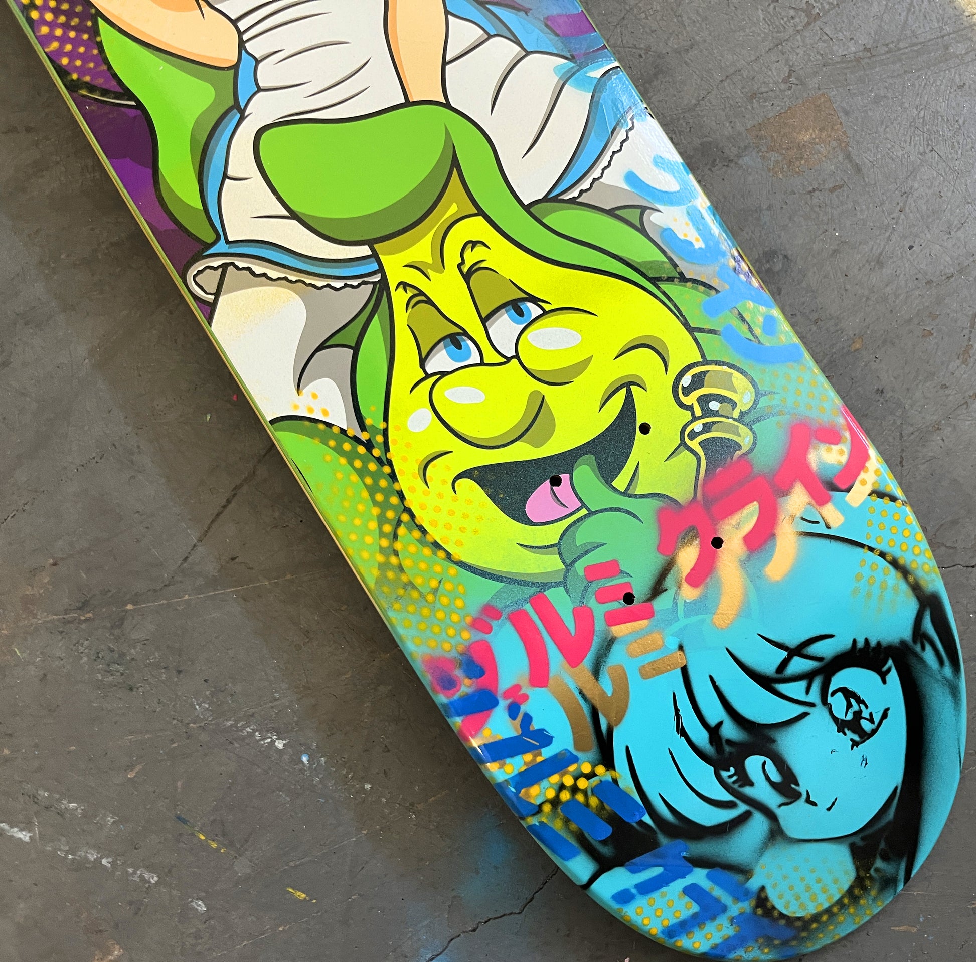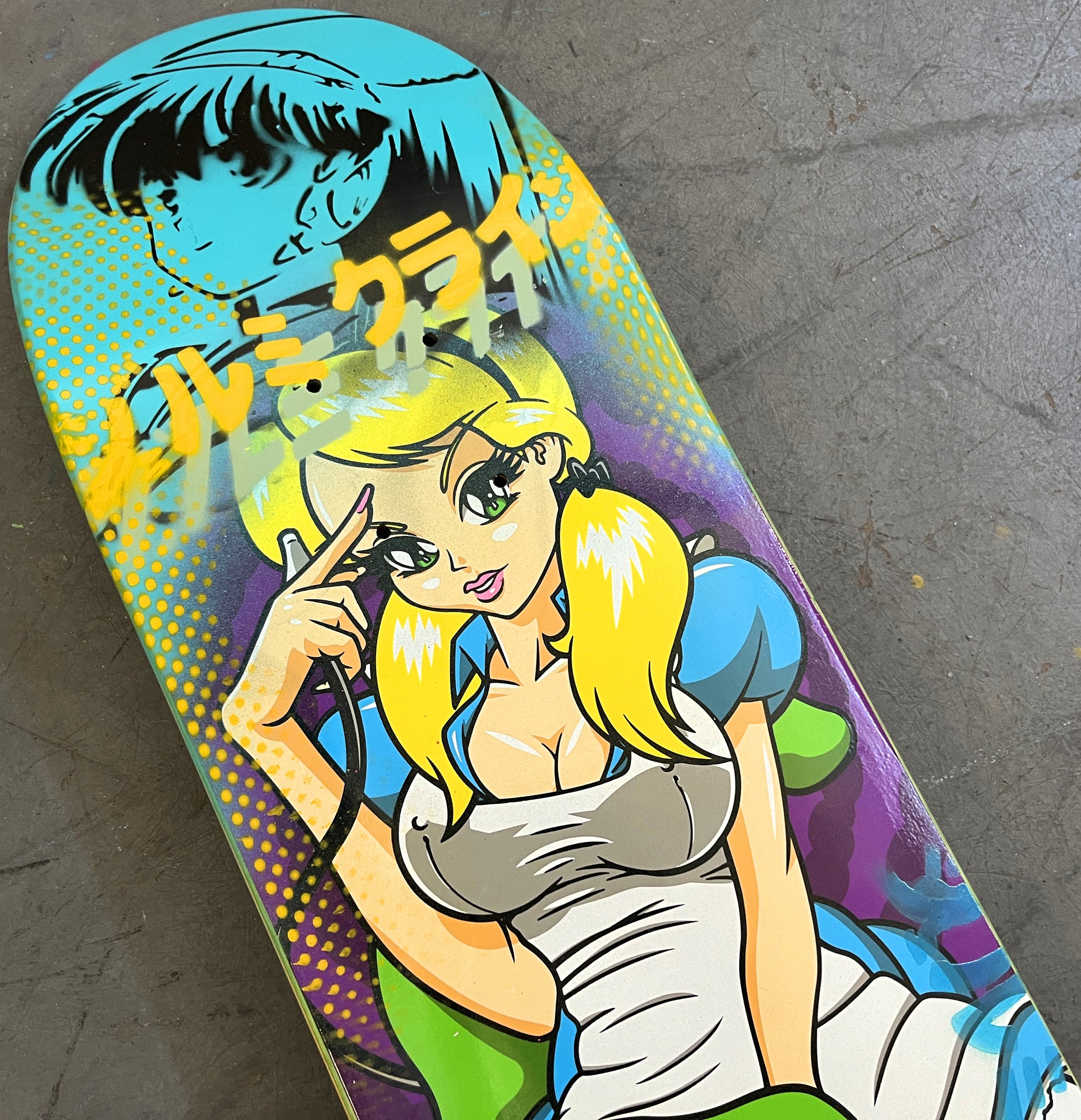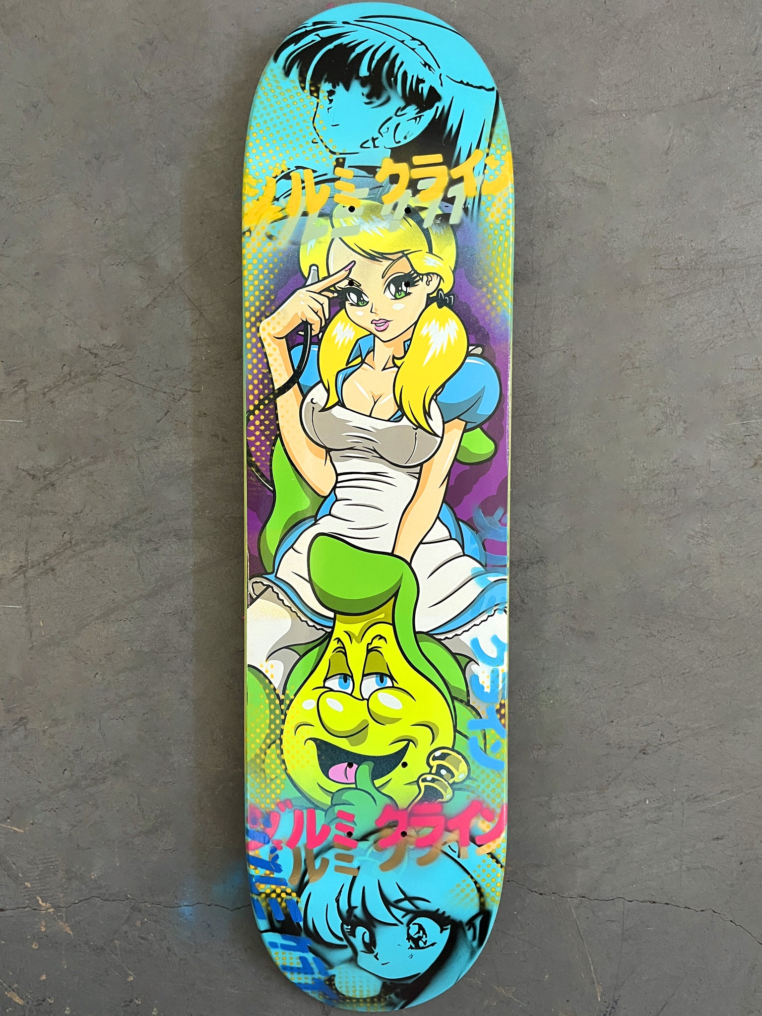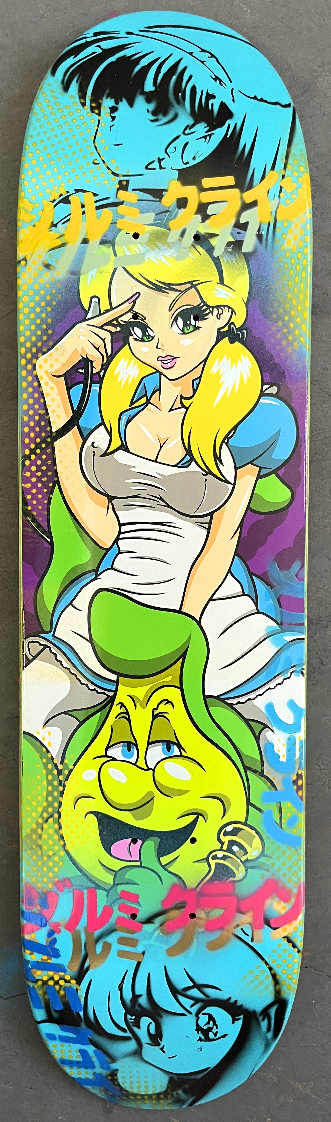 alice 2 8.0 X 31.75 BLUE MIXED PROCESS SIGNED 1 of 1, heat transfer with hand spray paint, and signed on top. 1 of 1