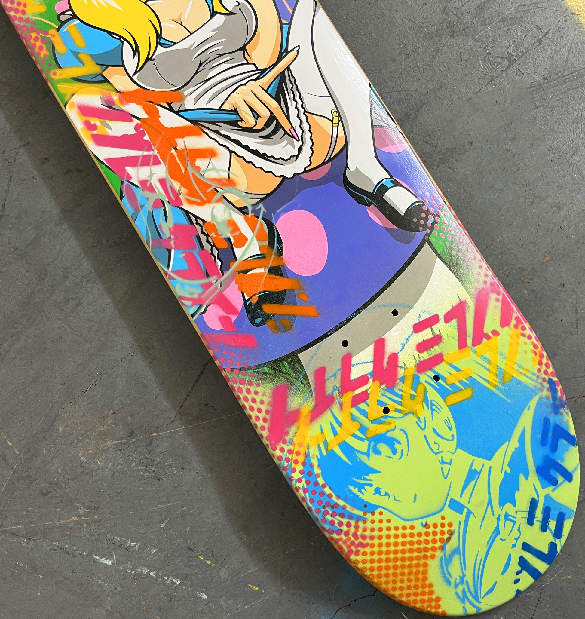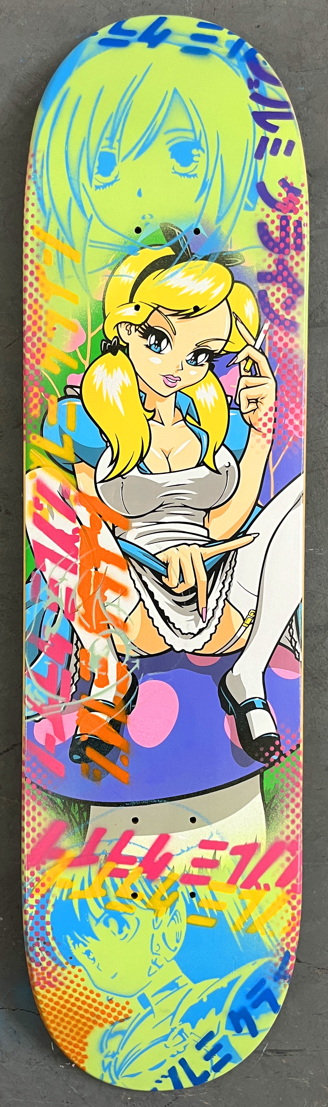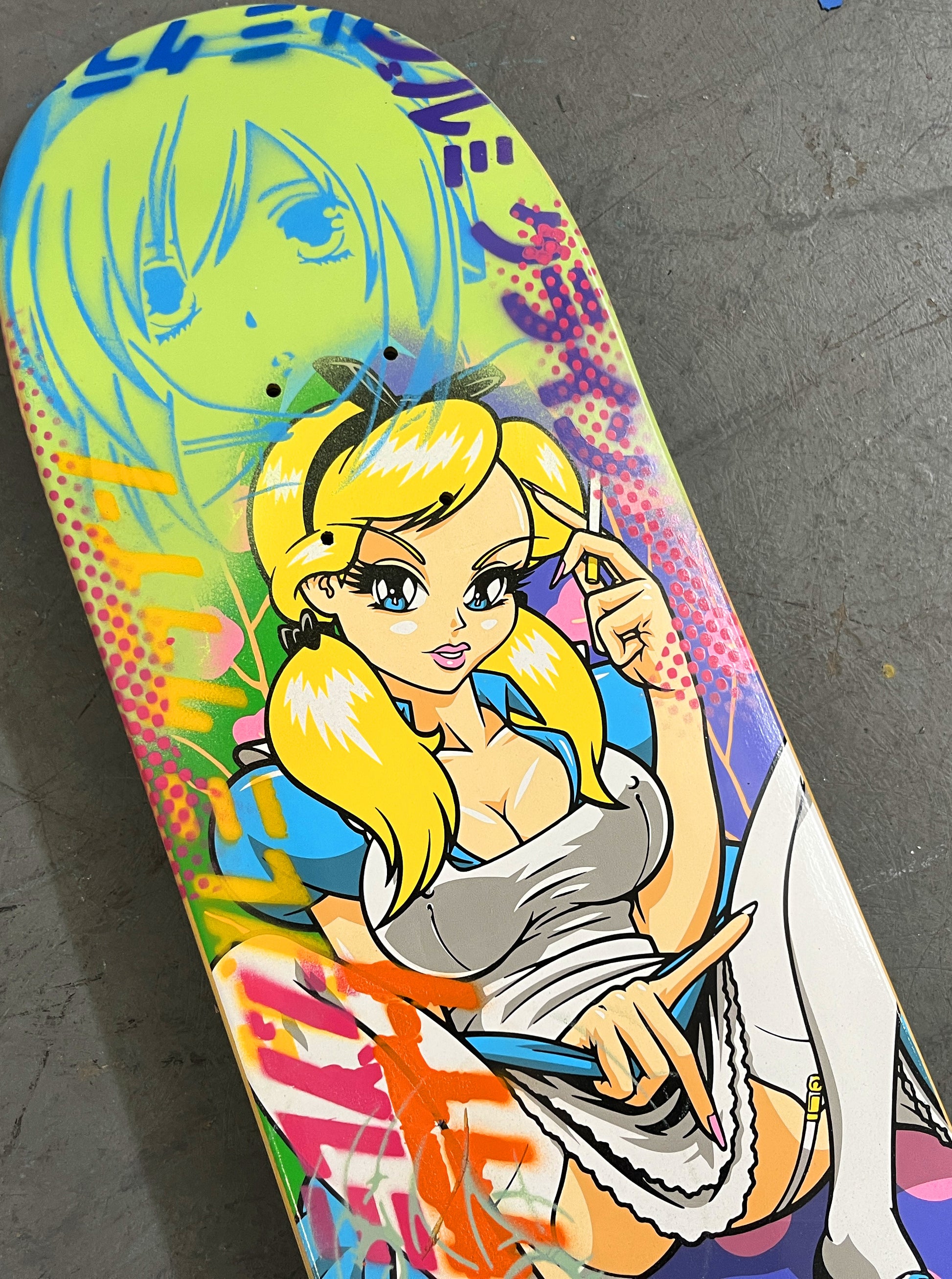 alice 8.0 X 31.75 BLUE/LIGHT GREEN MIXED PROCESS SIGNED 1 of 1, heat transfer with hand spray paint, and signed on top. 1 of 1