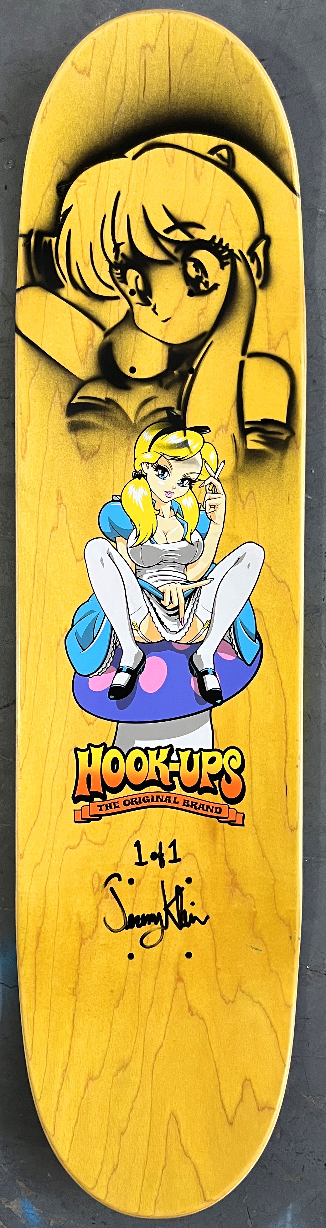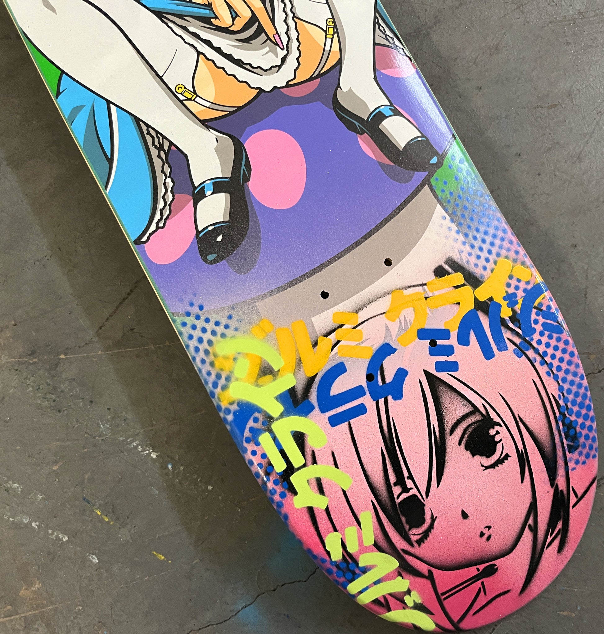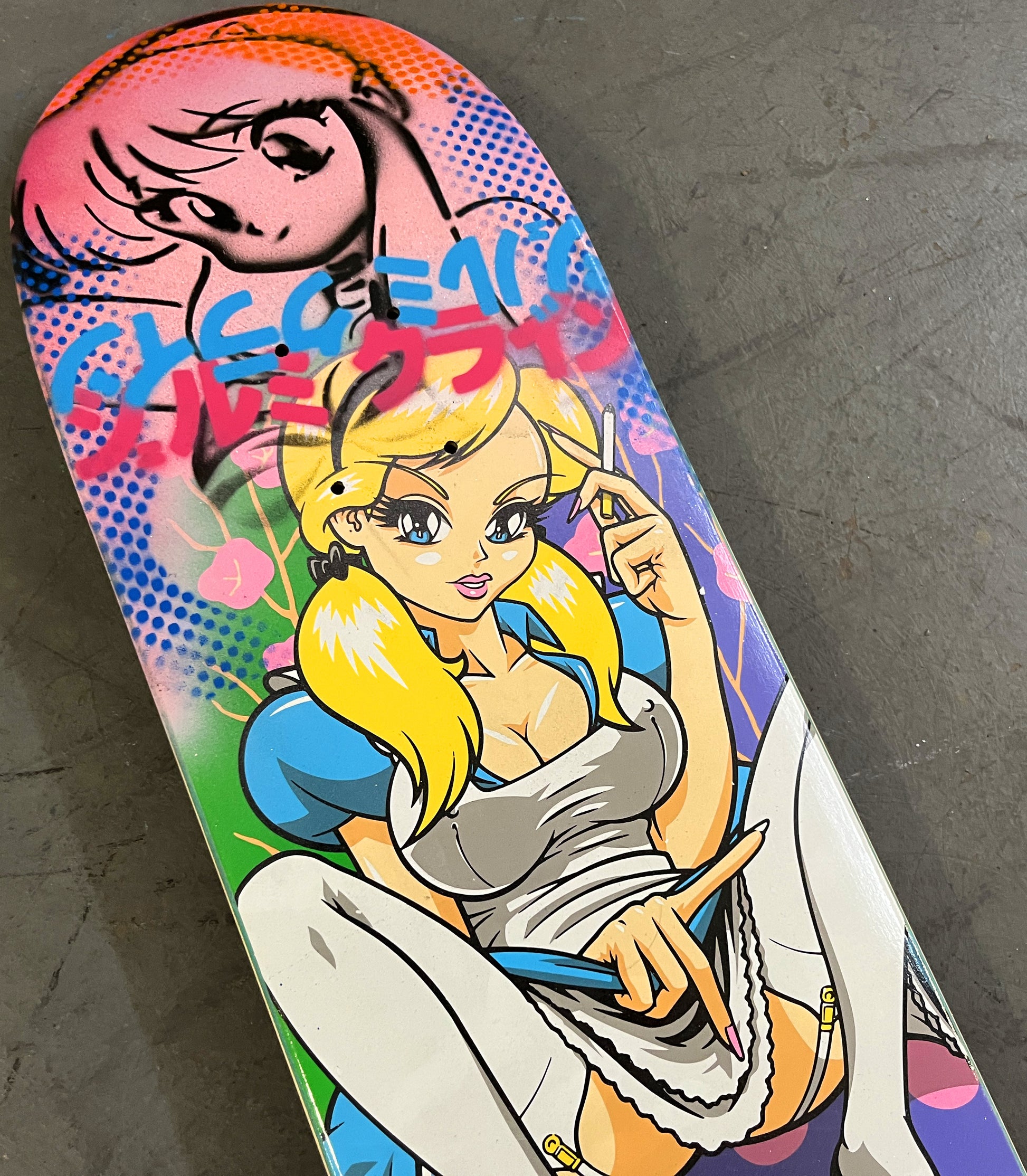 alice 8.0 X 31.75 PINK GLITTER MIXED PROCESS SIGNED 1 of 1, heat transfer with hand spray paint, and signed on top. 1 of 1