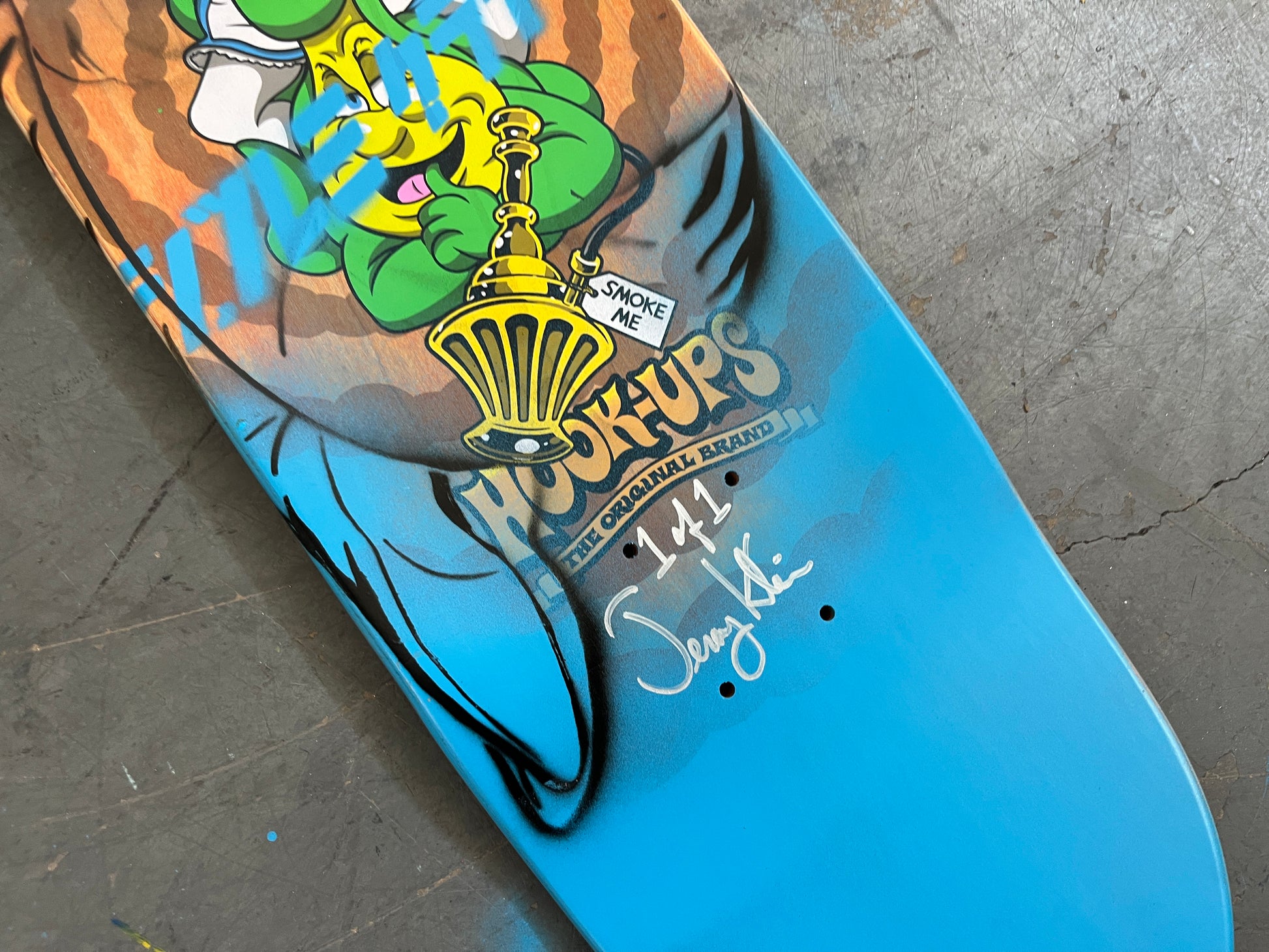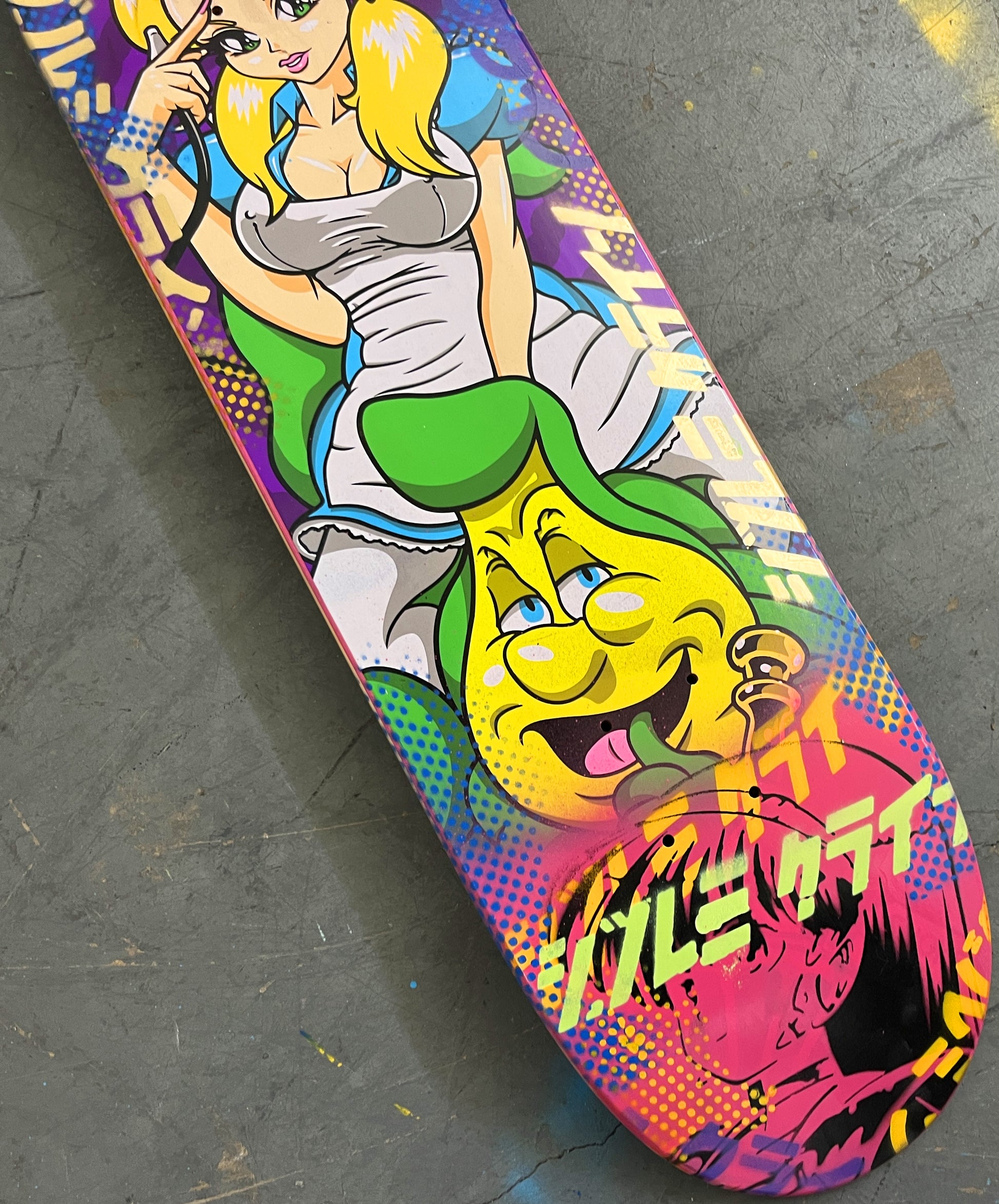 alice 8.0 X 31.75 PINK/PURPLE MIXED PROCESS SIGNED 1 of 1, heat transfer with hand spray paint, and signed on top. 1 of 1