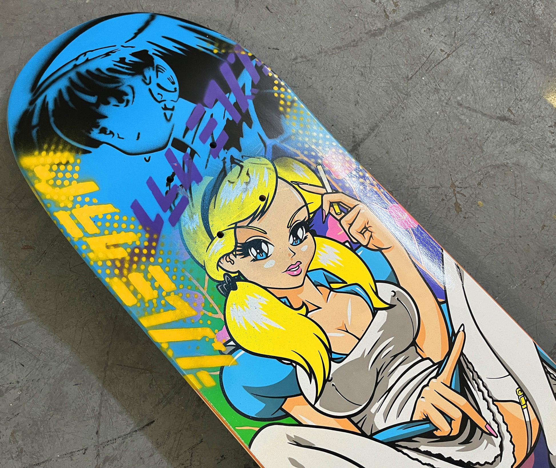 alice 8 X 31.75 BLUE/BLACK MIXED PROCESS SIGNED 1 of 1, heat transfer with hand spray paint, and signed on top. 1 of 1