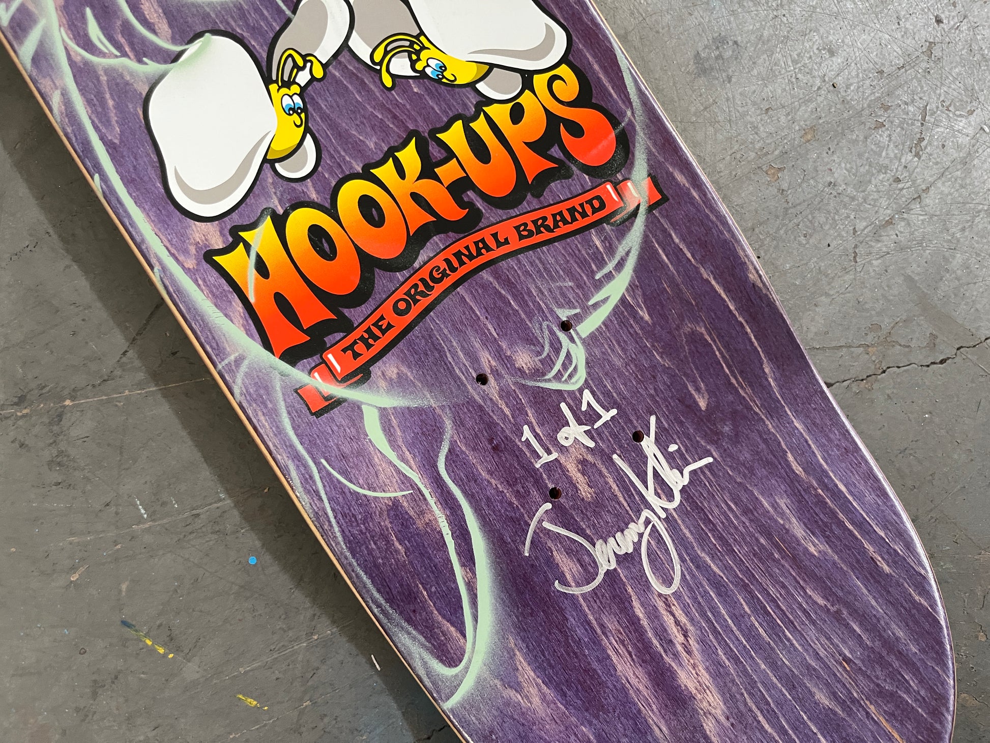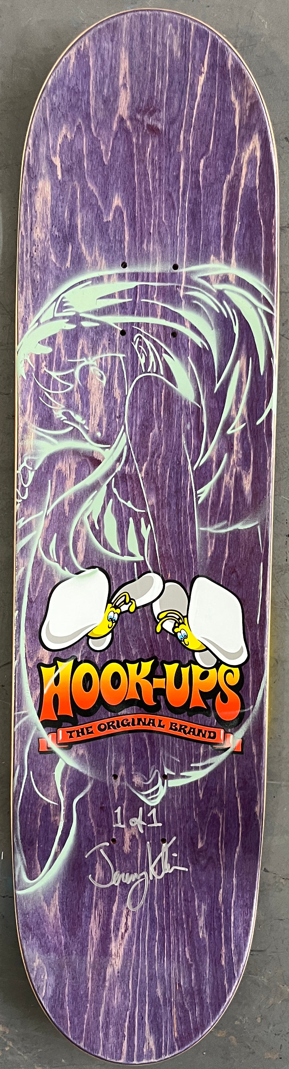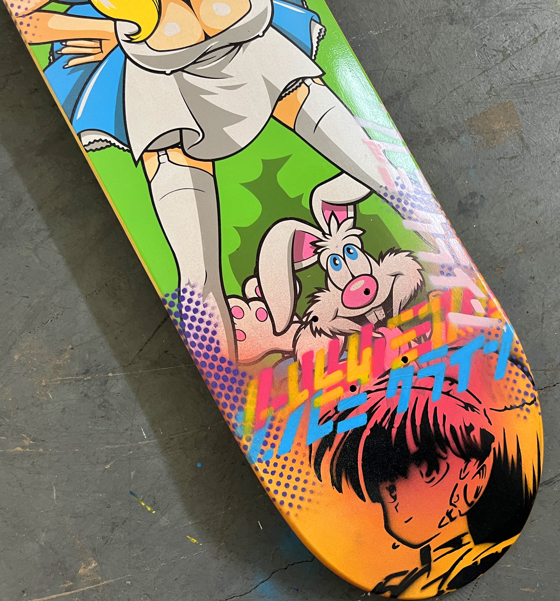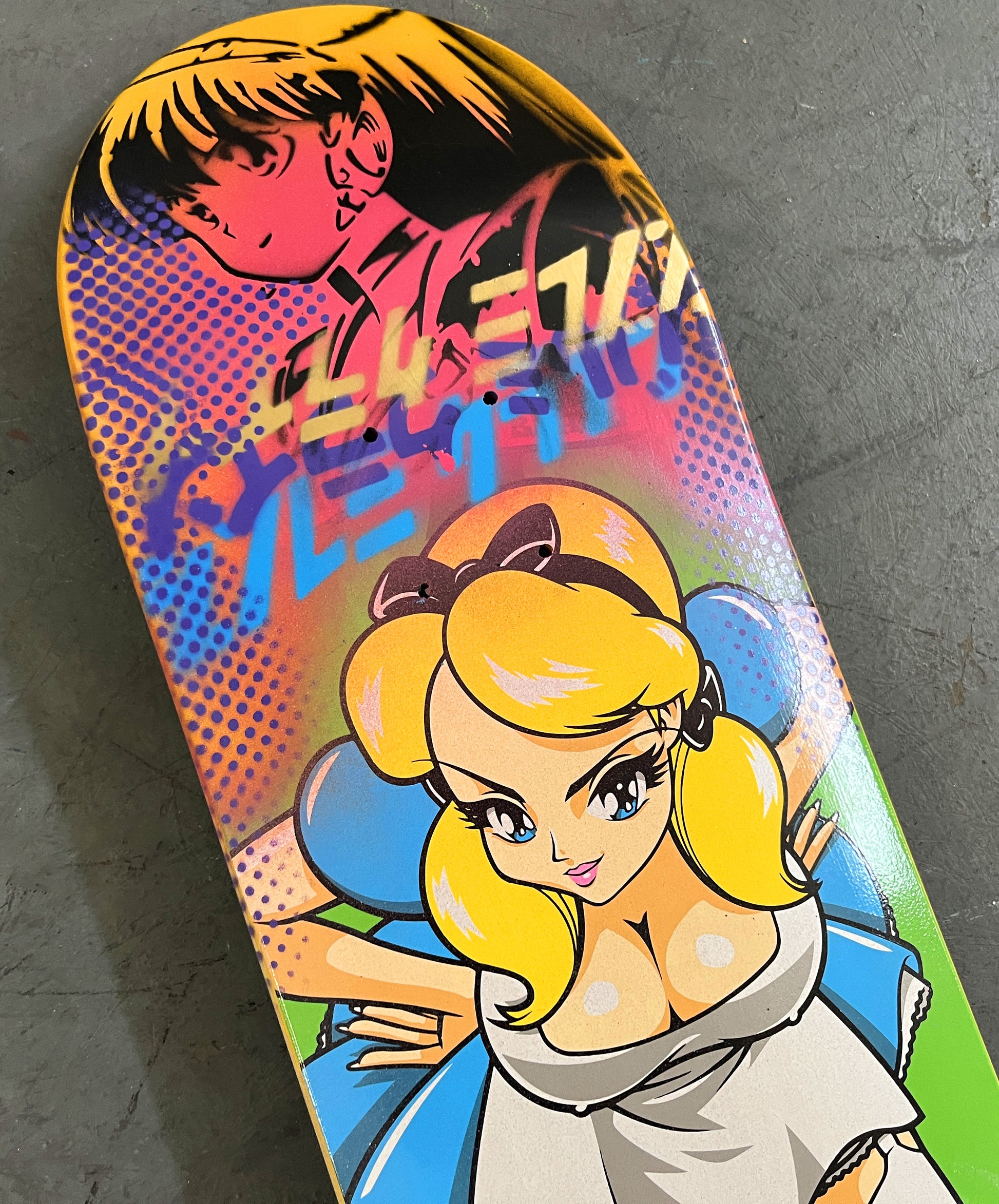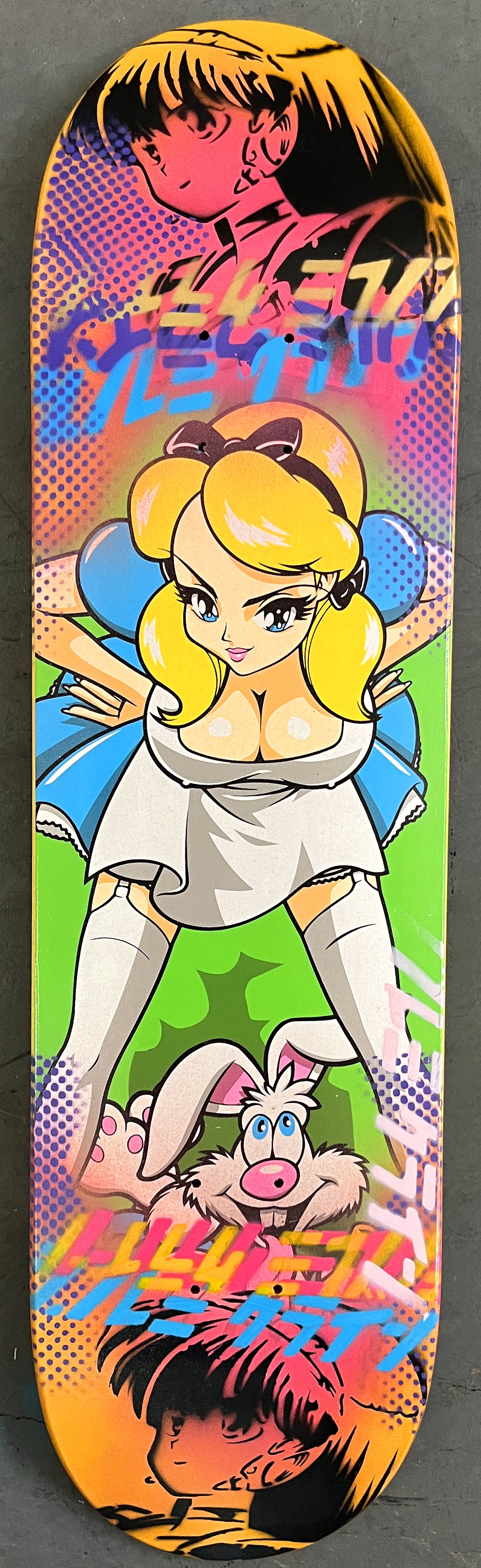 alice & friends 8.25 X 32.25 PINK/YELLOW MIXED PROCESS SIGNED 1 of 1, heat transfer with hand spray paint, and signed on top. 1 of 1
