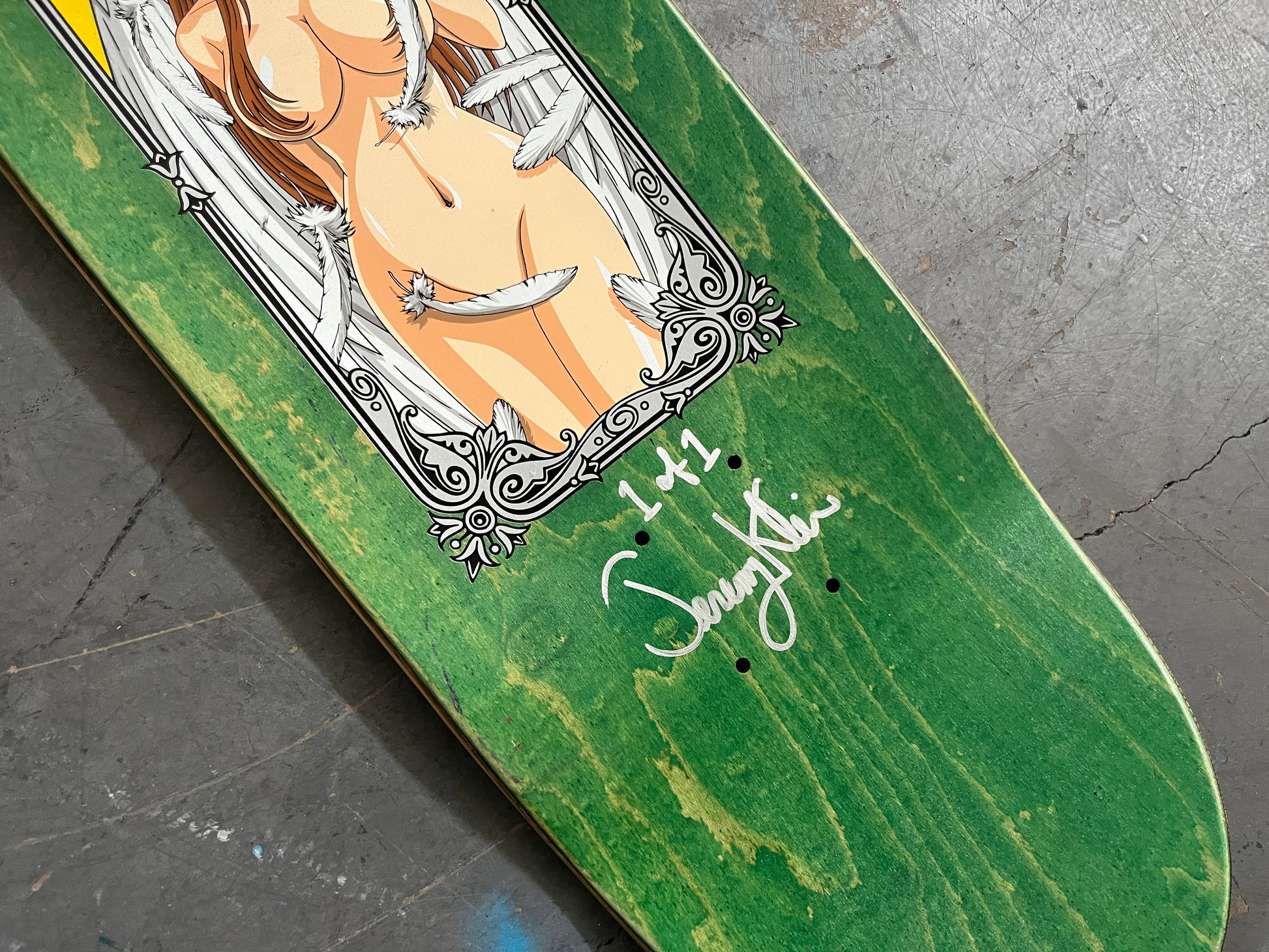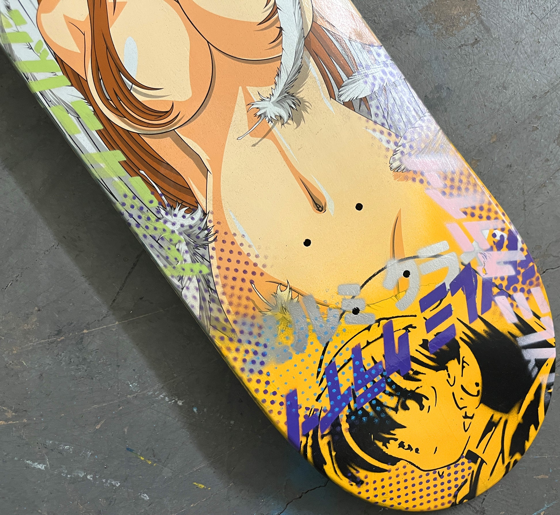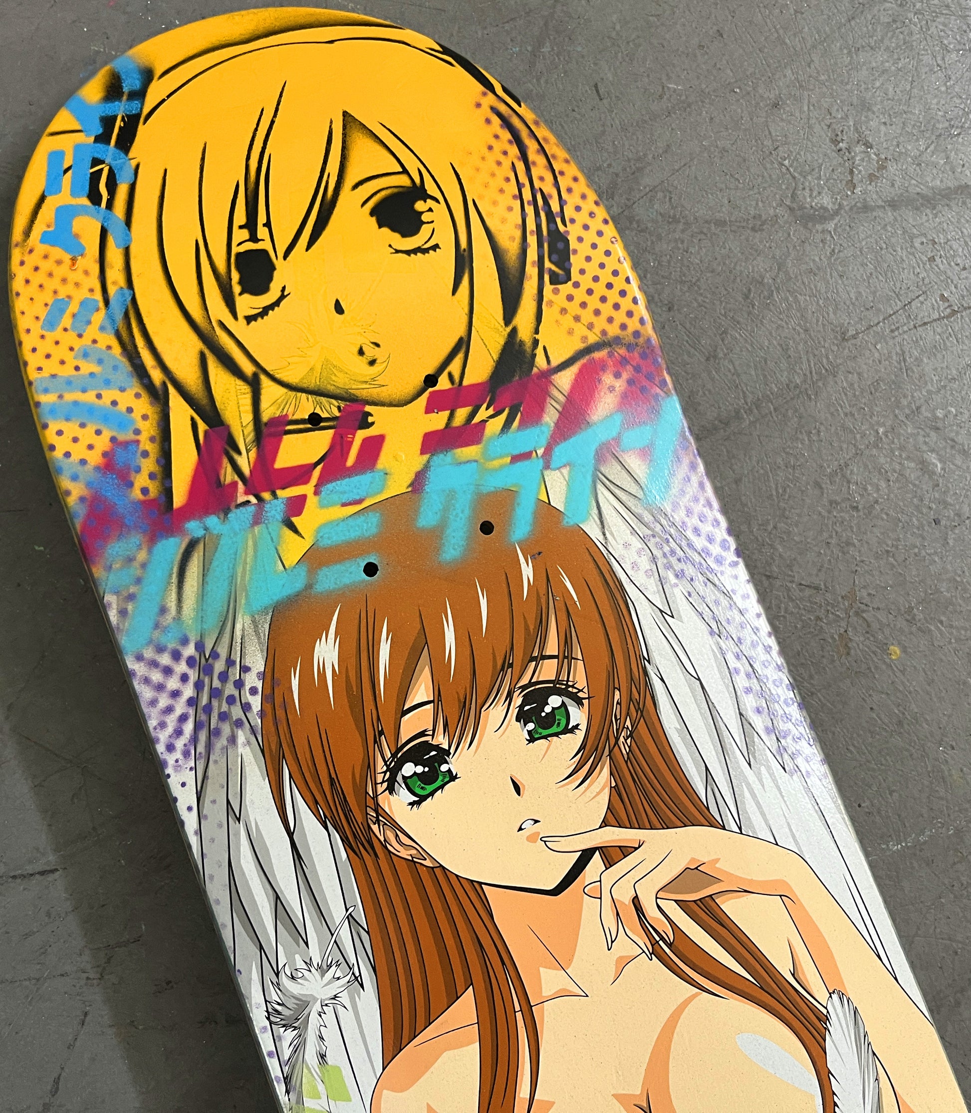 angel girl II 8.25 X 32.25 YELLOW MIXED PROCESS SIGNED 1 of 1, heat transfer with hand spray paint, and signed on top. 1 of 1