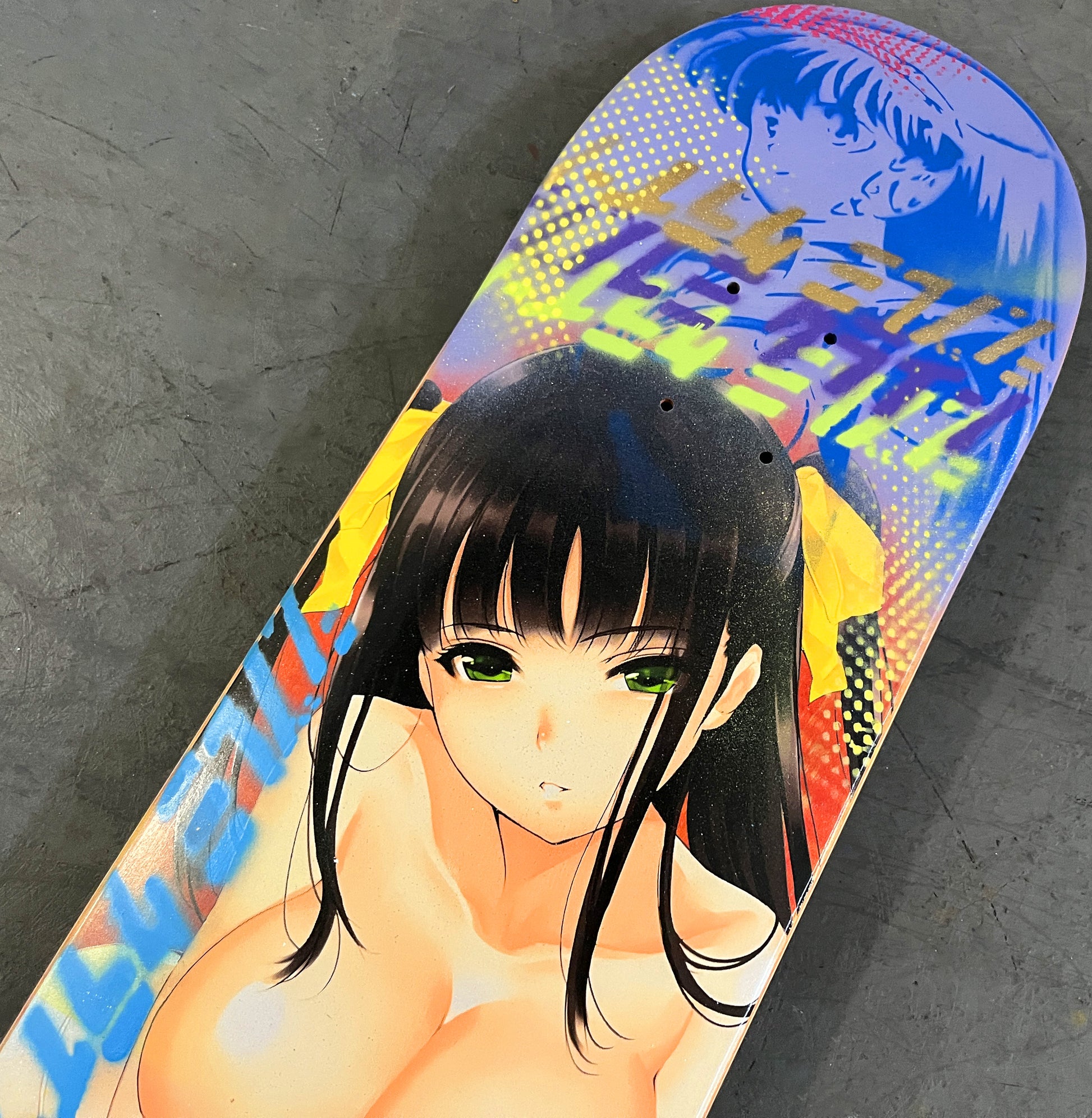 ayumi 8.5 X 32.25 LILAC/BLUE FADE MIXED PROCESS SIGNED 1 of 1, heat transfer with hand spray paint, and signed on top. 1 of 1