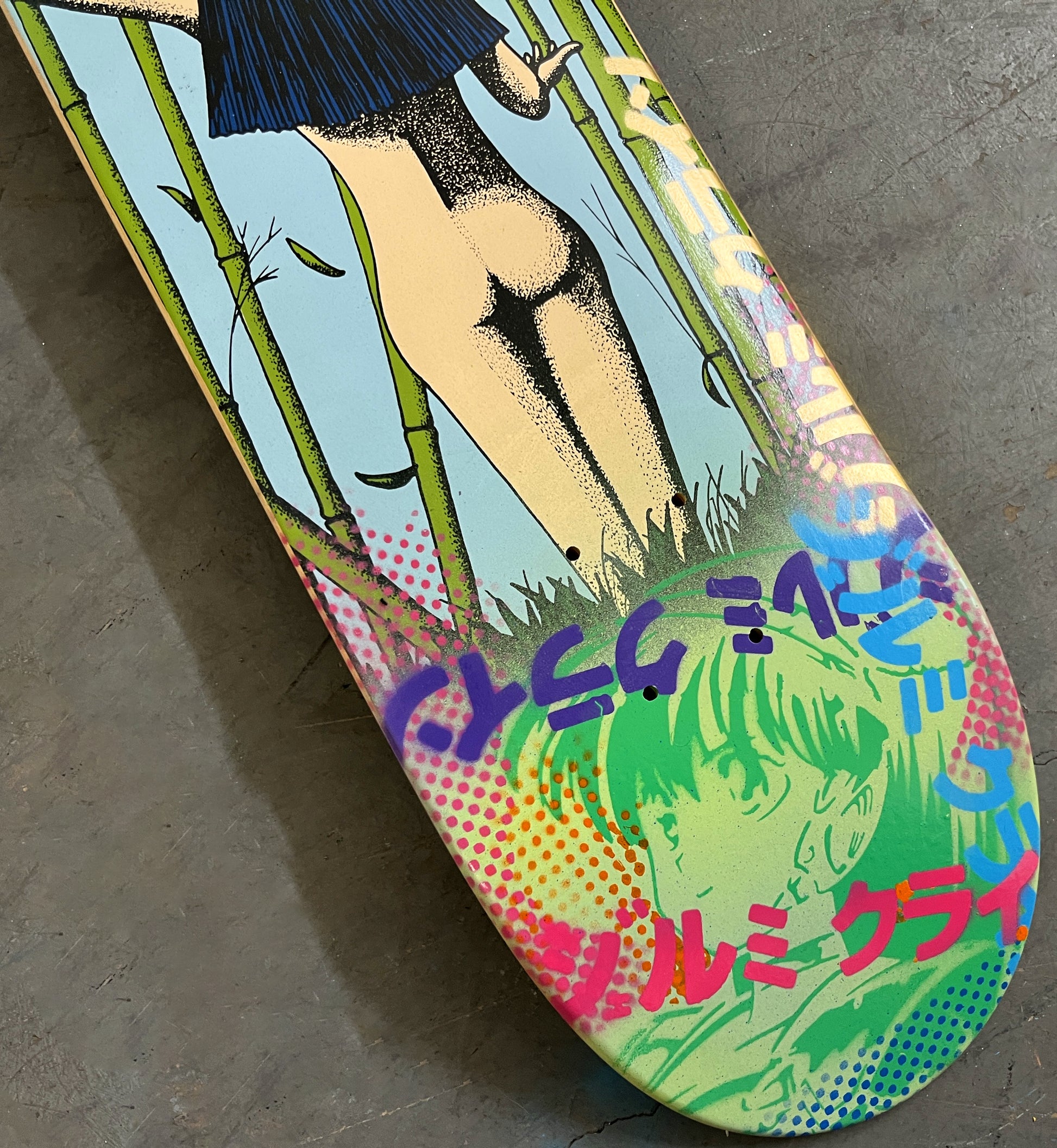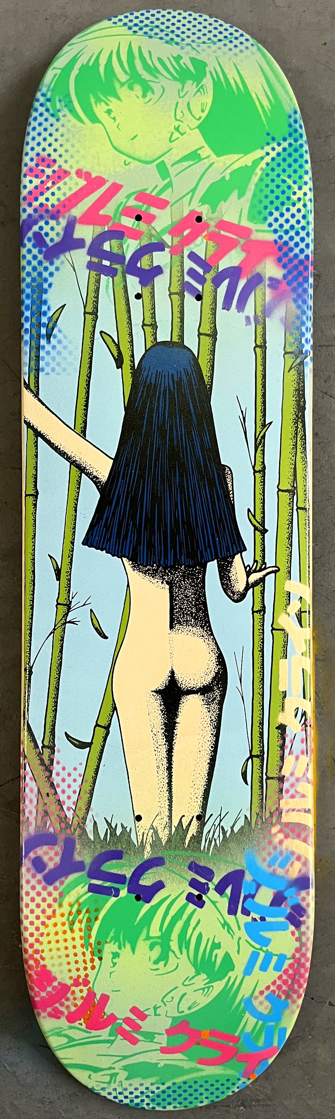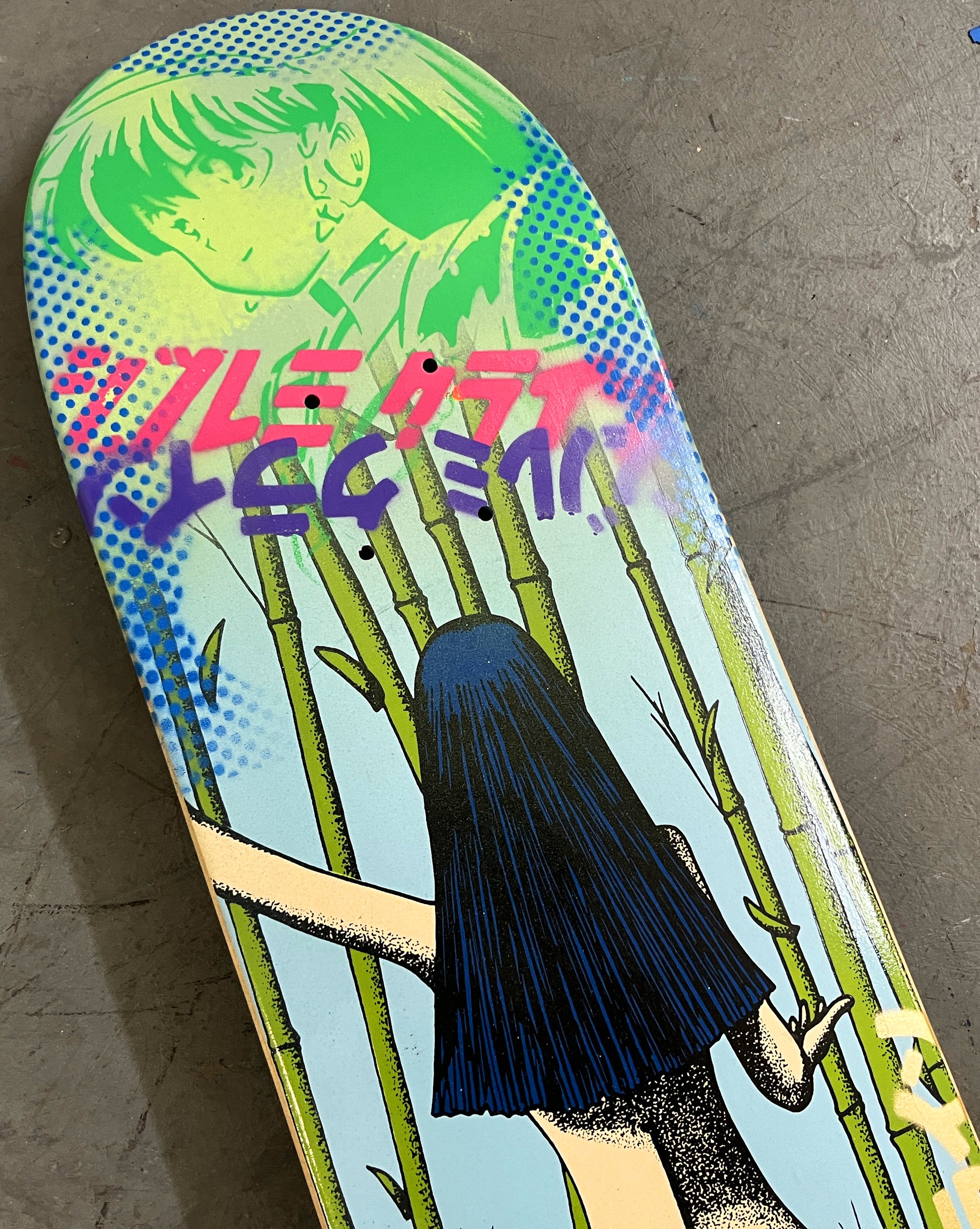 bamboo forest 8.0 X 31.75 GREEN MIXED PROCESS SIGNED 1 of 1, heat transfer with hand spray paint, and signed on top. 1 of 1