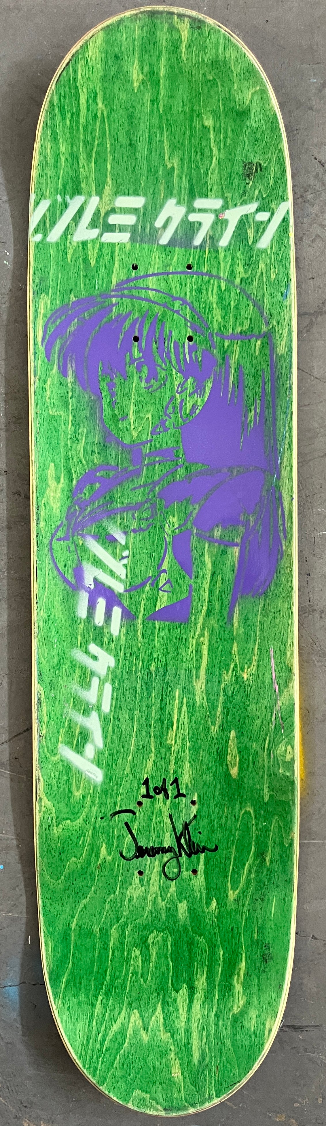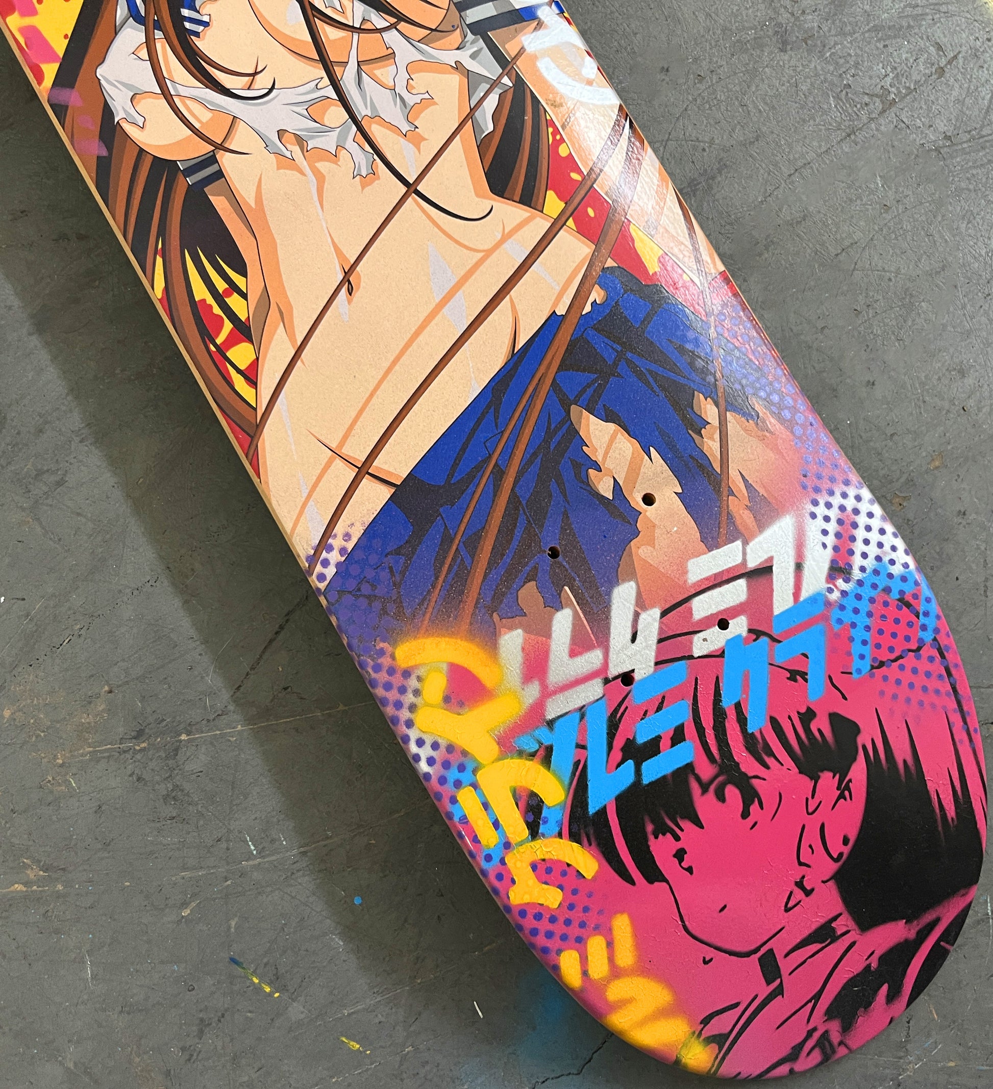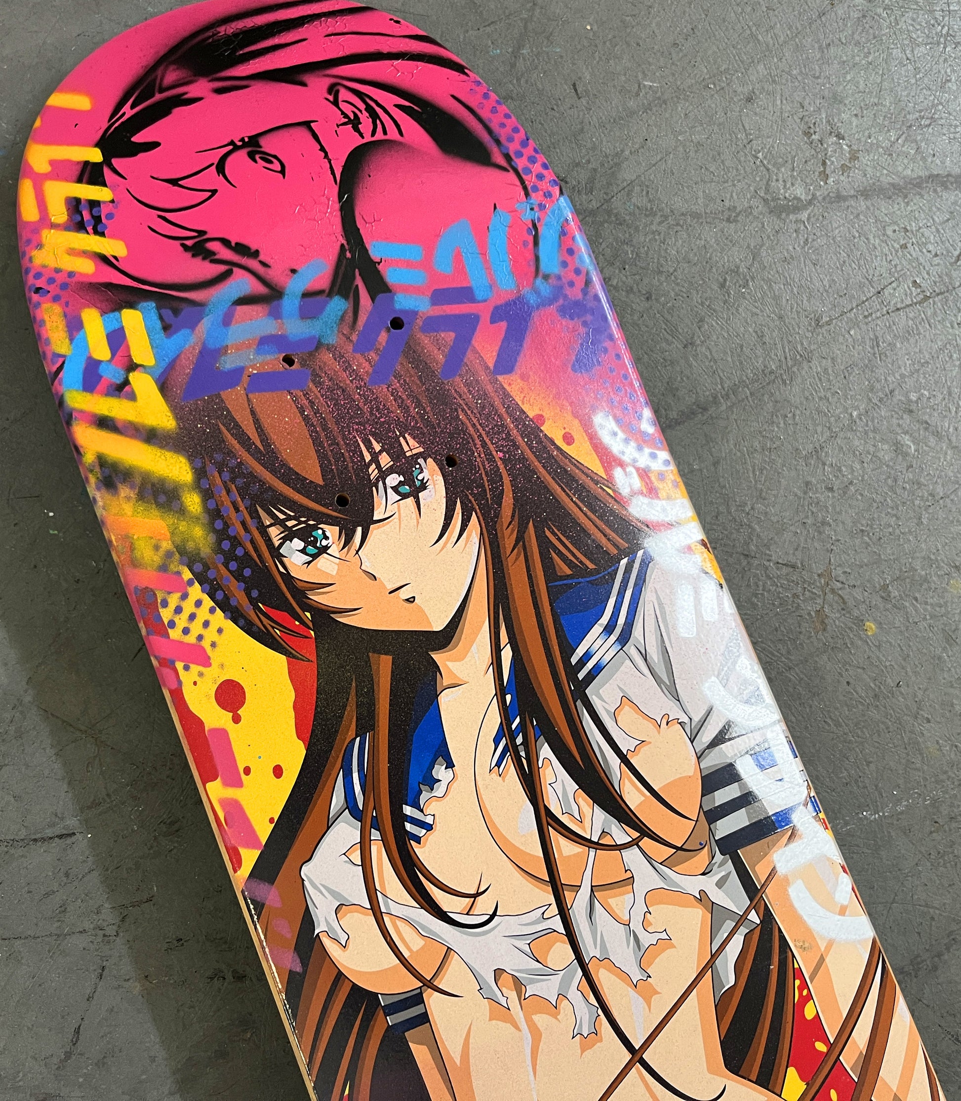 battle school girl 8.0 X 31.75 PINK/PURPLE MIXED PROCESS SIGNED 1 of 1, heat transfer with hand spray paint, and signed on top. 1 of 1