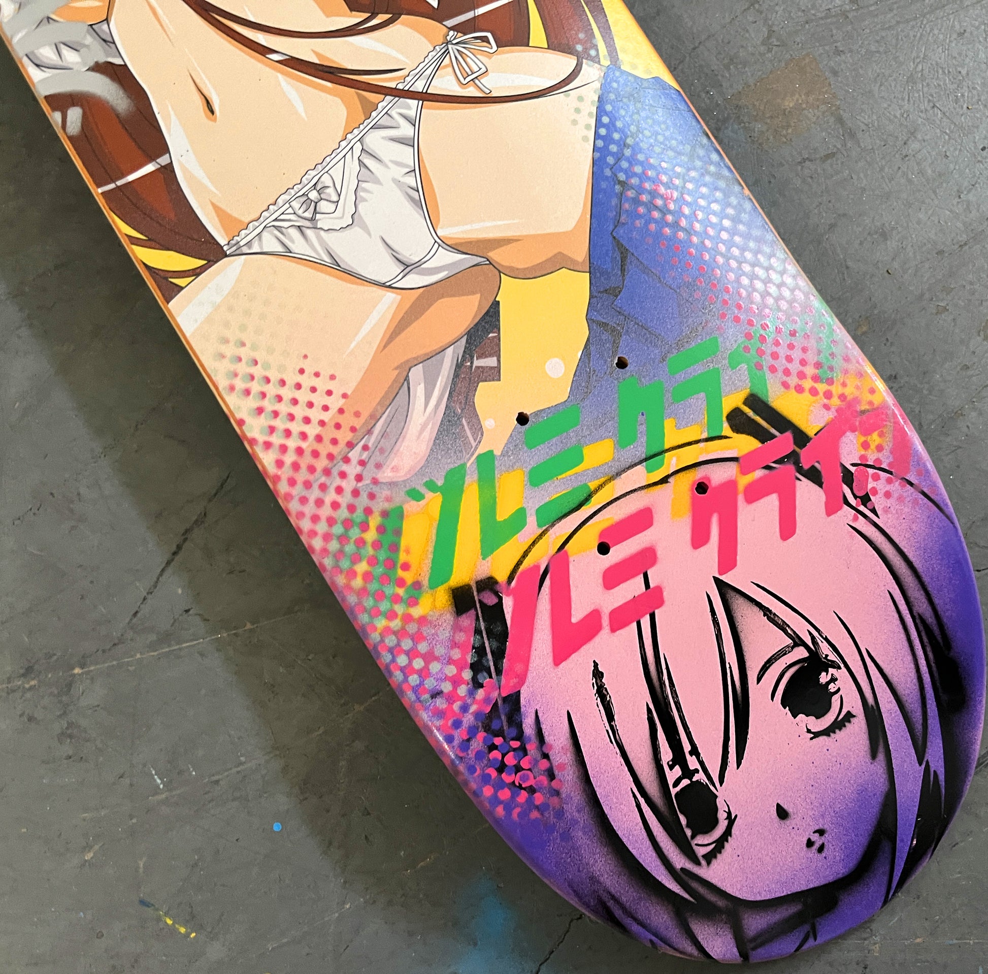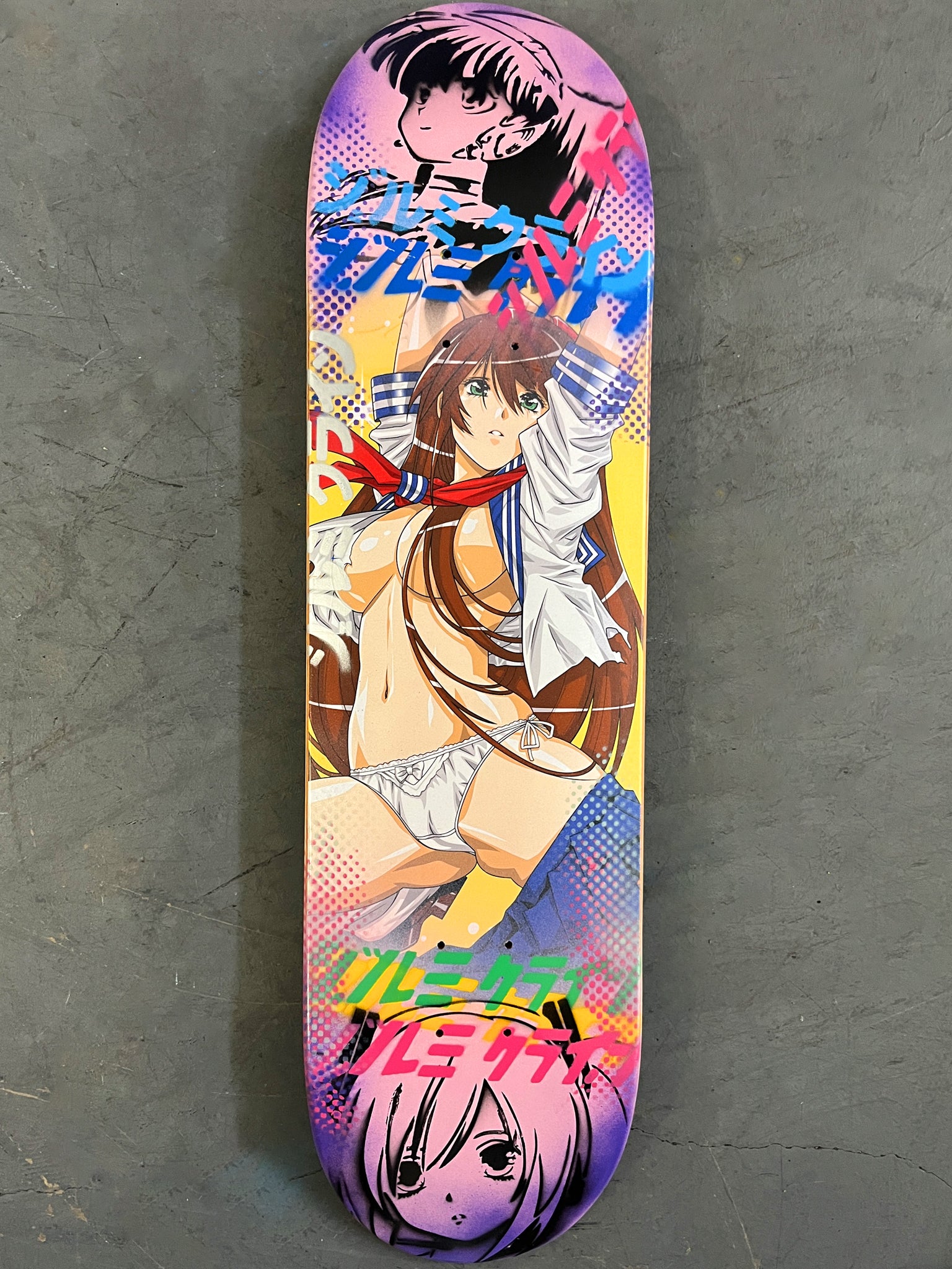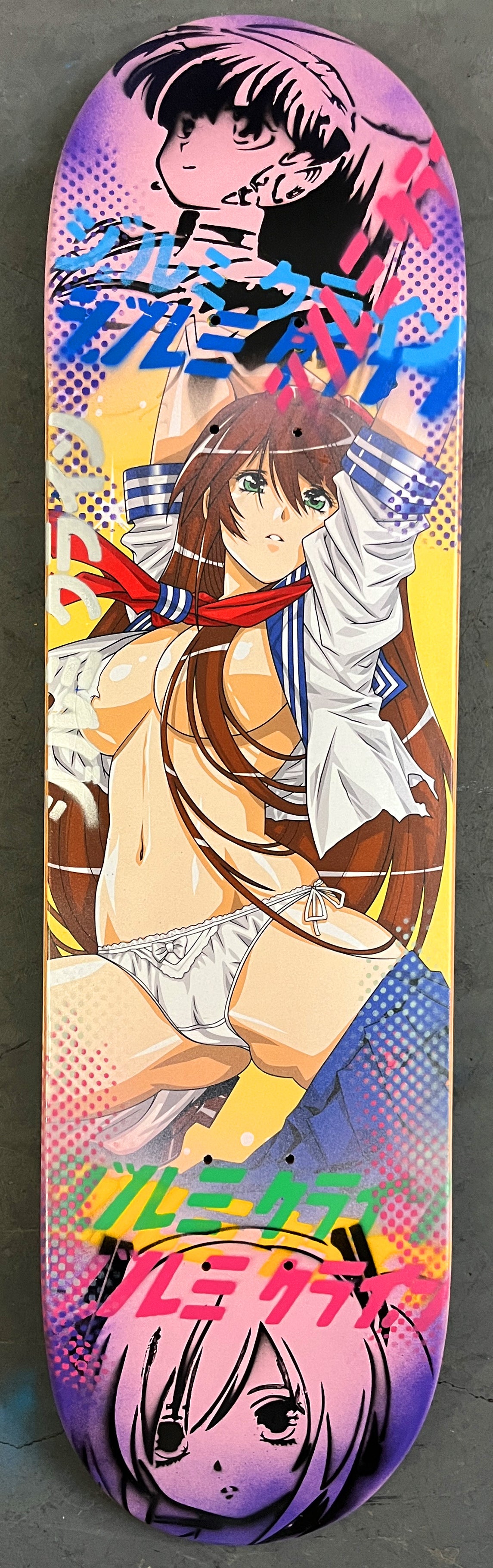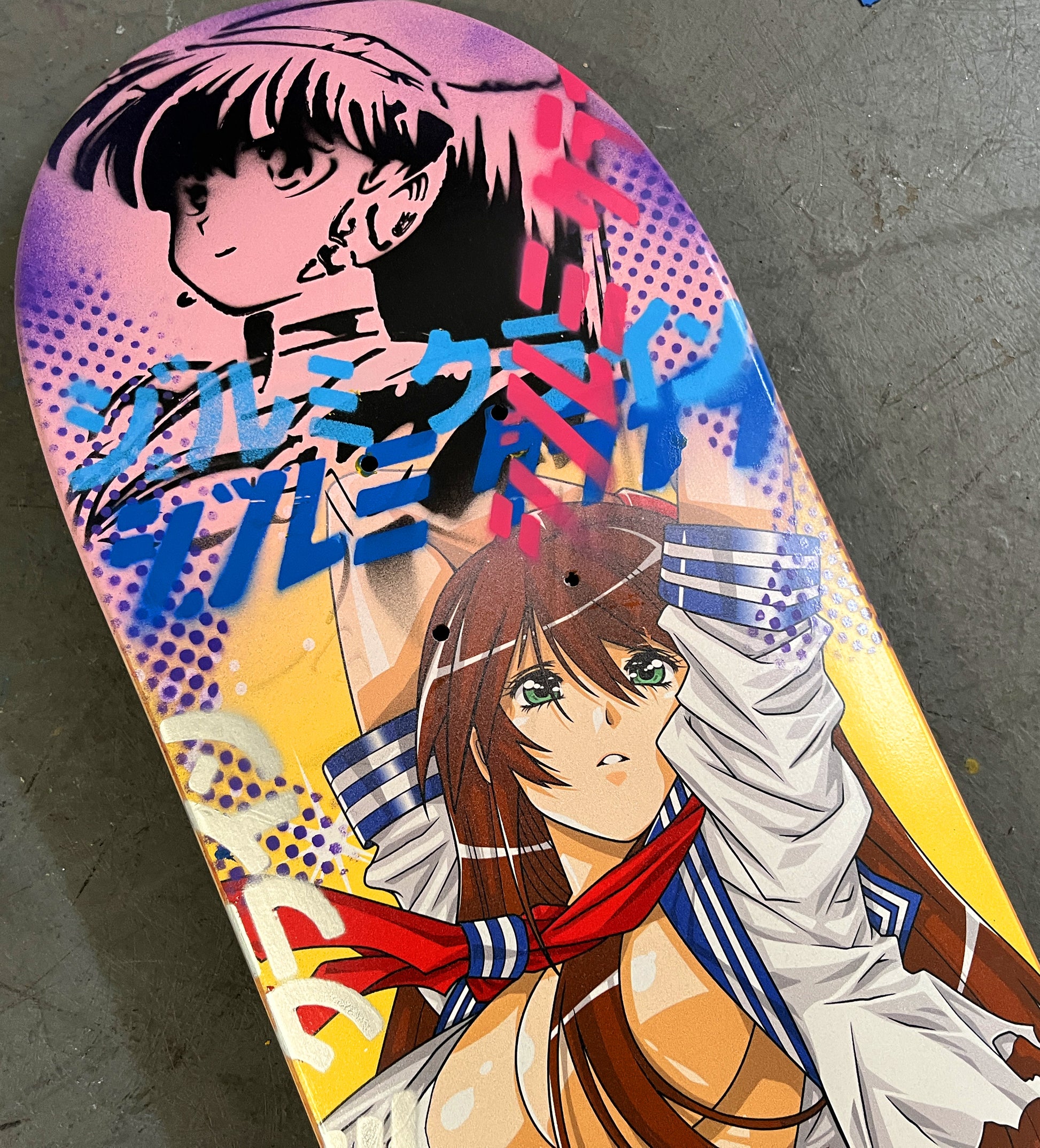 battle school girl II 8.25 X 32.25 PINK MIXED PROCESS SIGNED 1 of 1, heat transfer with hand spray paint, and signed on top. 1 of 1