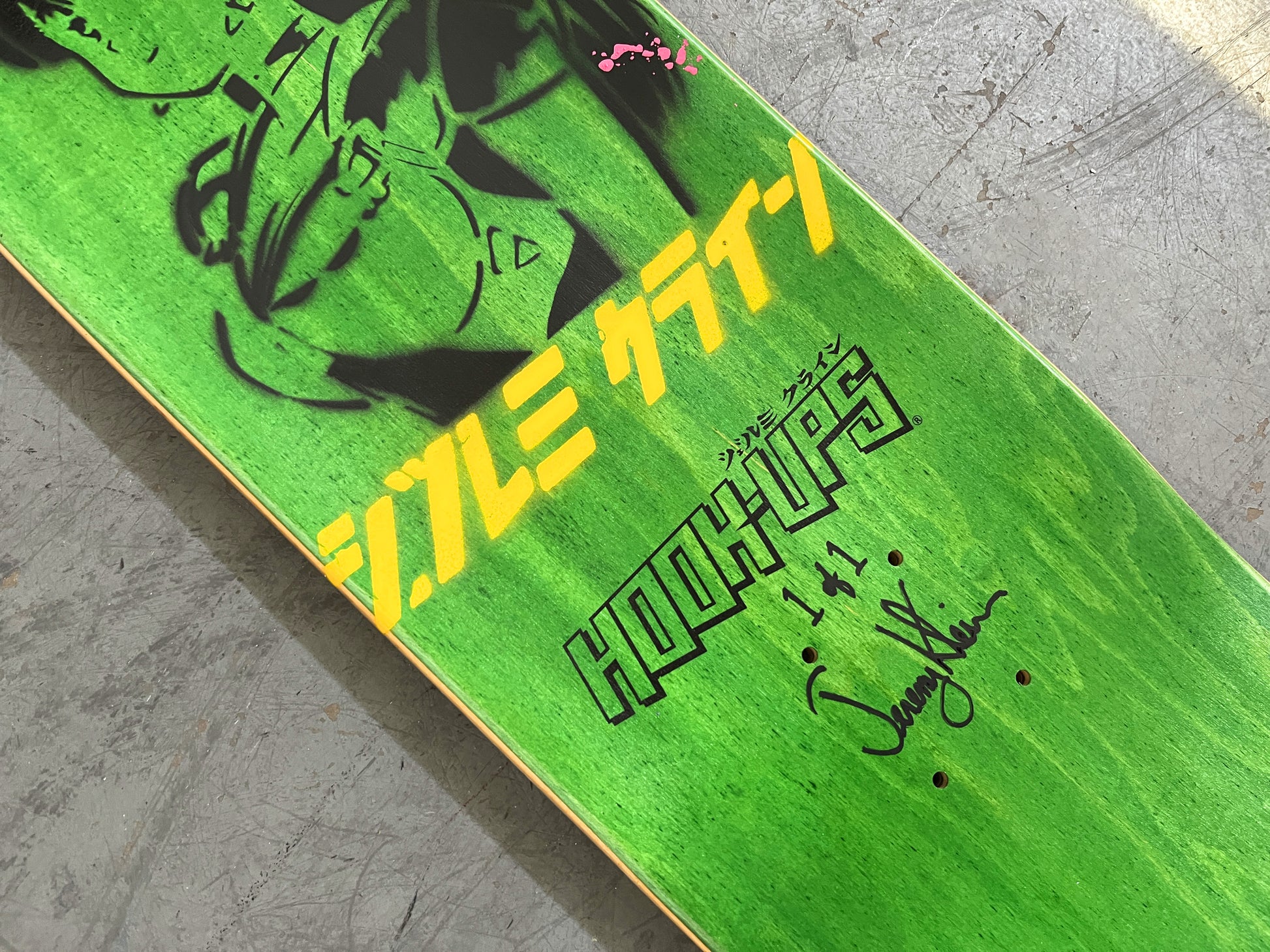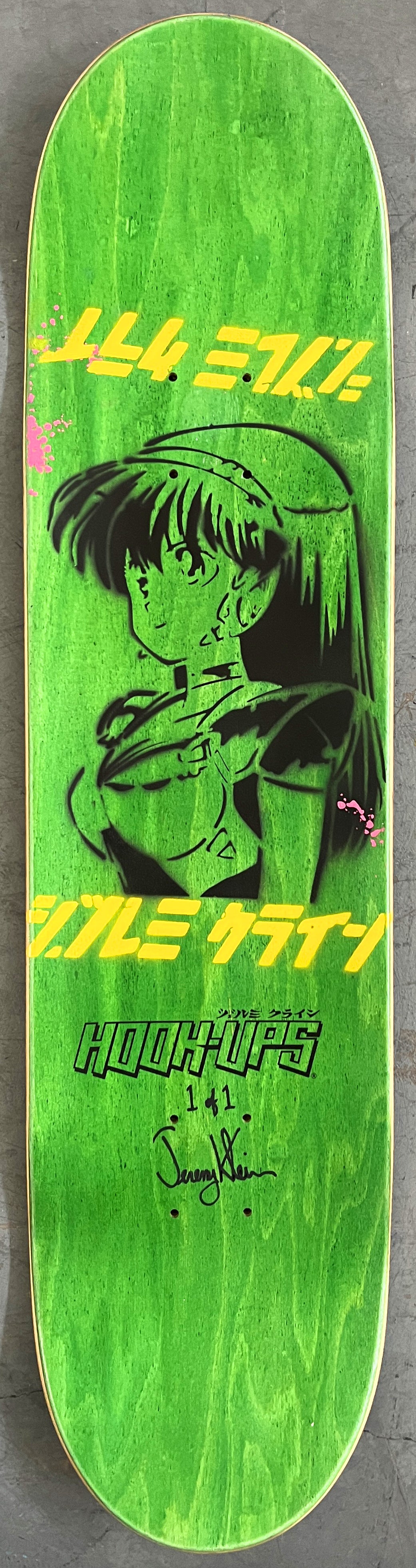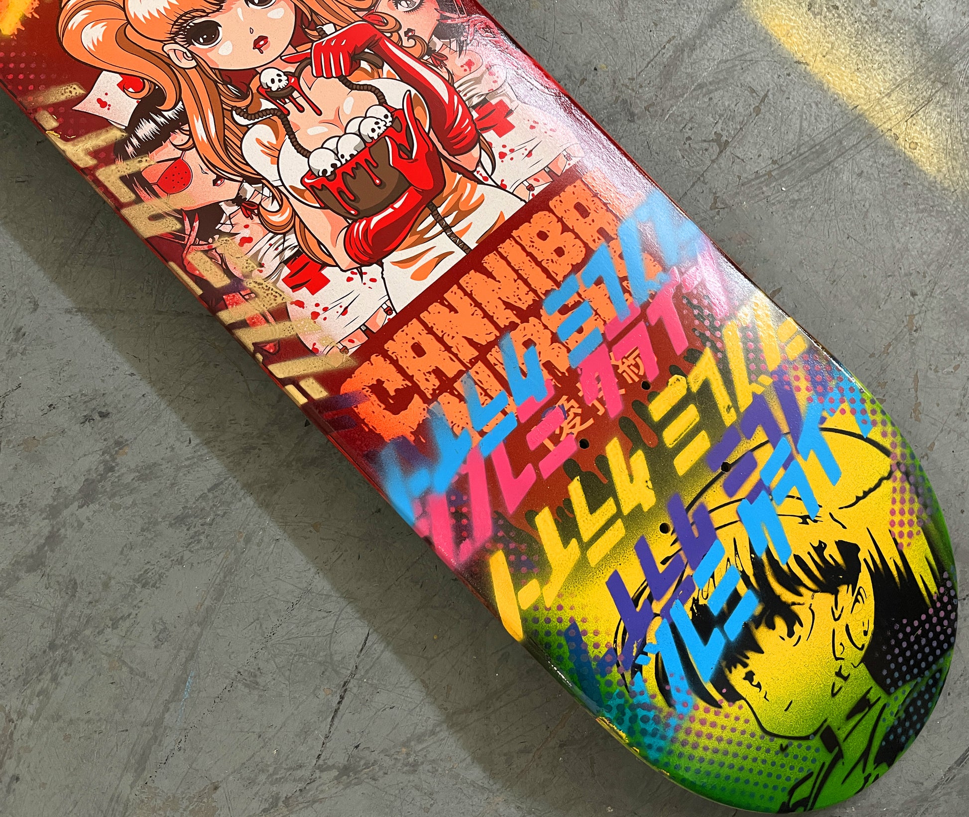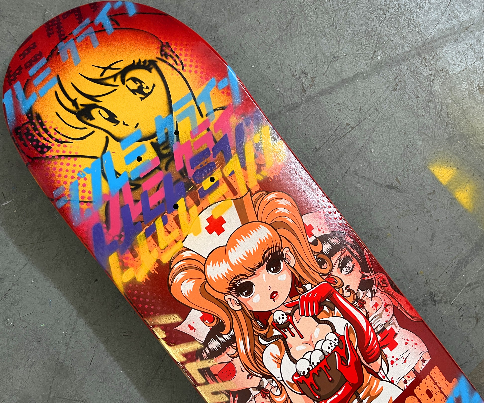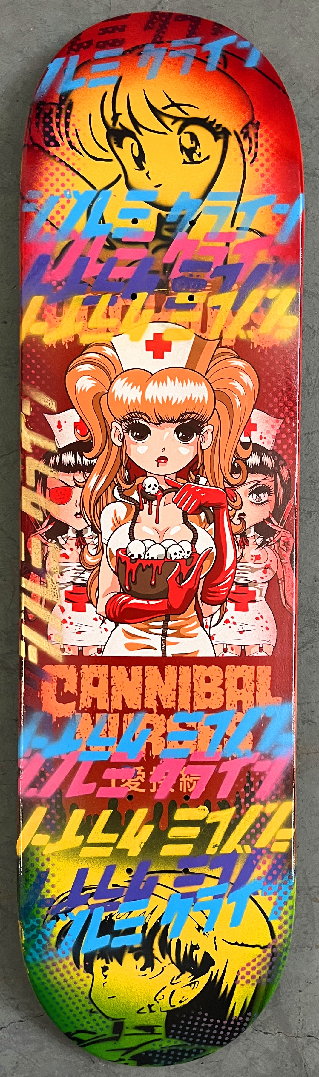 cannibal nurses 8 X 31.75 YELLOW/RED ANODIZED MIXED PROCESS SIGNED 1 of 1, heat transfer with hand spray paint, and signed on top. 1 of 1