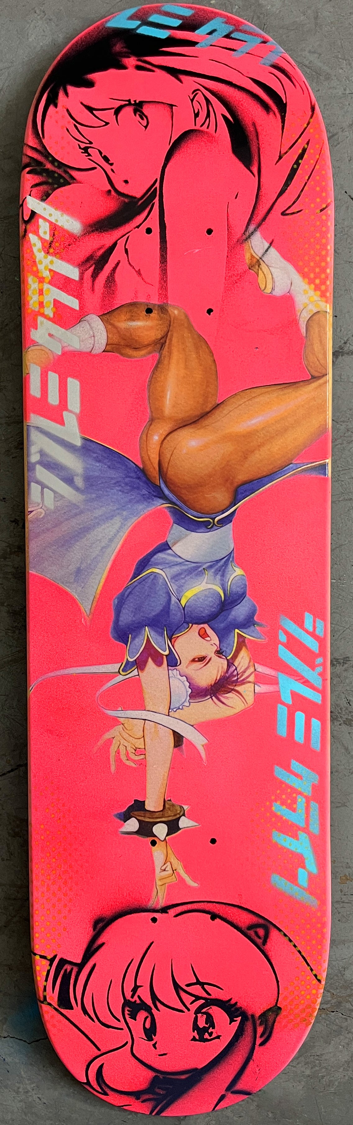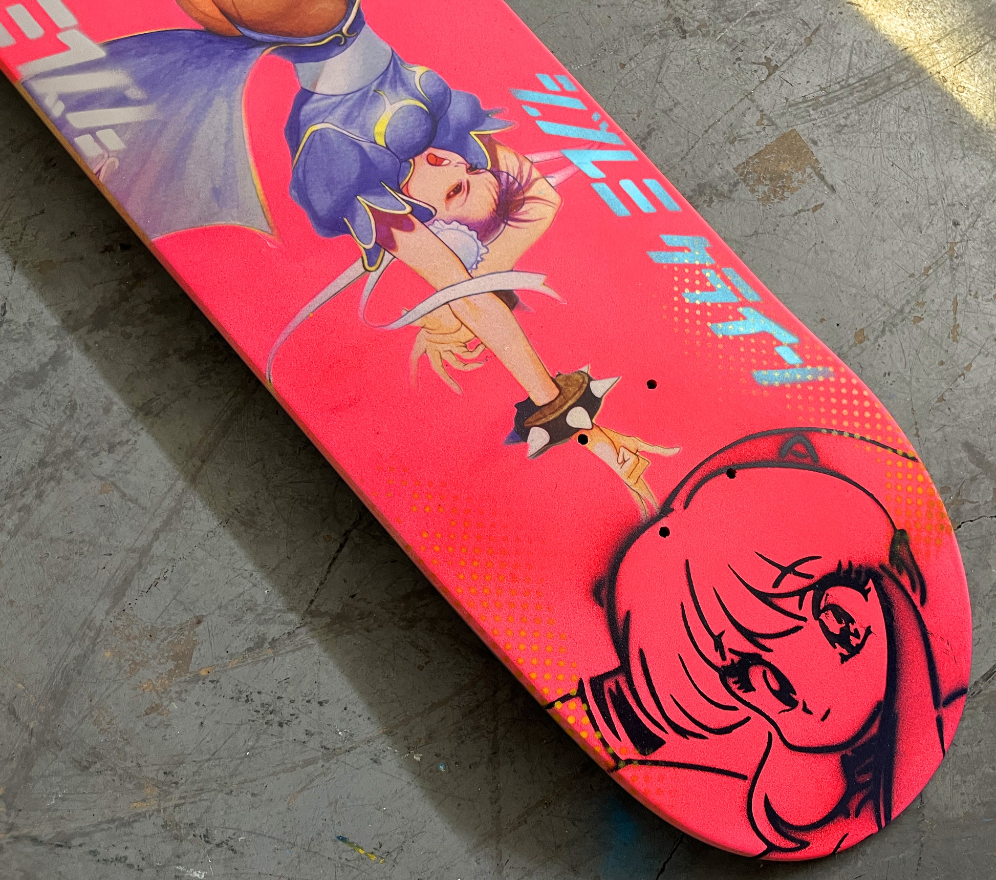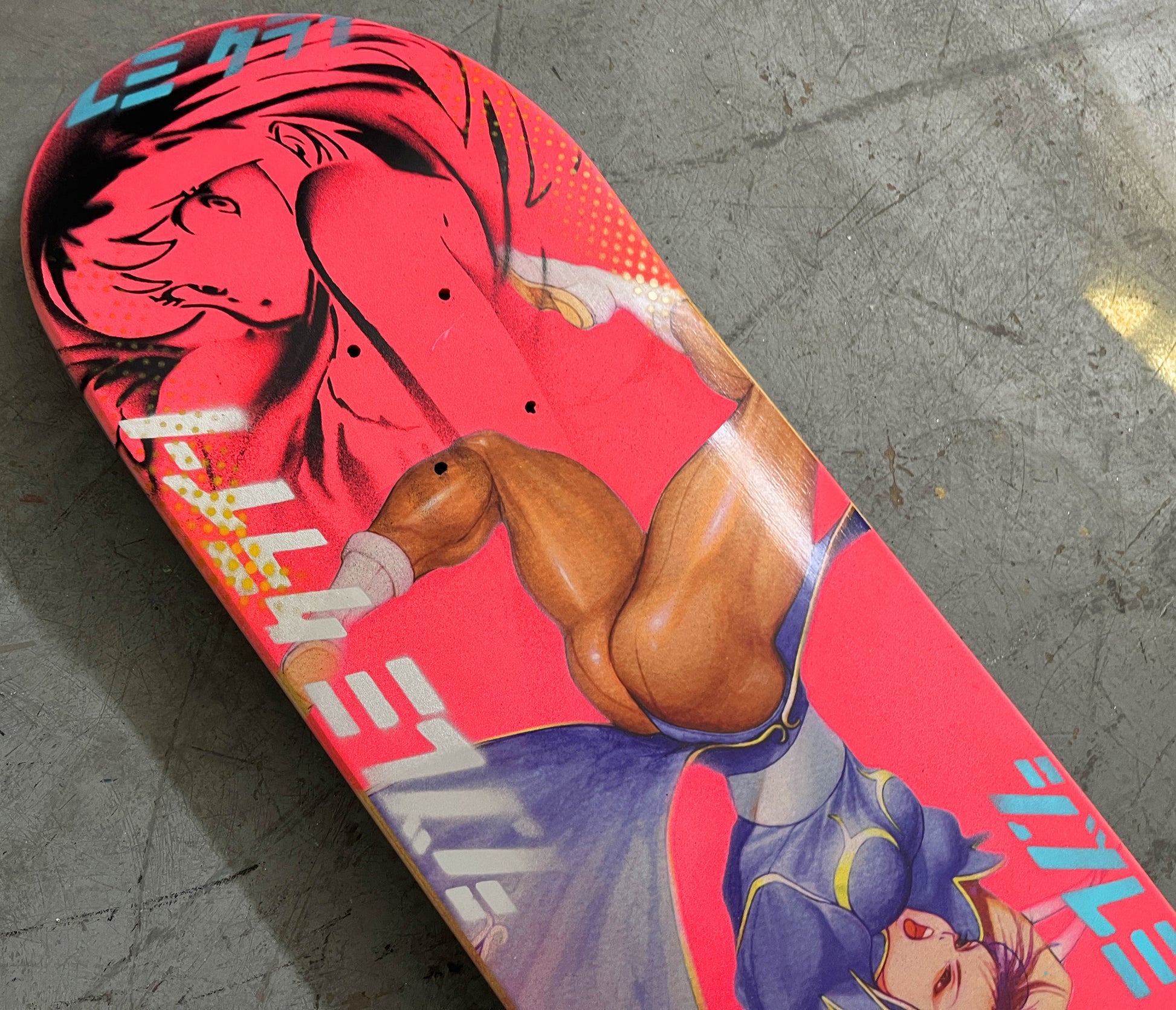 chun li 8.5 X 32.25 FLUORESCENT PINK MIXED PROCESS SIGNED 1 of 1, heat transfer with hand spray paint, and signed on top. 1 of 1
