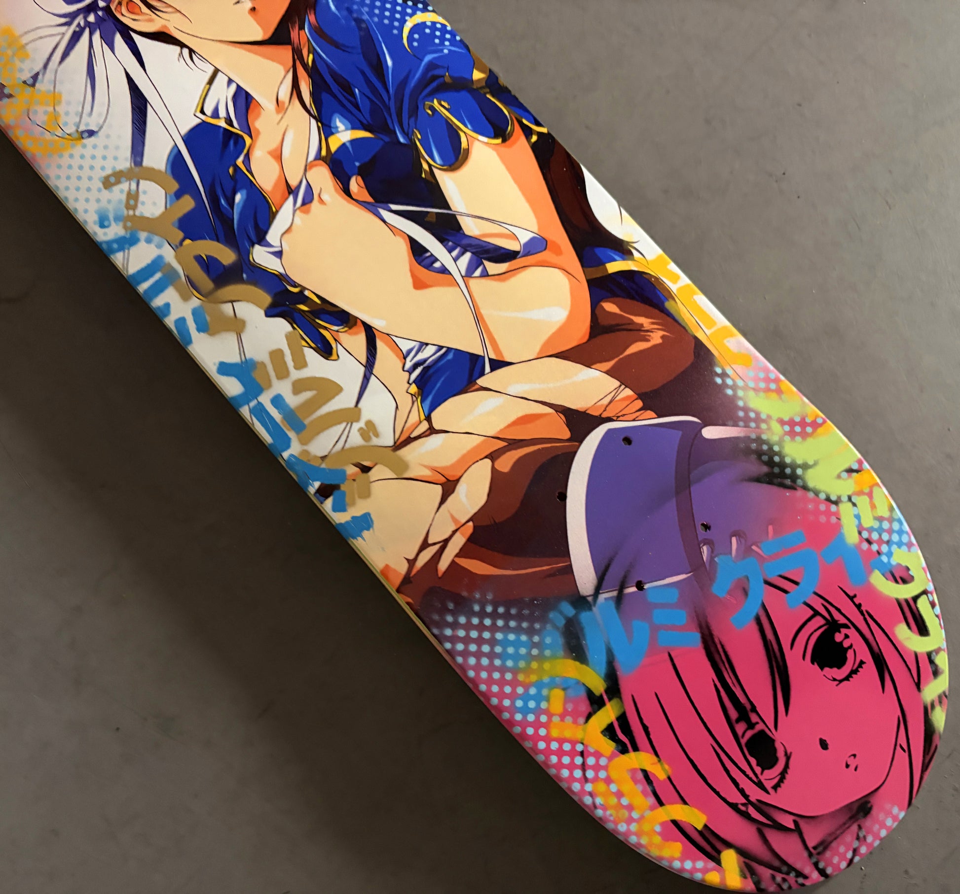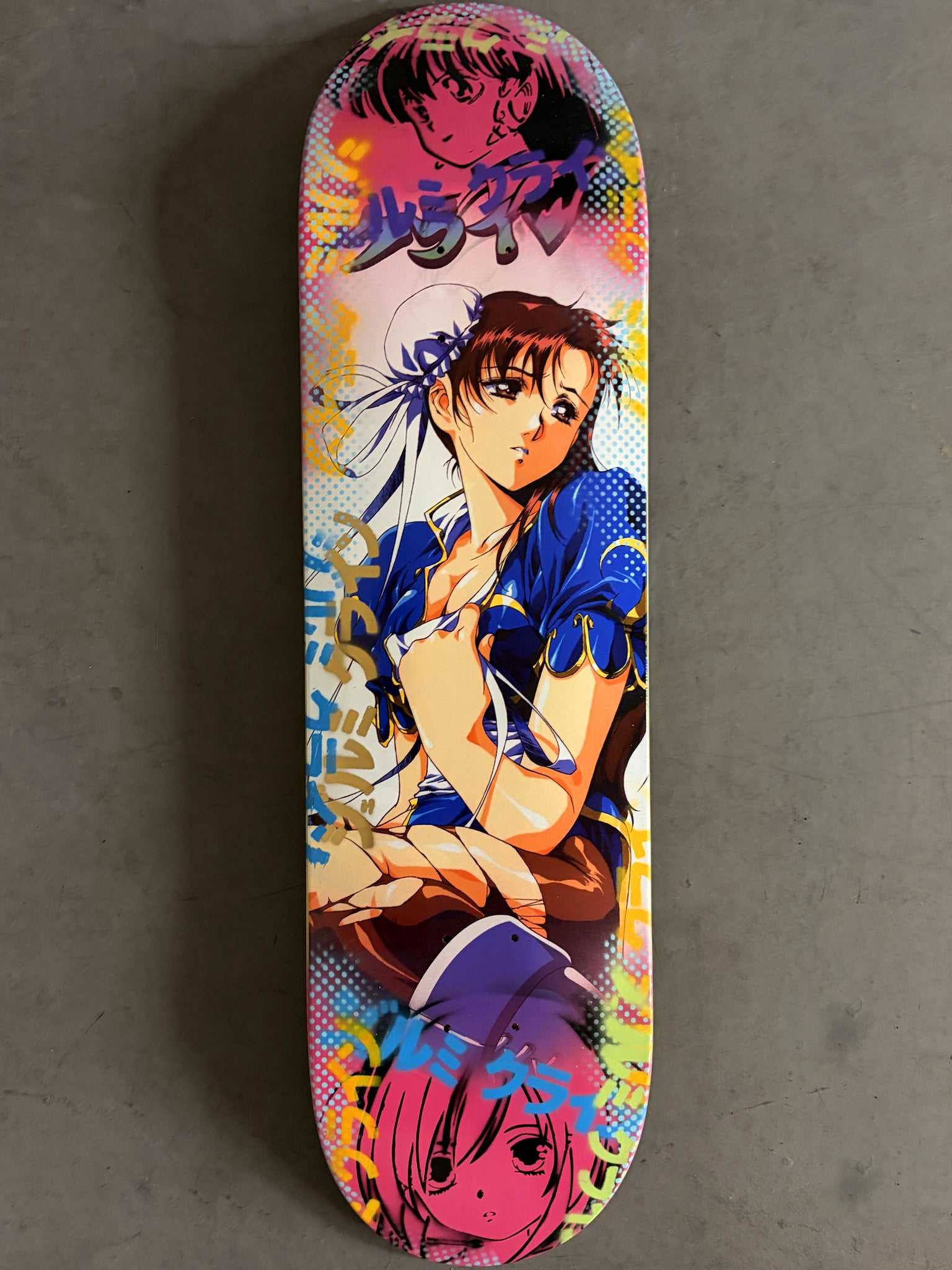chun li 8.5 X 32.25 PEARL WHITE/PINK MIXED PROCESS SIGNED 1 of 1, hand screened with hand spray paint, and signed on top. 1 of 1