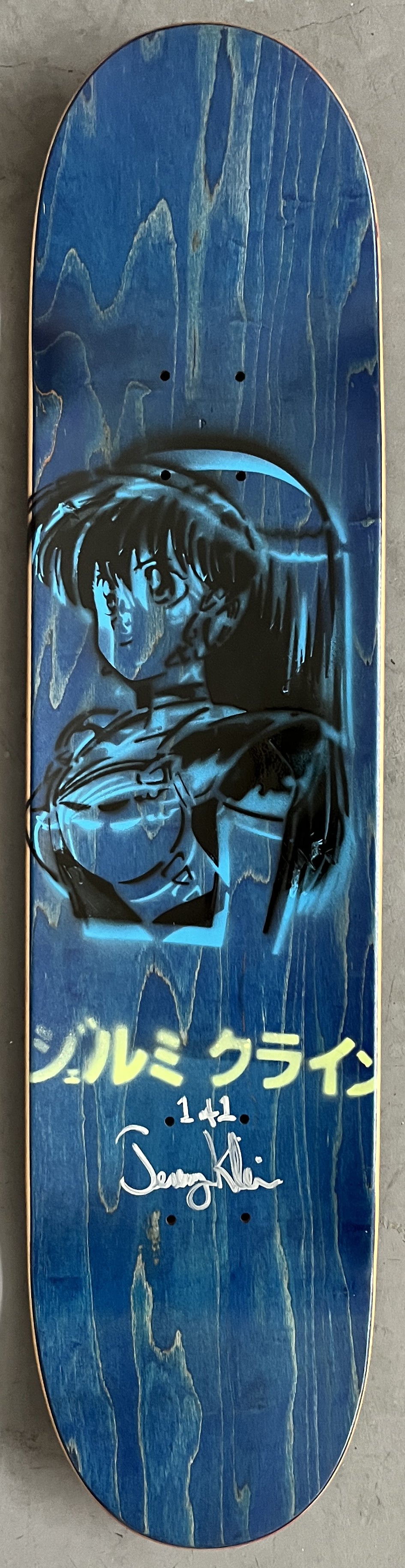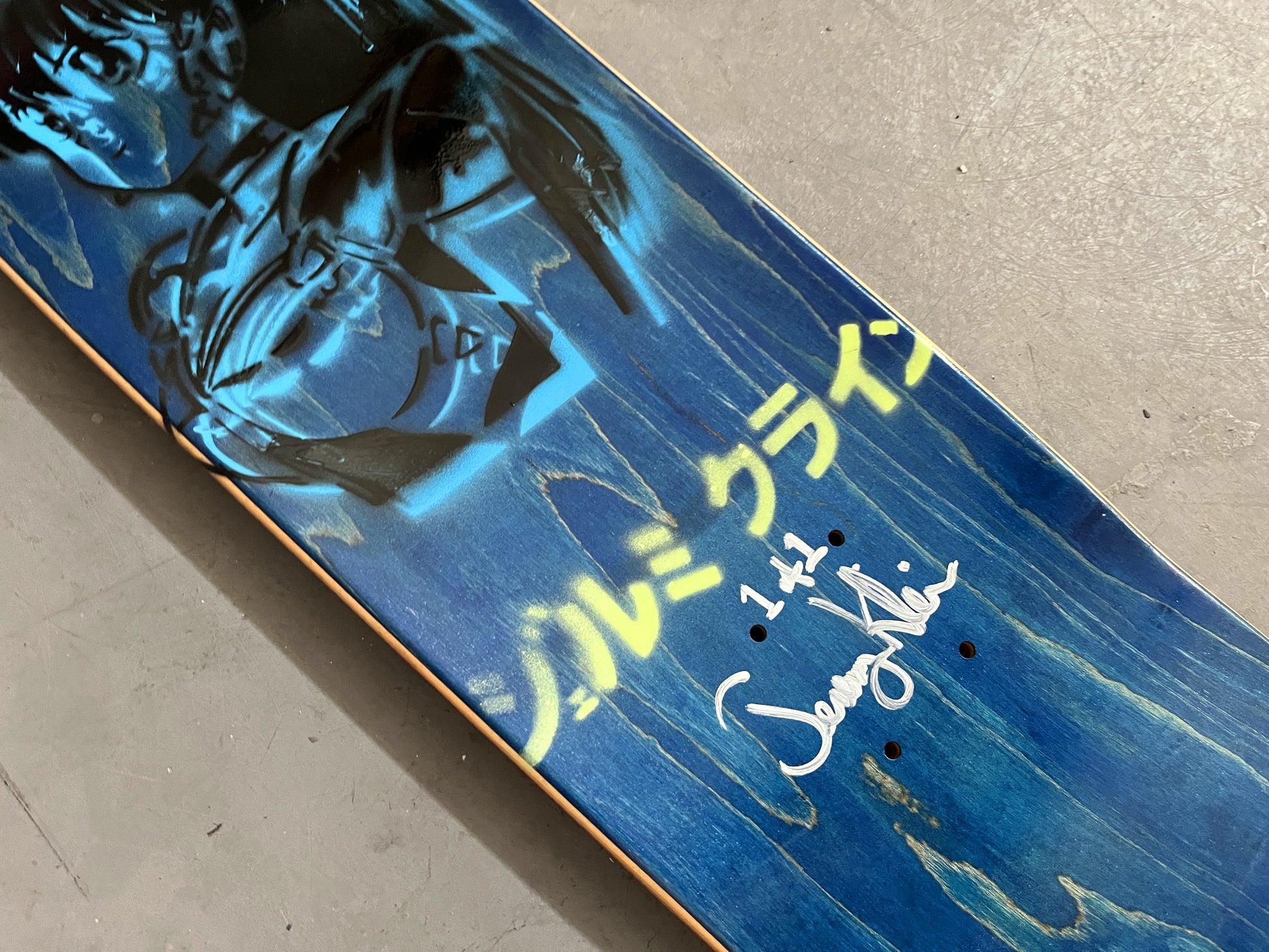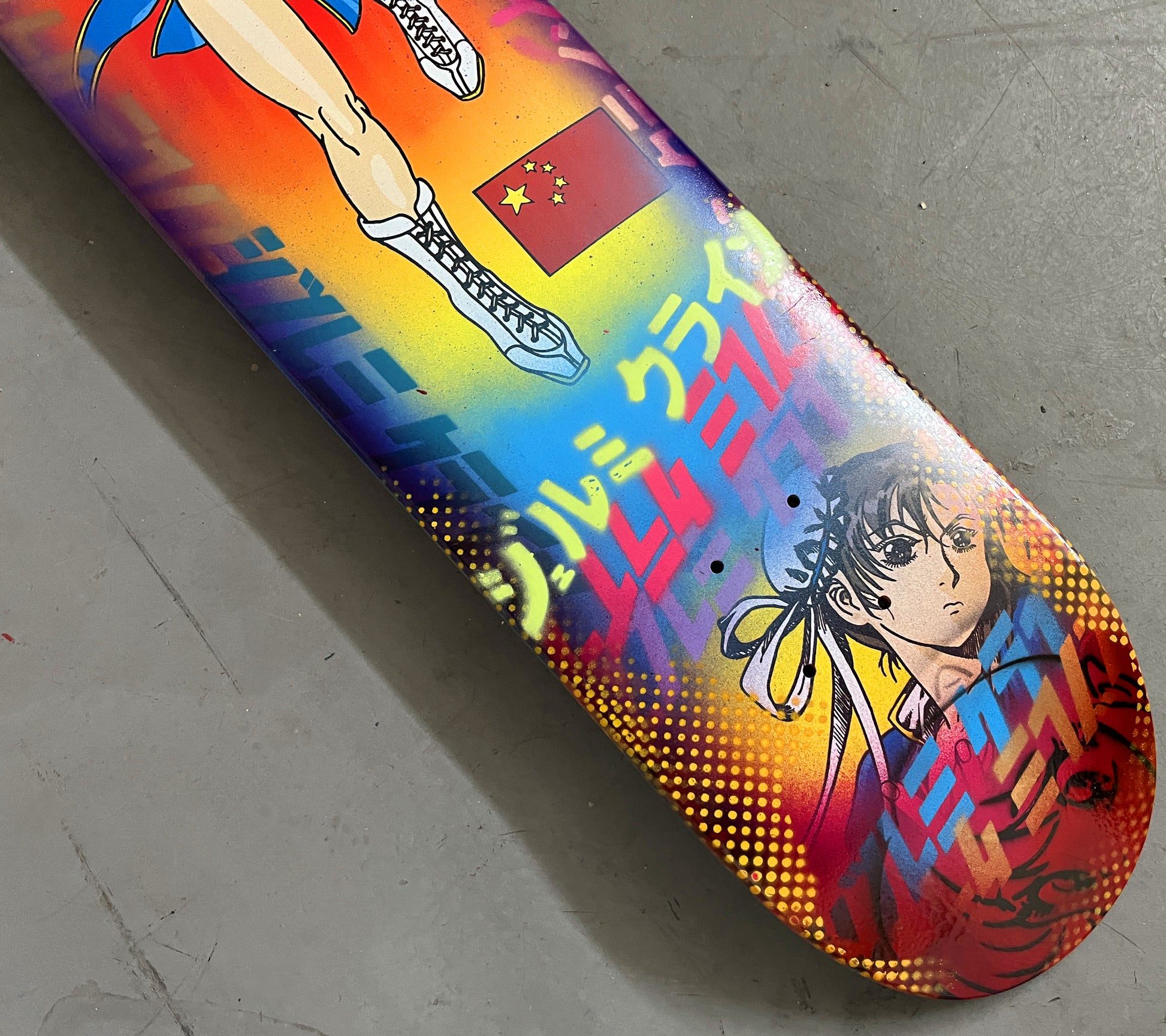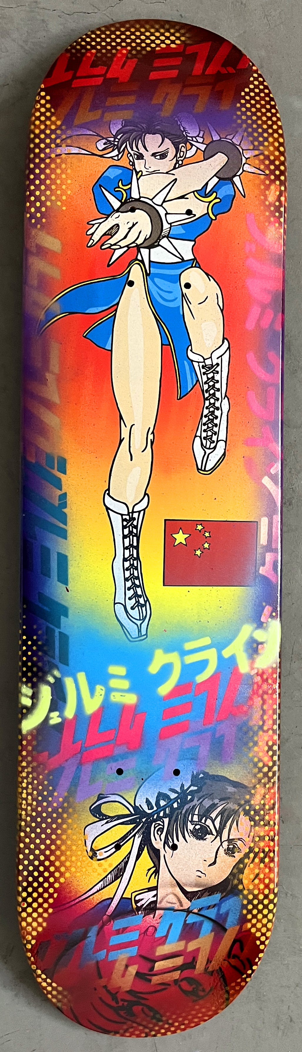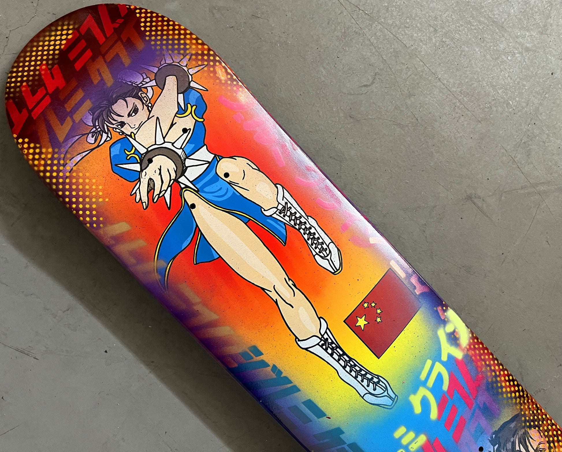 chun li workshop edition 8.0 X 31.75 YELLOW/RED/ORANGE ANODIZED MIXED PROCESS SIGNED 1 of 1, heat transfer with hand spray paint, and signed on top. 1 of 1