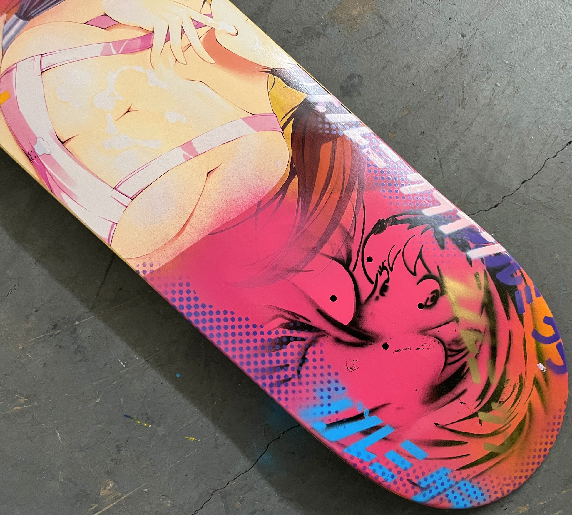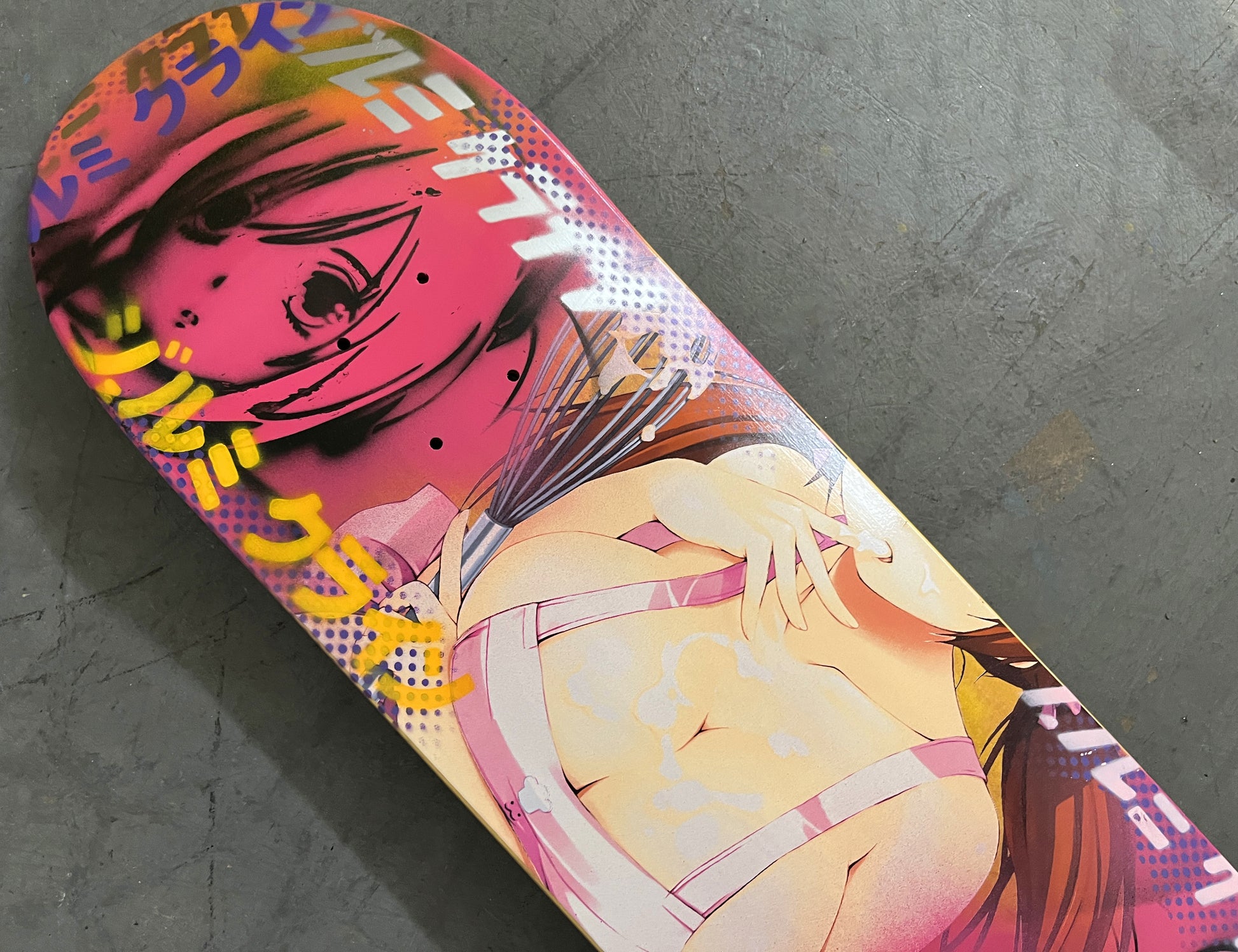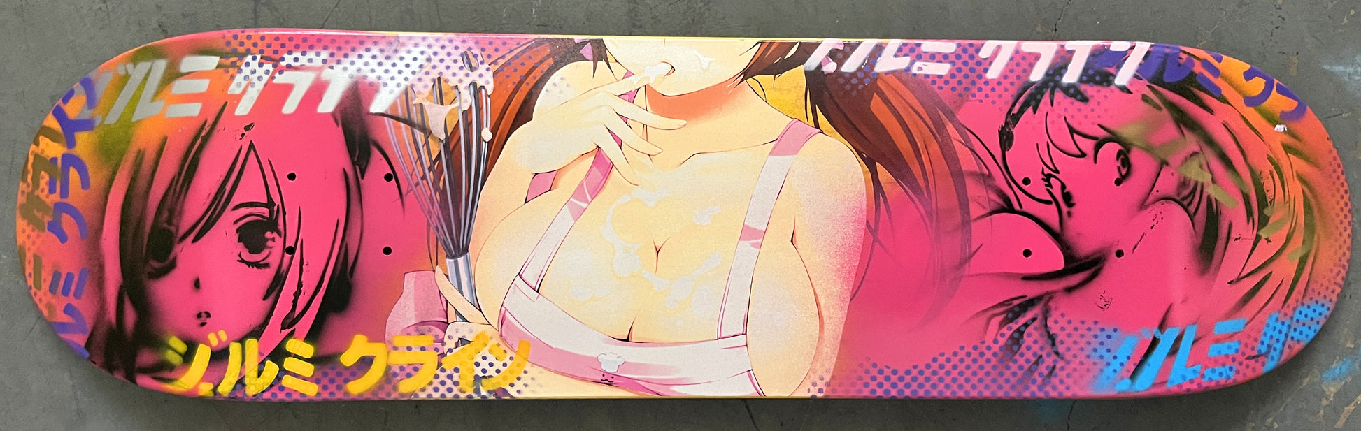 cooking mama 8.25 X 32.25 PINK MIXED PROCESS SIGNED 1 of 1, heat transfer with hand spray paint, and signed on top. 1 of 1