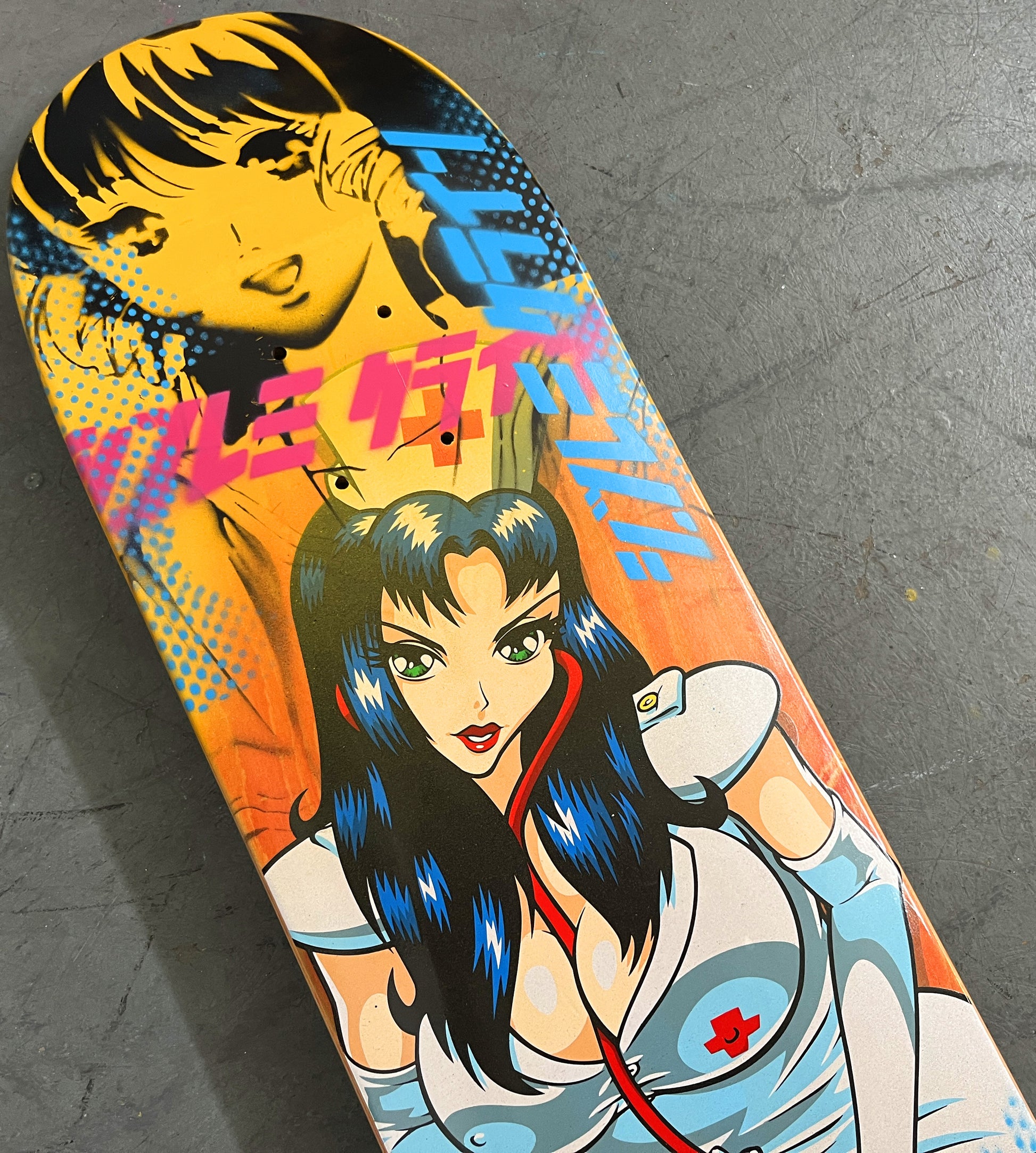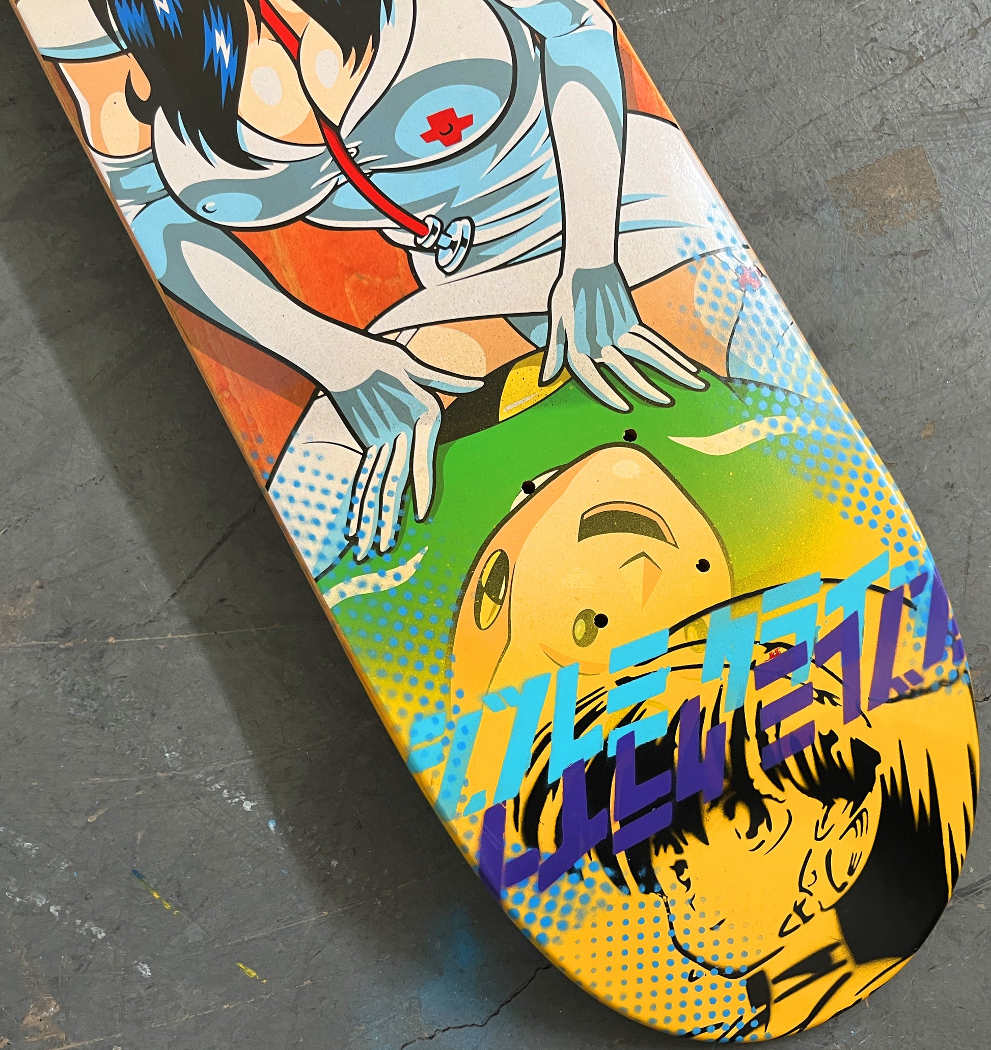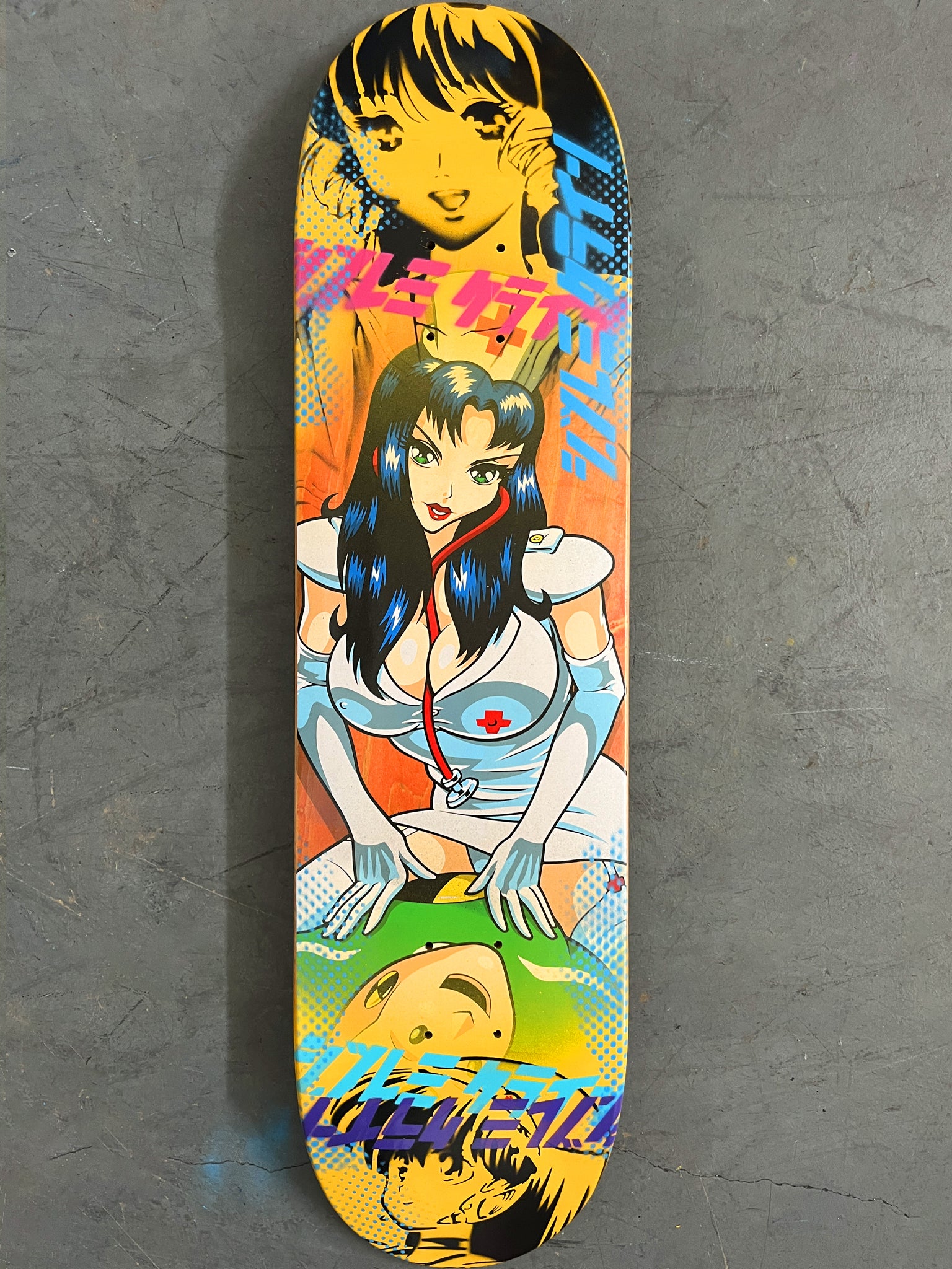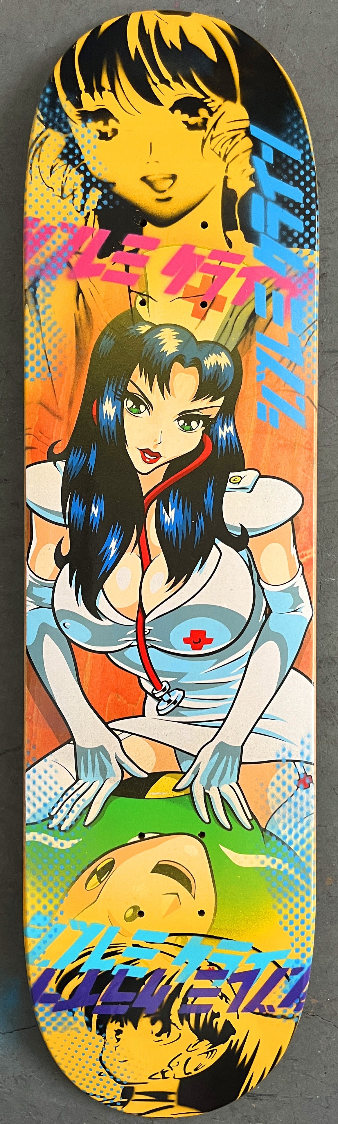 cpr nurse 8.0 X 31.75 YELLOW MIXED PROCESS SIGNED 1 of 1, heat transfer with hand spray paint, and signed on top. 1 of 1