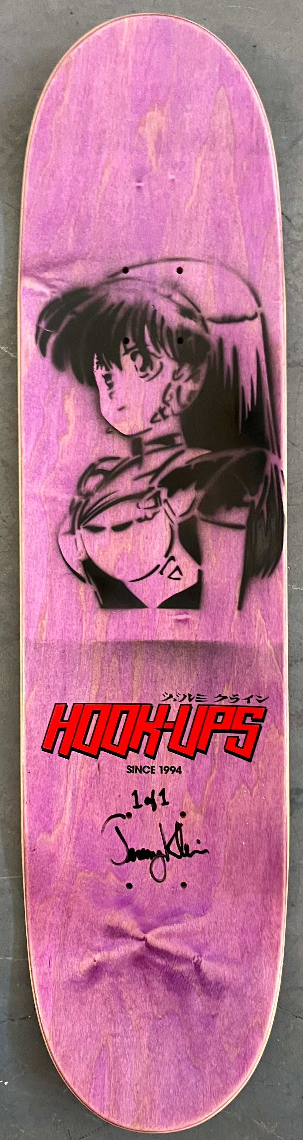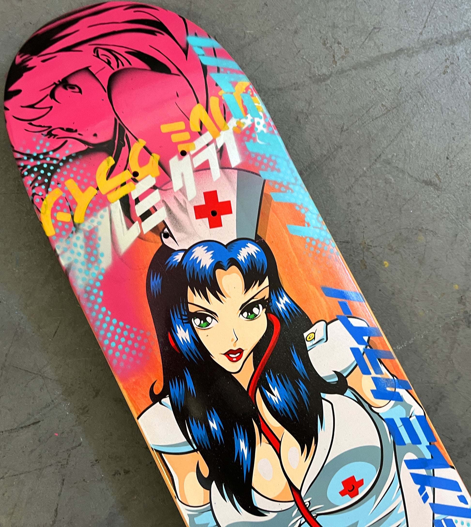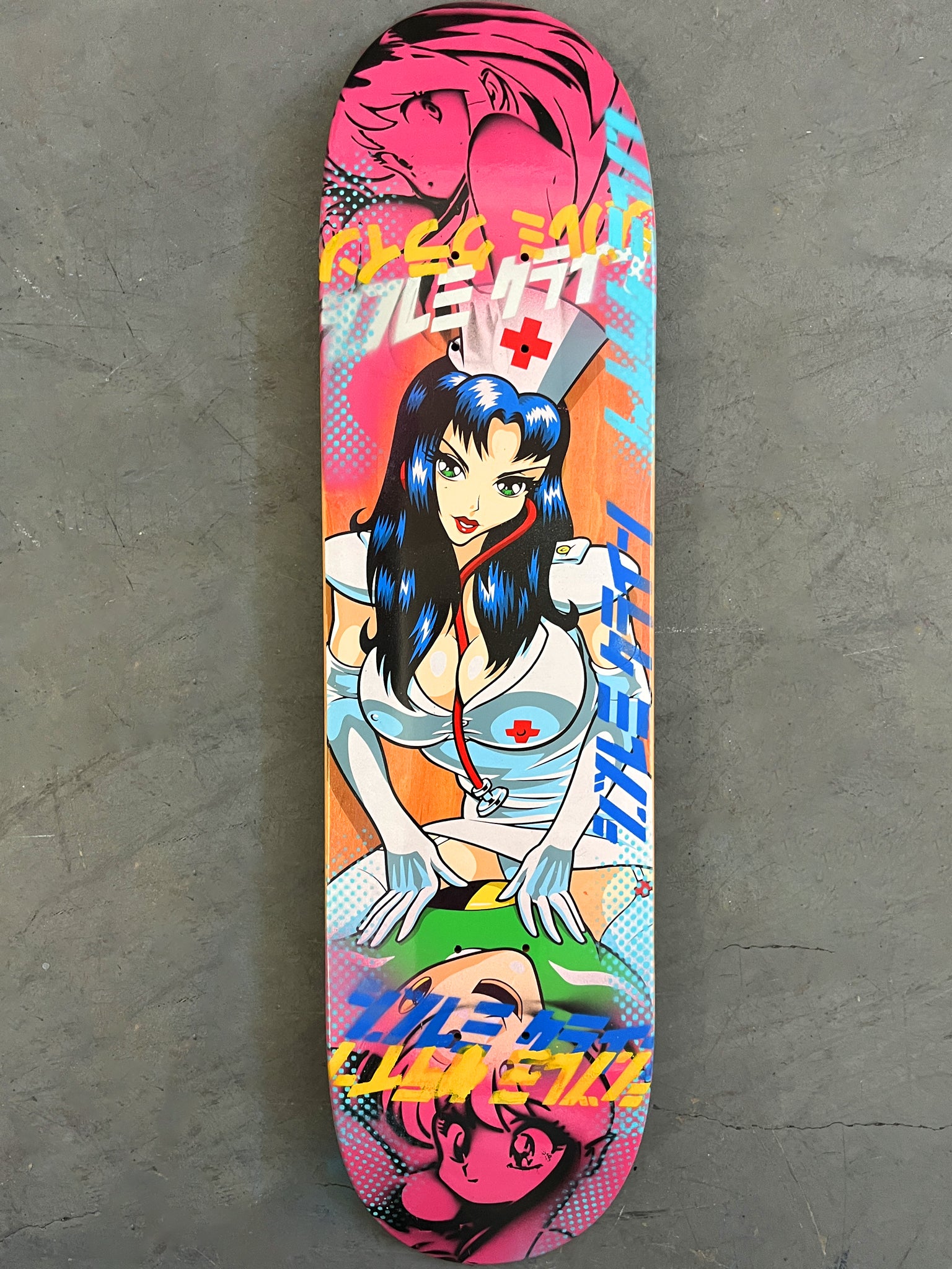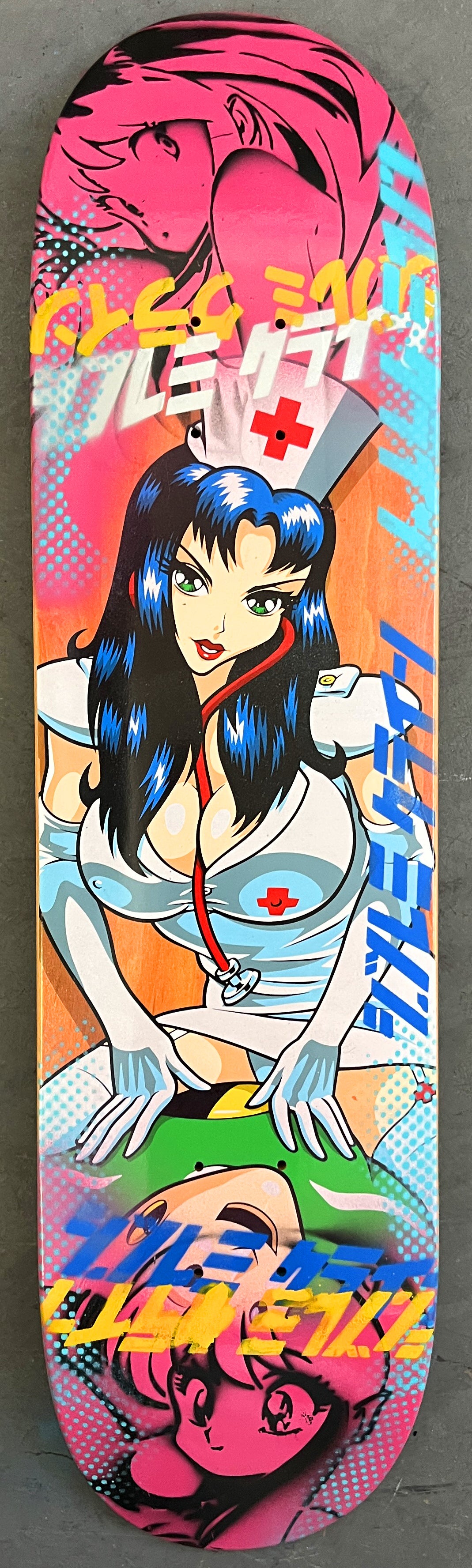 cpr nurse girl 8.0 X 31.75 PINK/ORANGE MIXED PROCESS SIGNED 1 of 1, heat transfer with hand spray paint, and signed on top. 1 of 1