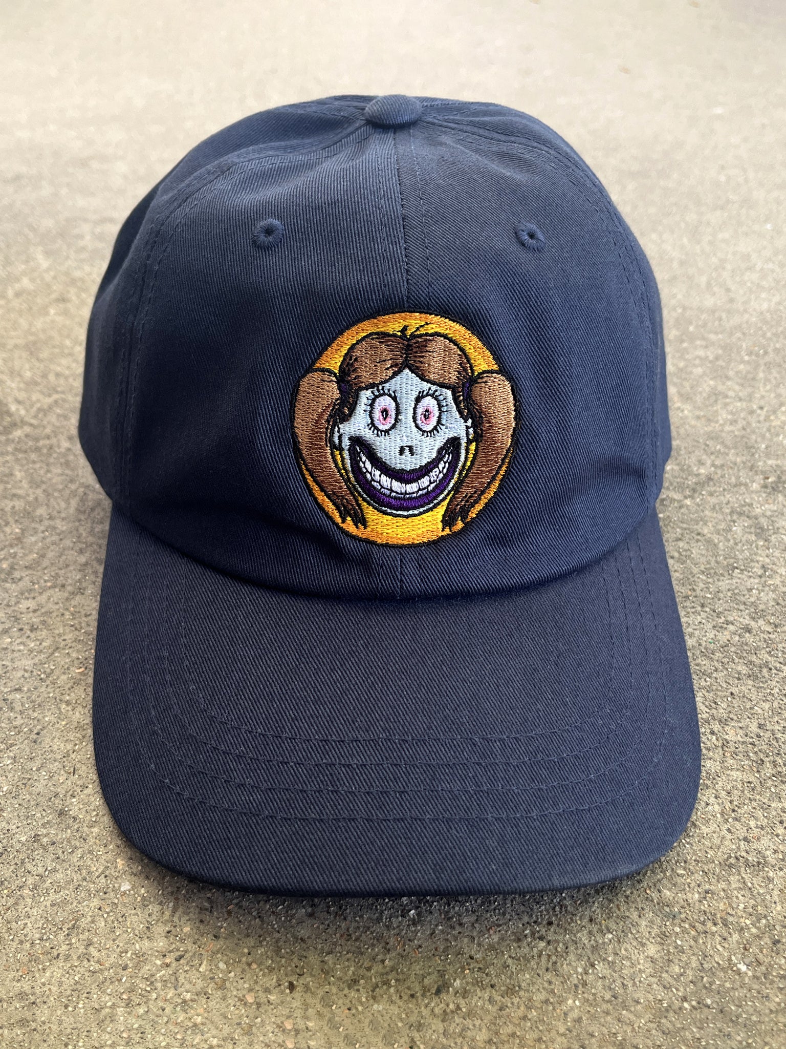 demon child unstructured hat NAVY. 14,500 stitches on front