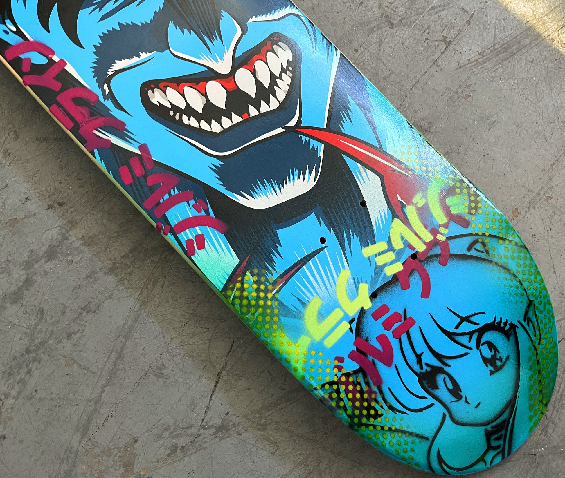 demon hunter 7.88 X 31.75 BLUE/AQUA MIXED PROCESS SIGNED 1 of 1, heat transfer with hand spray paint, and signed on top. 1 of 1