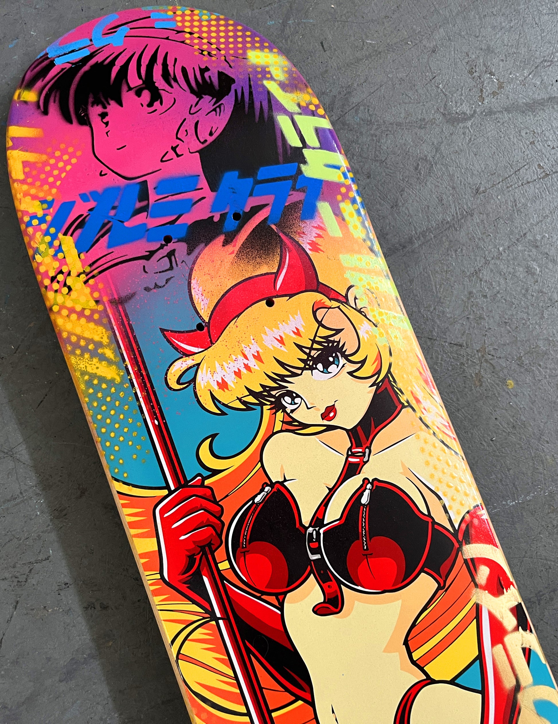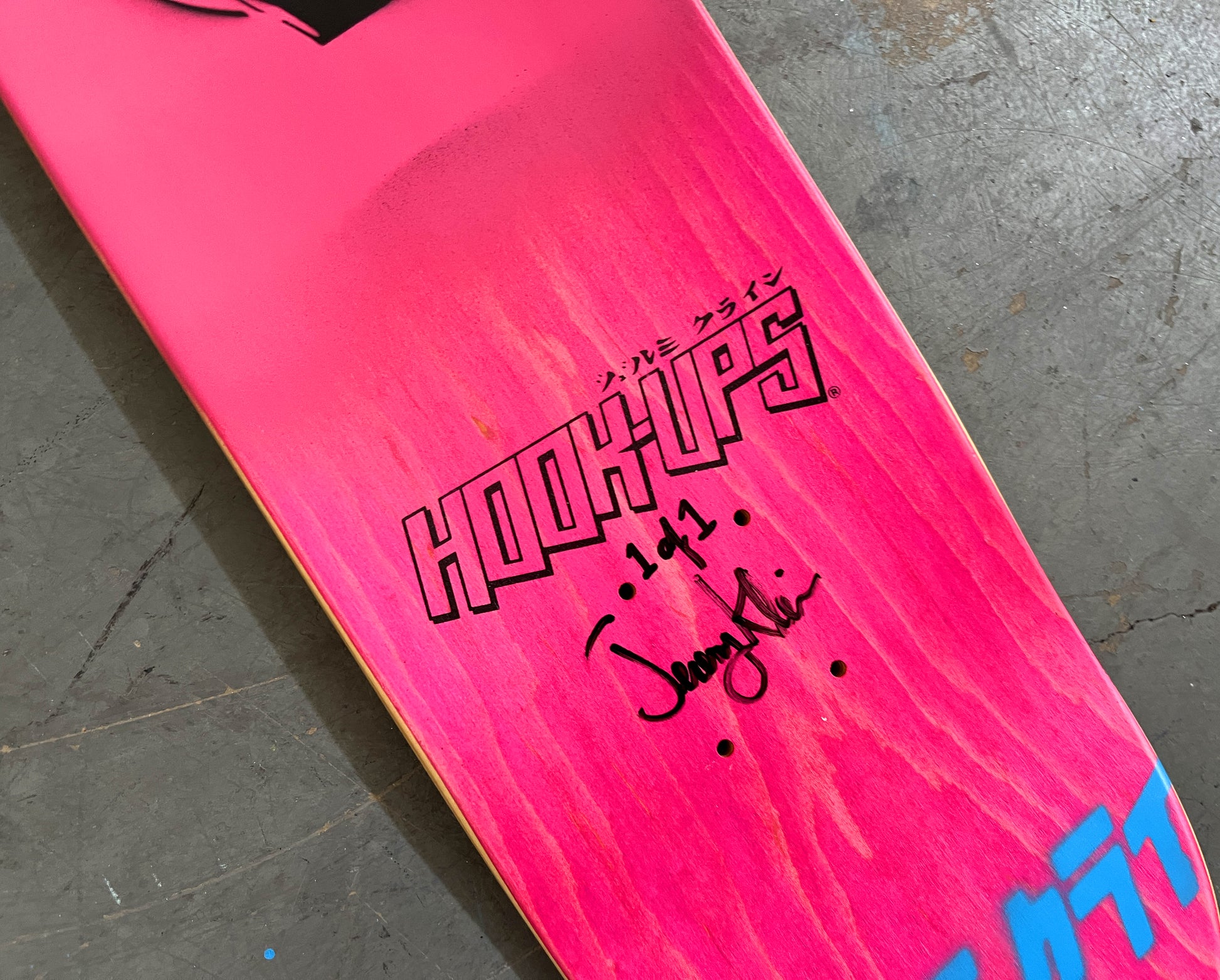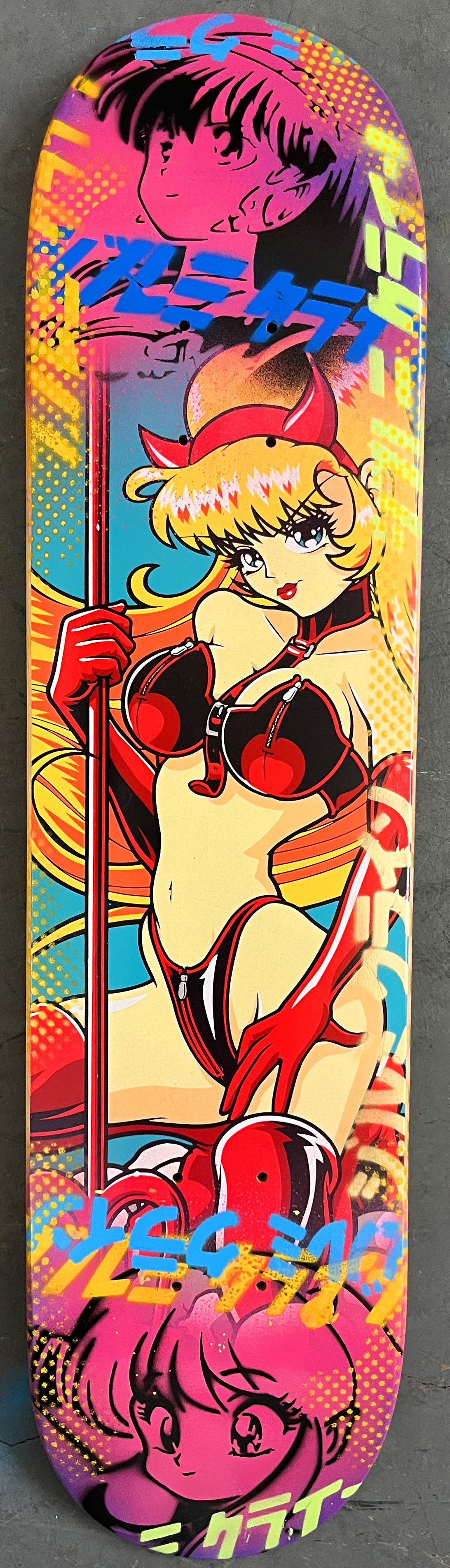 devil maiden 7.75 X 31.75 PINK/PURPLE MIXED PROCESS SIGNED 1 of 1, heat transfer with hand spray paint, and signed on top. 1 of 1