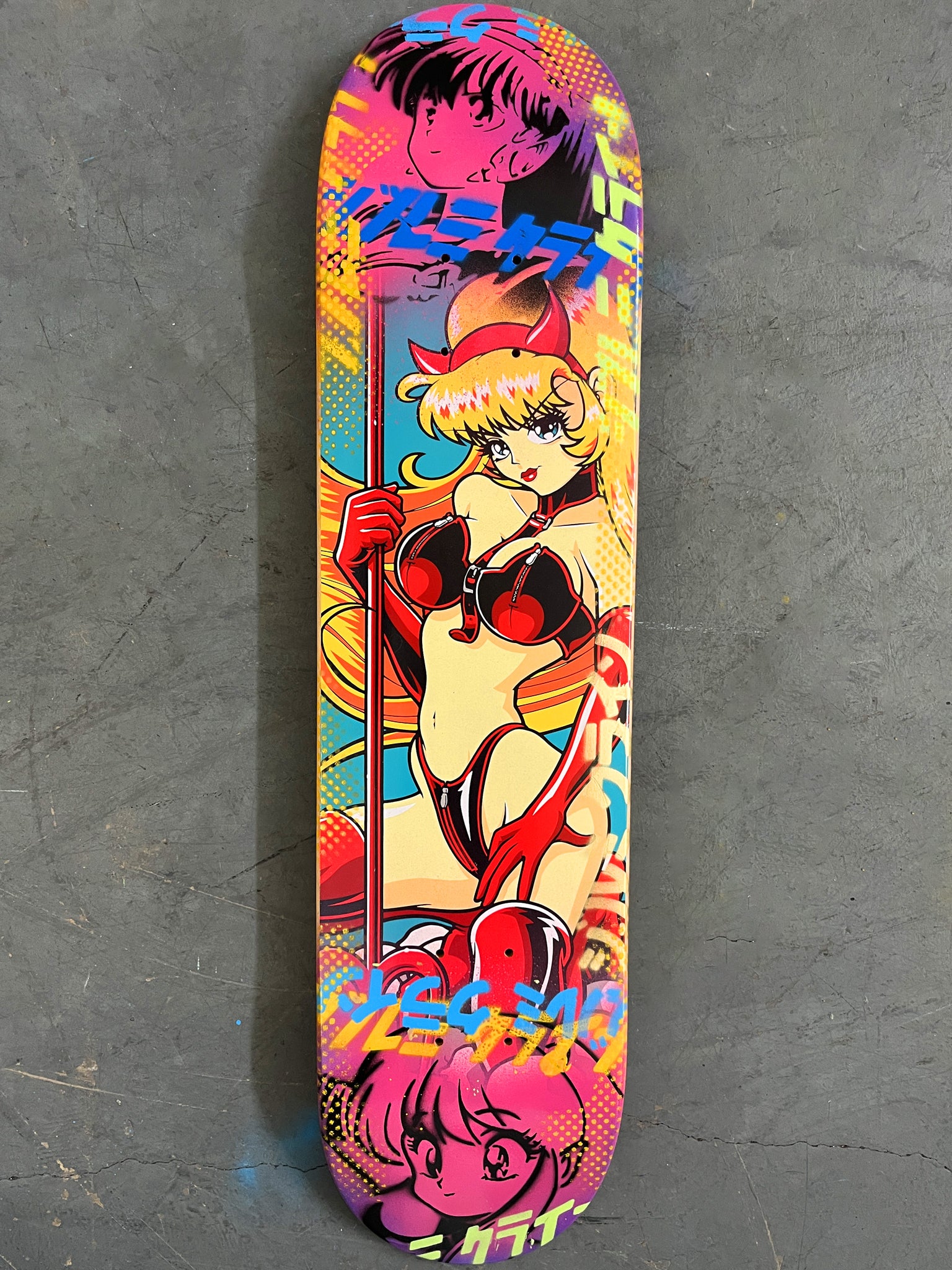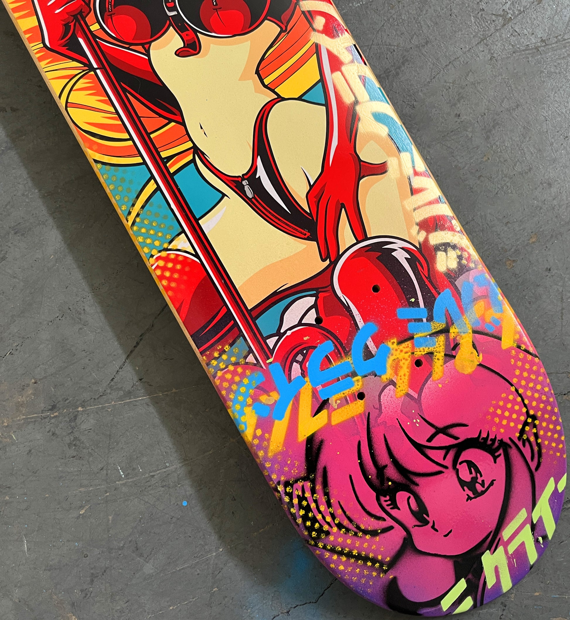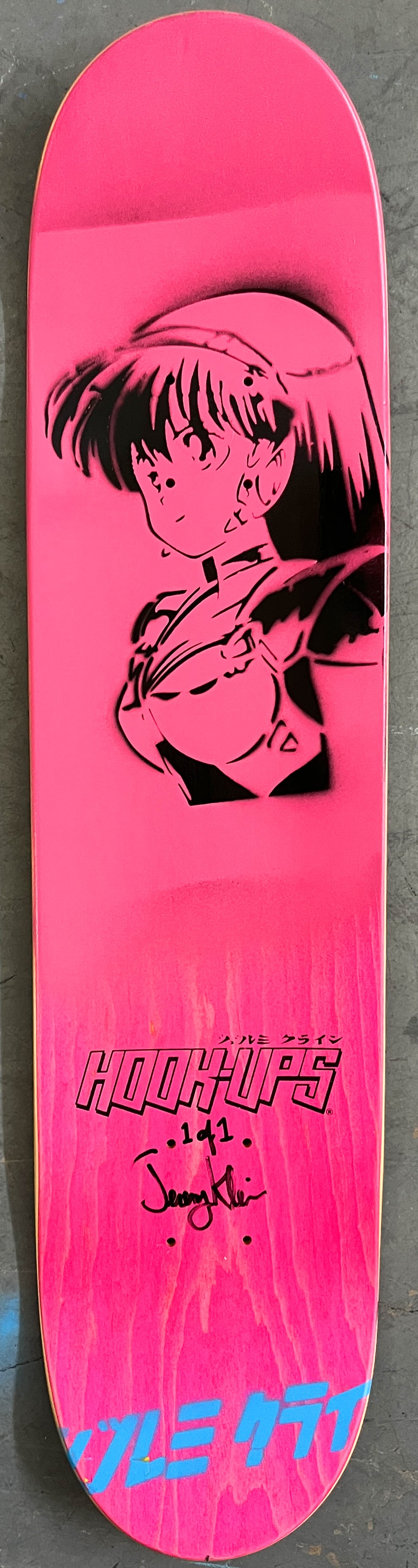 devil maiden 7.75 X 31.75 PINK/PURPLE MIXED PROCESS SIGNED 1 of 1, heat transfer with hand spray paint, and signed on top. 1 of 1