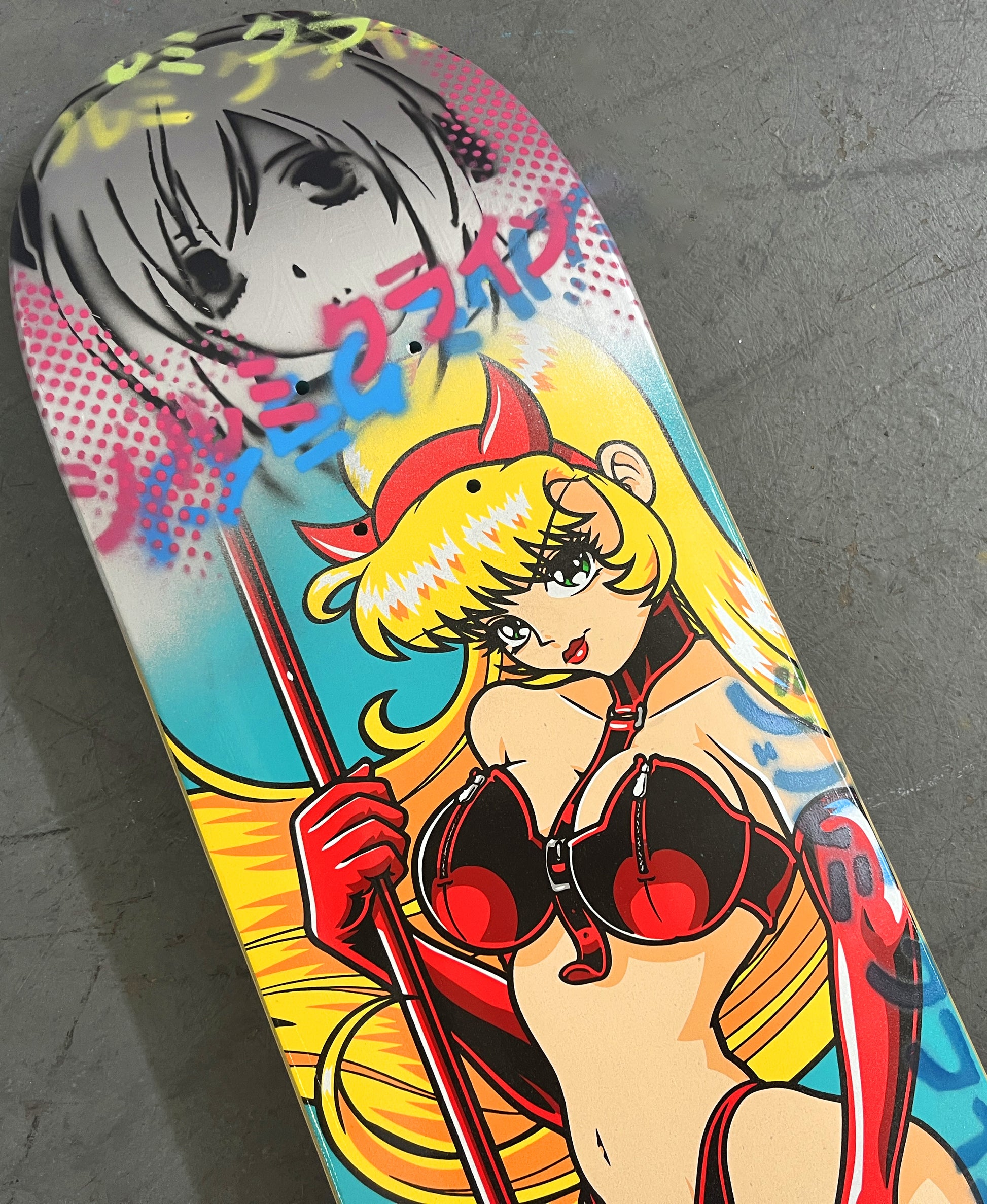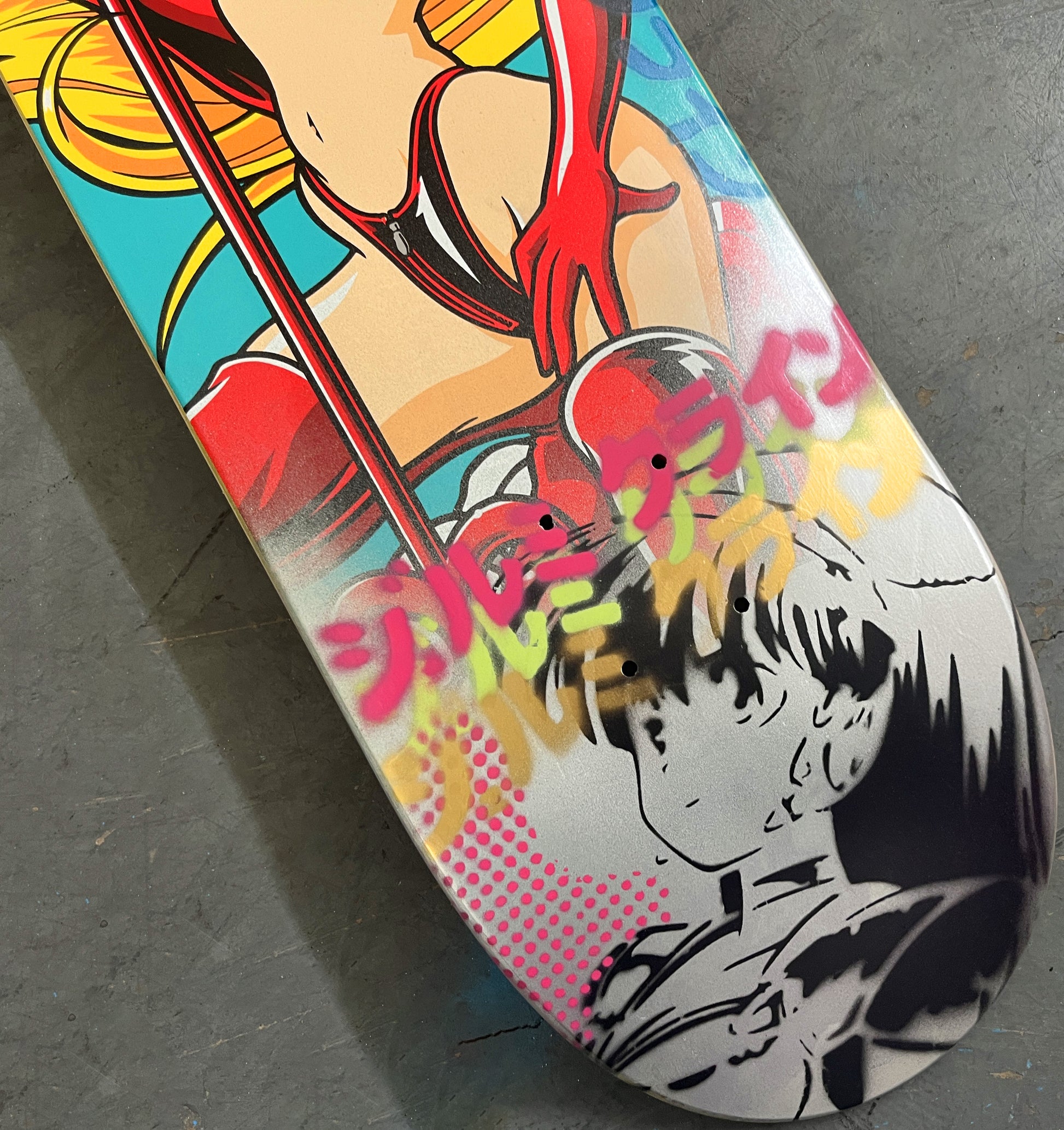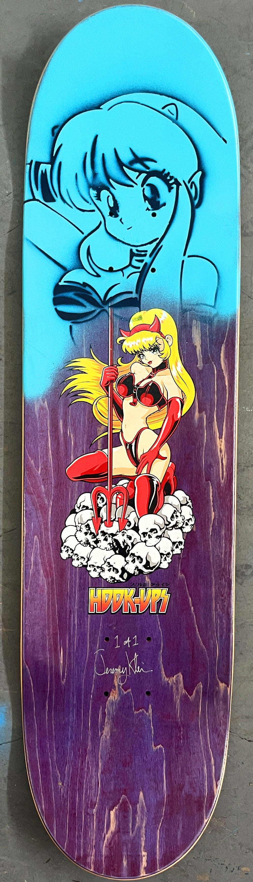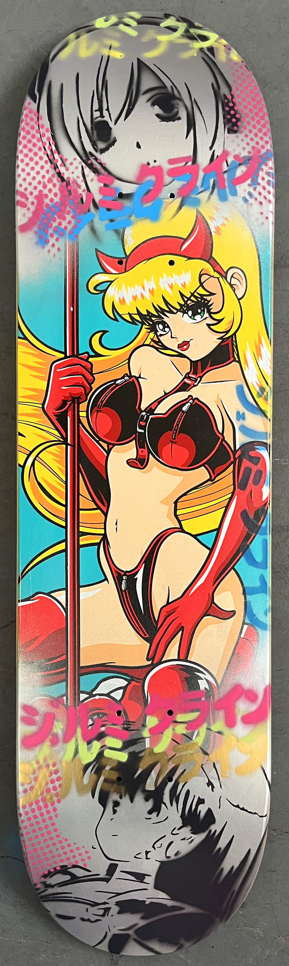 devil maiden 8.25 X 32.25 METALLIC SILVER MIXED PROCESS SIGNED 1 of 1, heat transfer with hand spray paint, and signed on top. 1 of 1