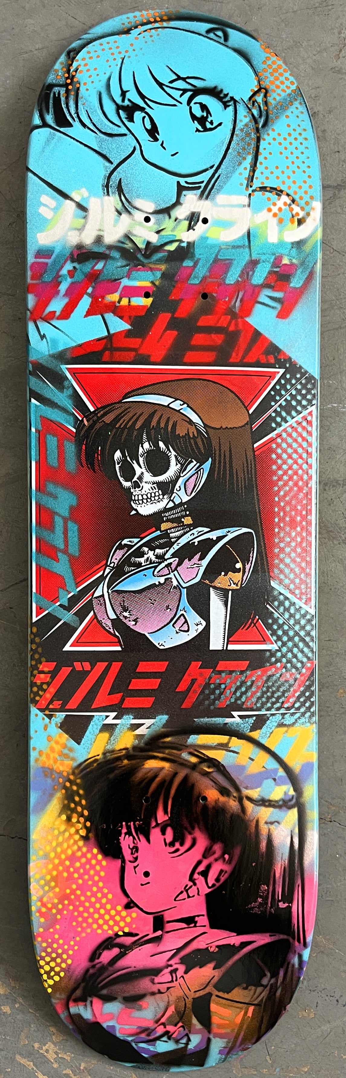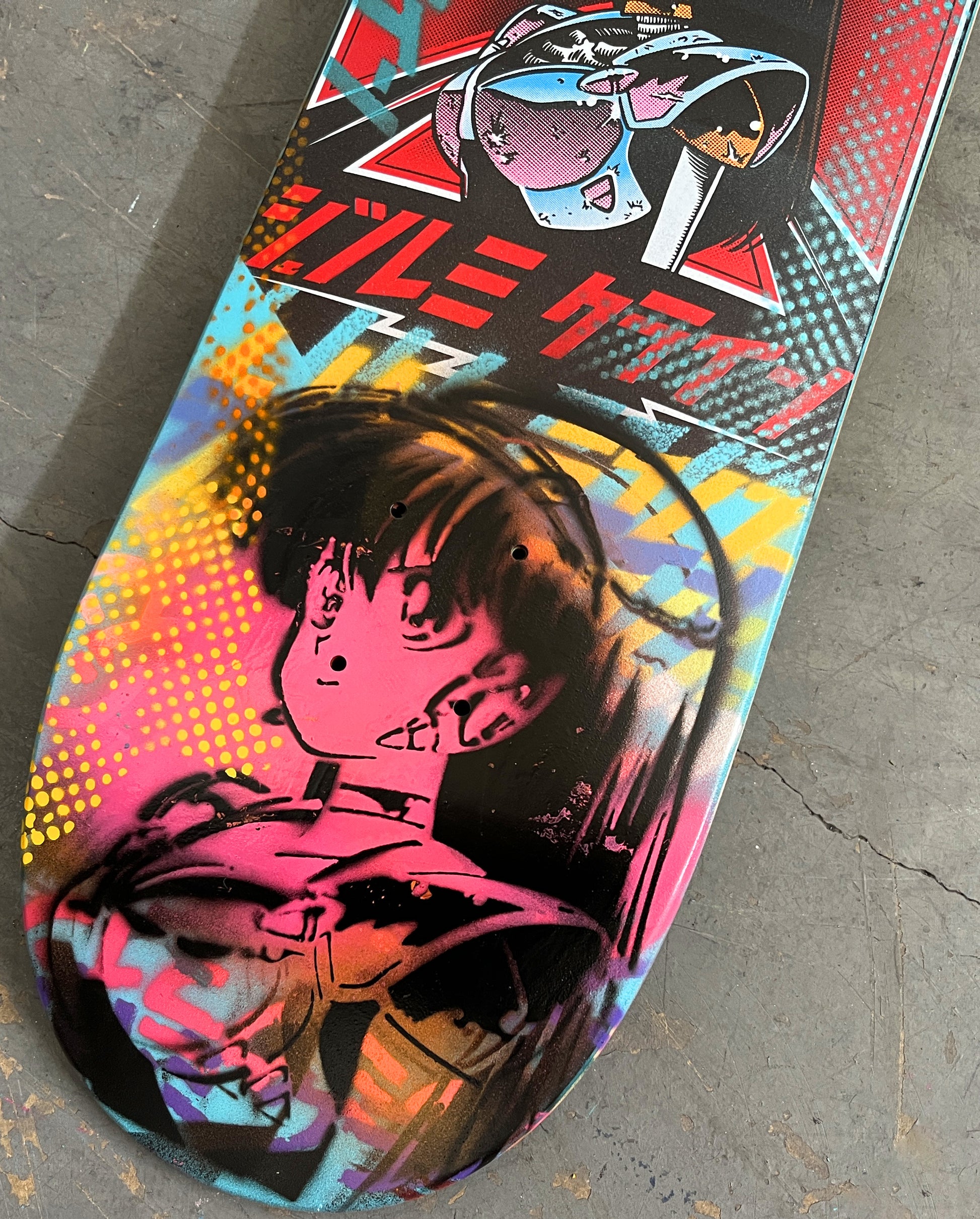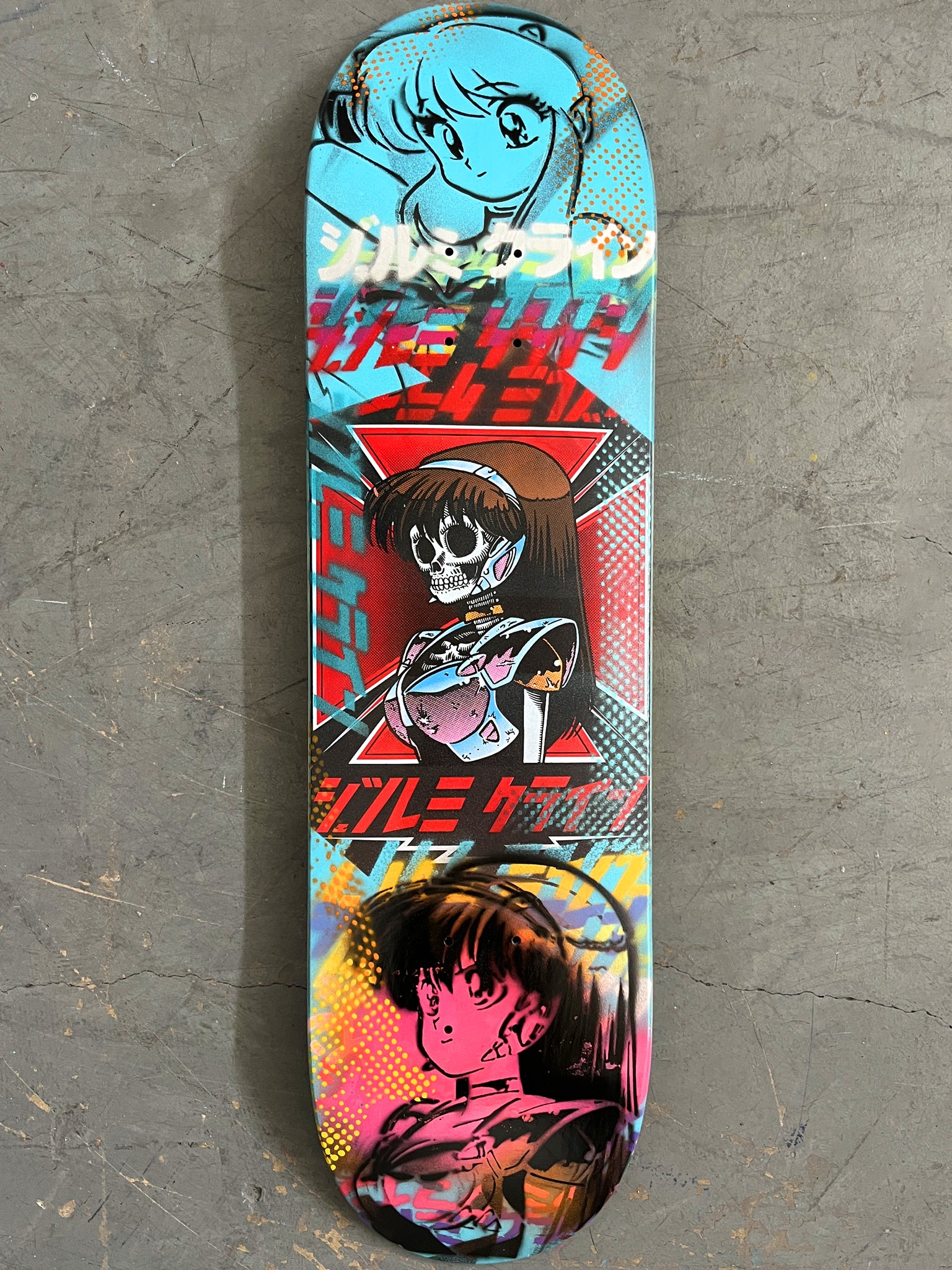 dream hawk MATTE BLACK/TEAL 8.5 X 32.25 1 OF 1 SIGNED. MIXED PROCESS HAND PAINTED BACKGROUND. THIS BOARD IS SIGNED