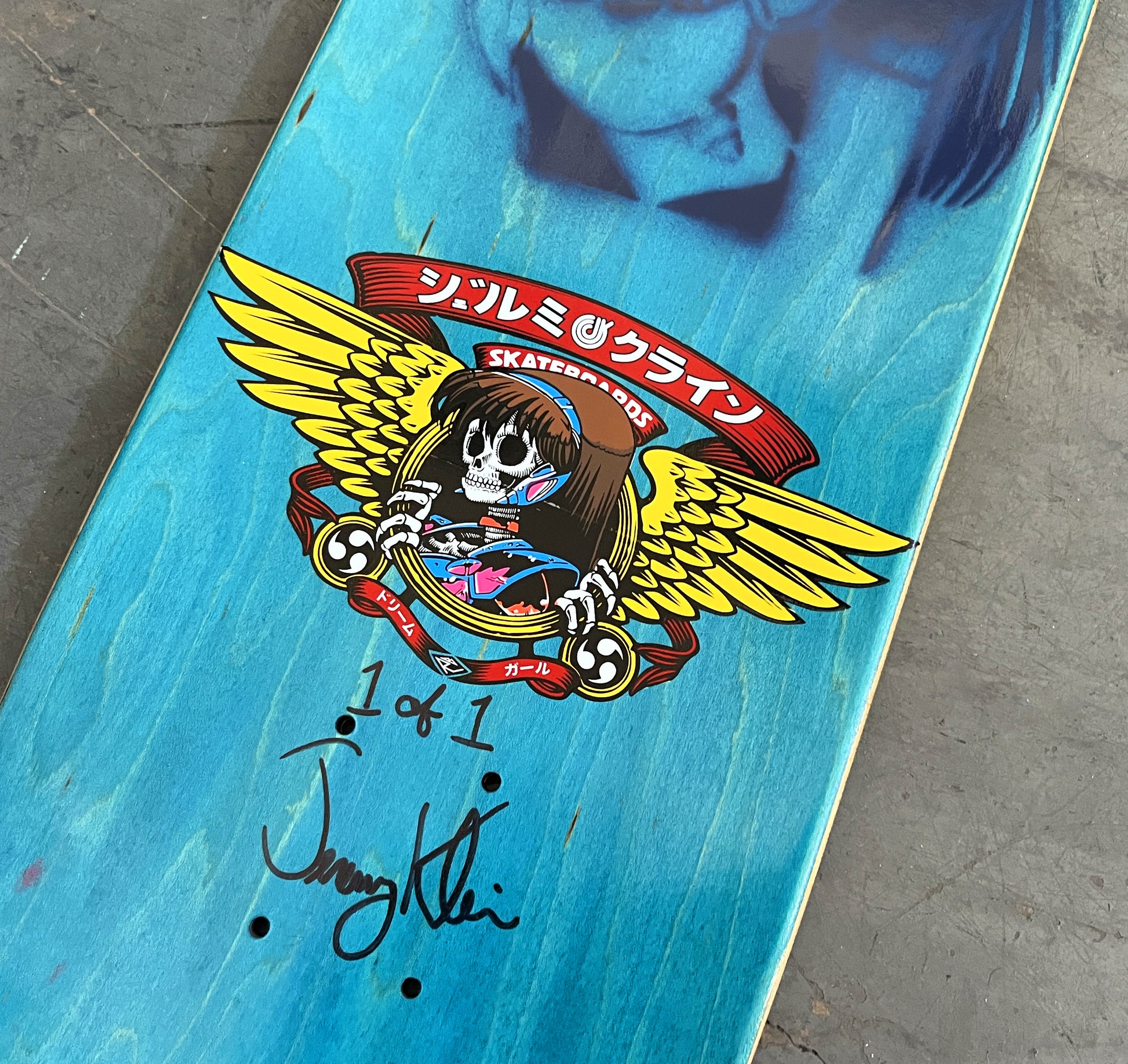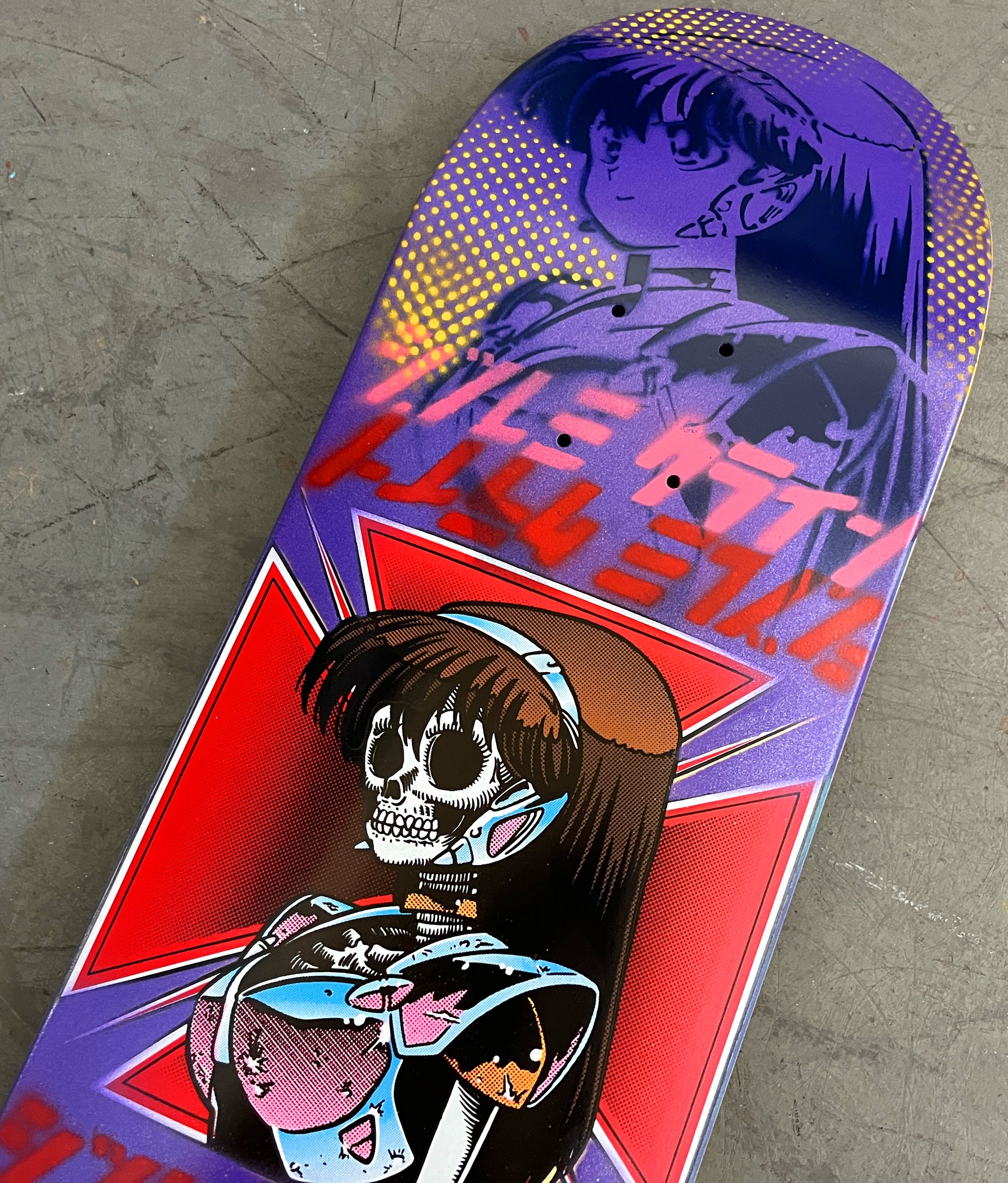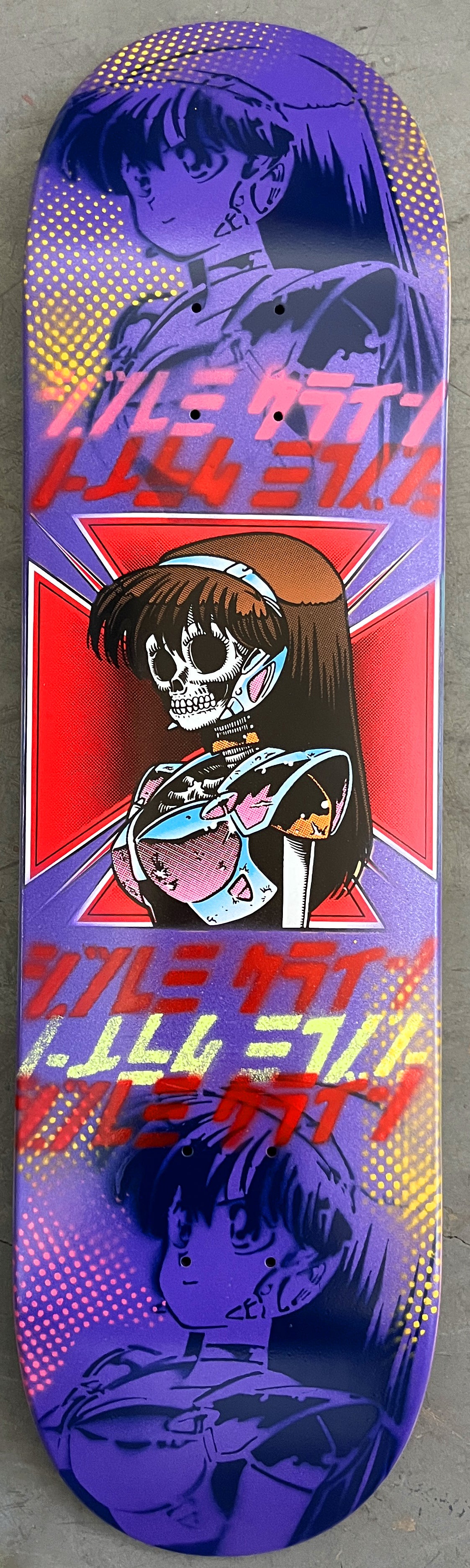 dream hawk PURPLE/RED GLITTER 8.5 X 32.25 1 OF 1. MIXED PROCESS HAND PAINTED BACKGROUND. THIS BOARD IS SIGNED