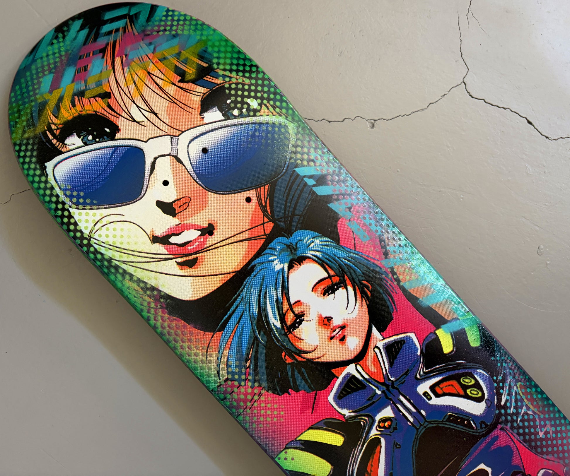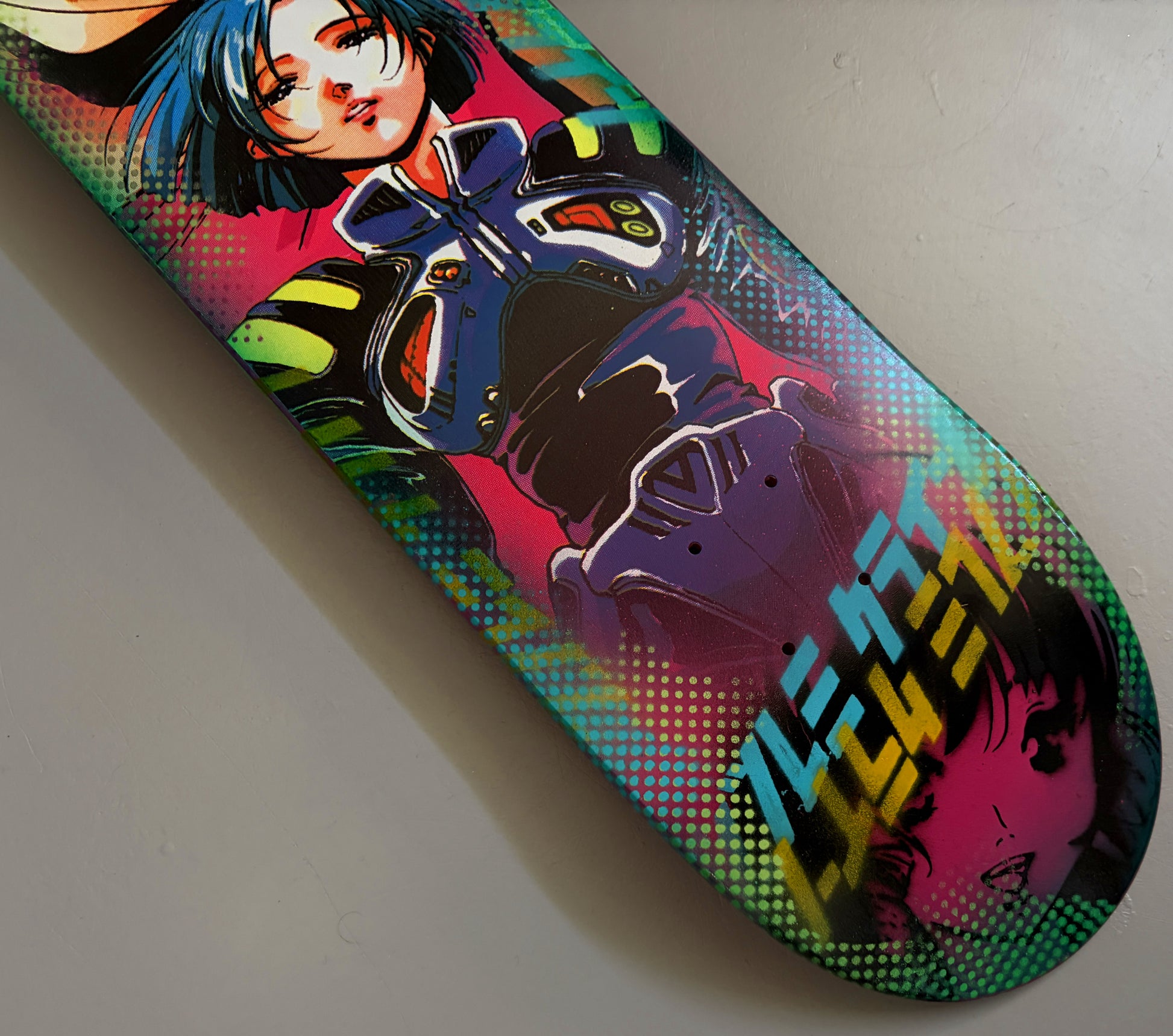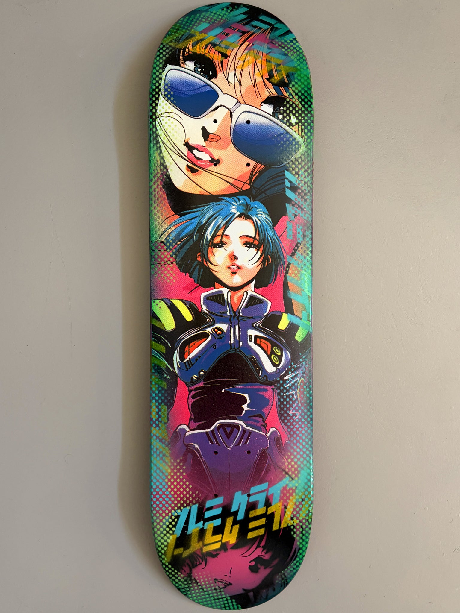 macross 8.5 X 32.25 PINK/AQUA ANODIZED MIXED PROCESS SIGNED 1 of 1, hand screened with spray paint and signed on top. 1 of 1