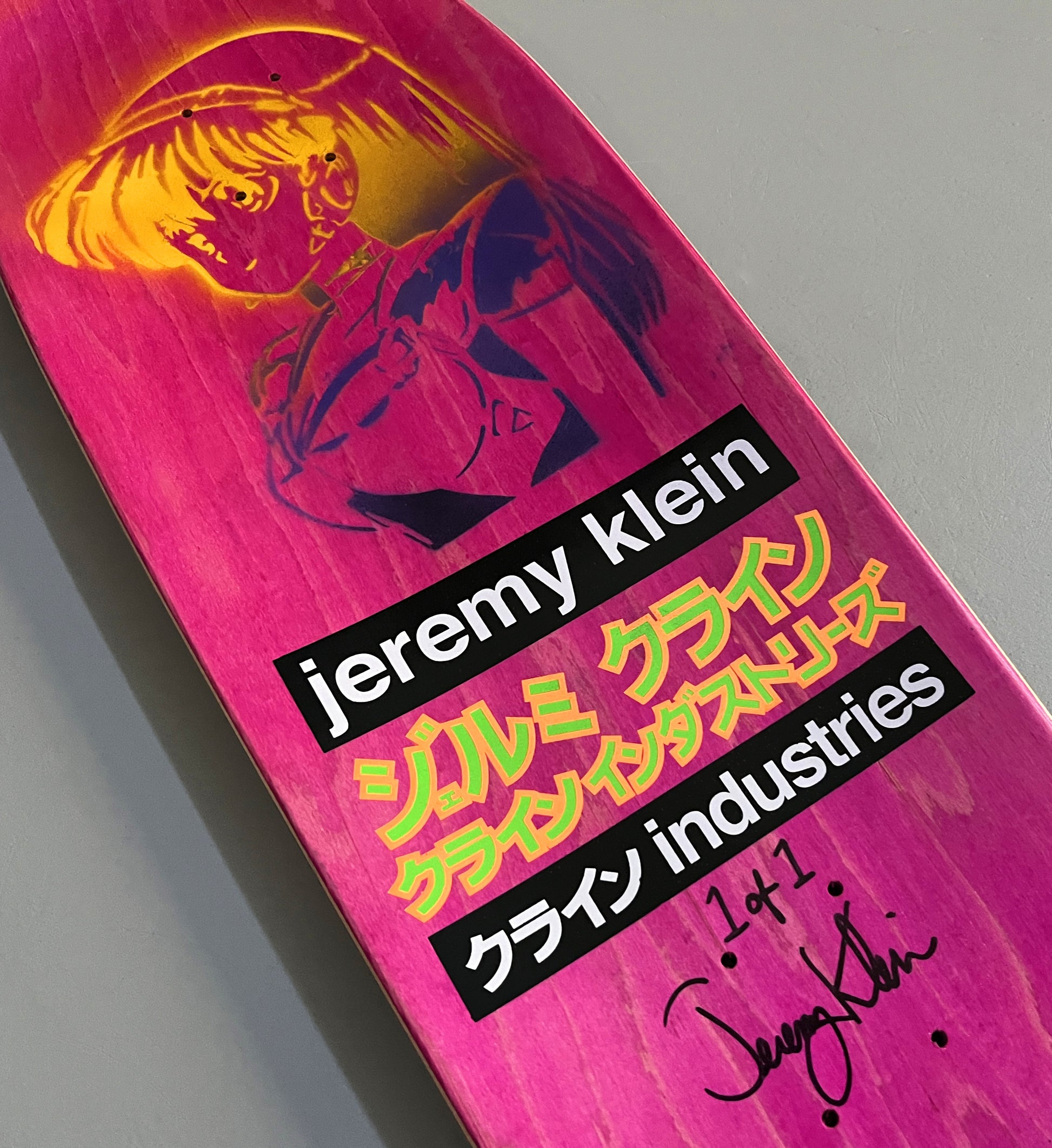 purple velvet blacklight dream girl MIXED PROCESS 9.5 X 31.75 HAND SCREENED 1 OF 1. this board is hand flocked with purple velvet on the background and black velvet on the dream girl. top color veneer may vary.