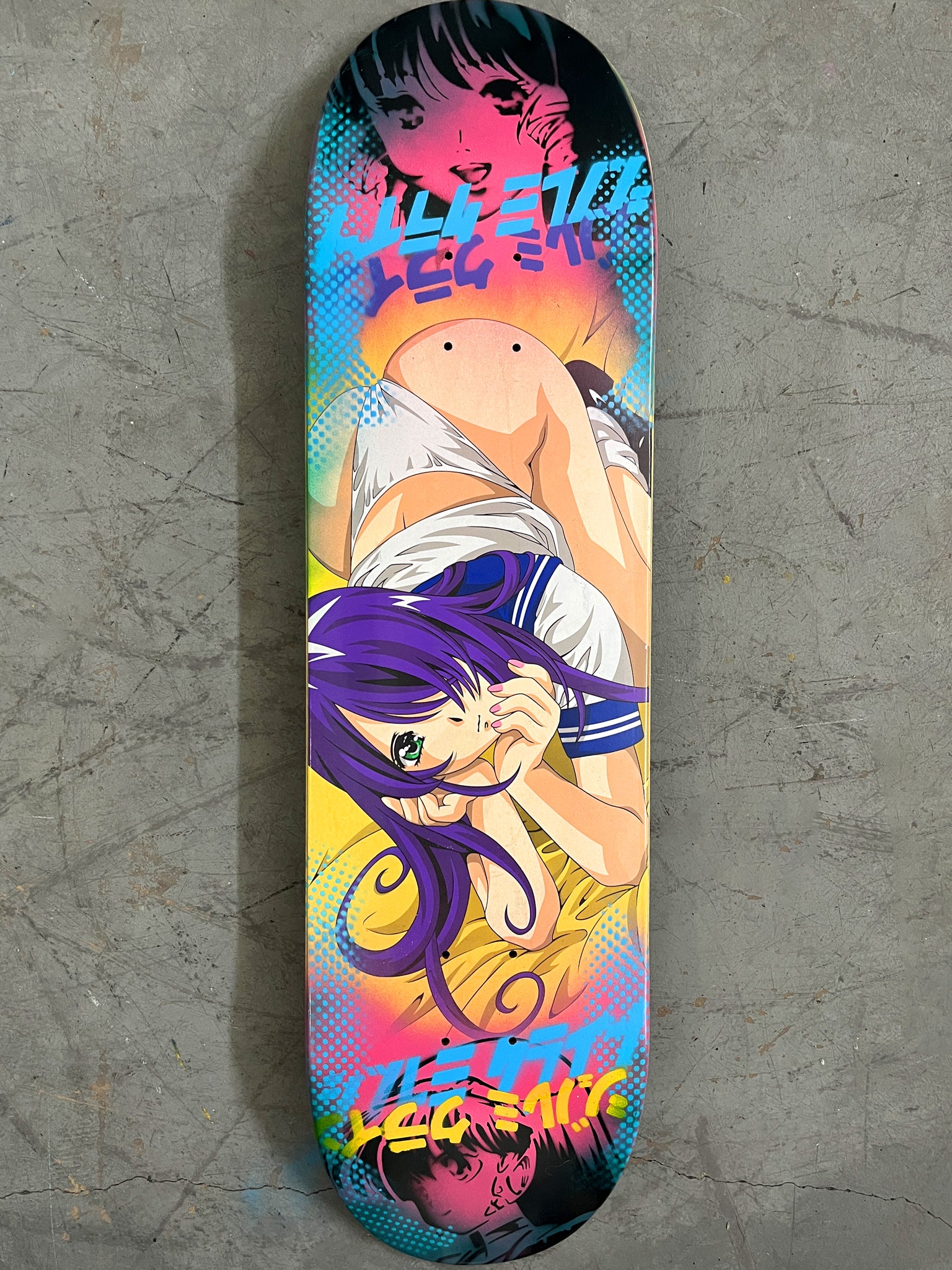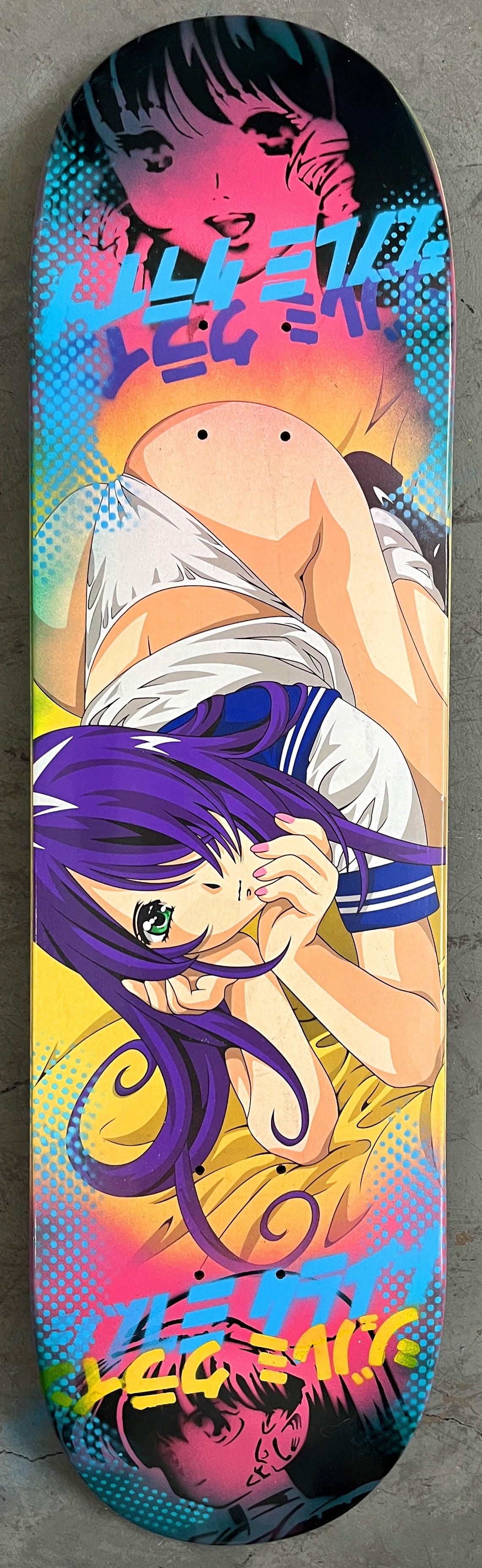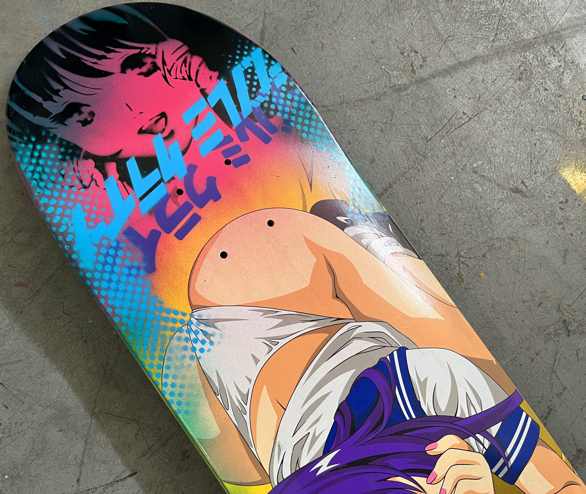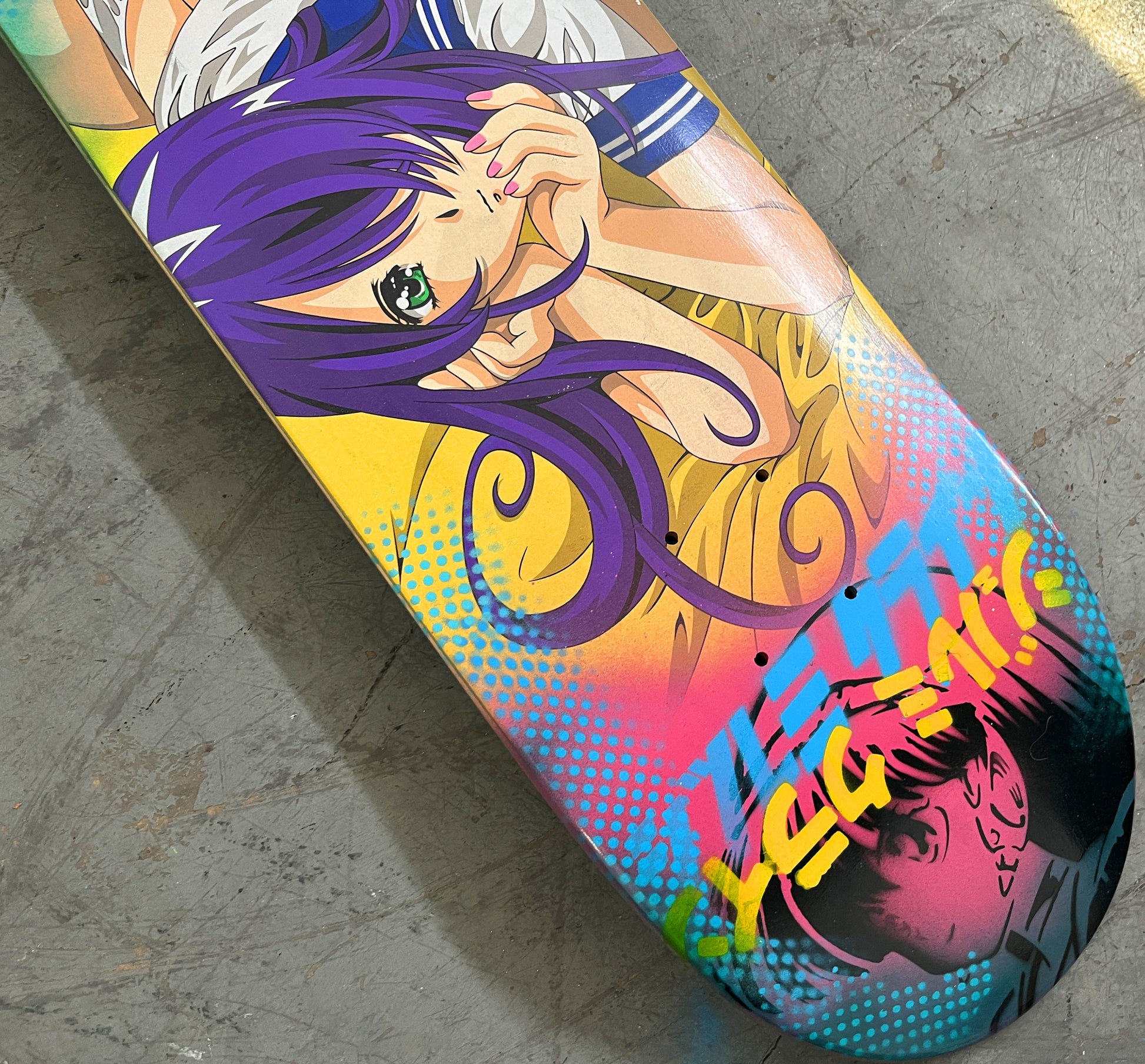 school girl mika 8.5 X 32.25 PINK/BLUE MIXED PROCESS SIGNED 1 of 1, heat transfer with hand spray paint, and signed on top. 1 of 1
