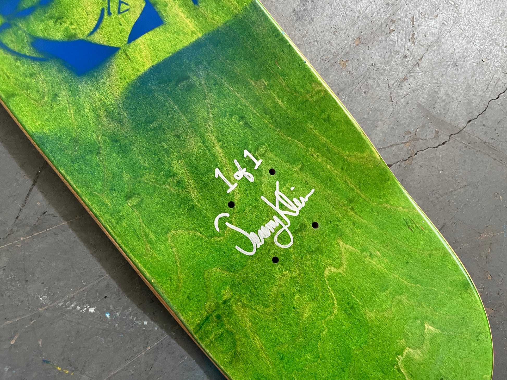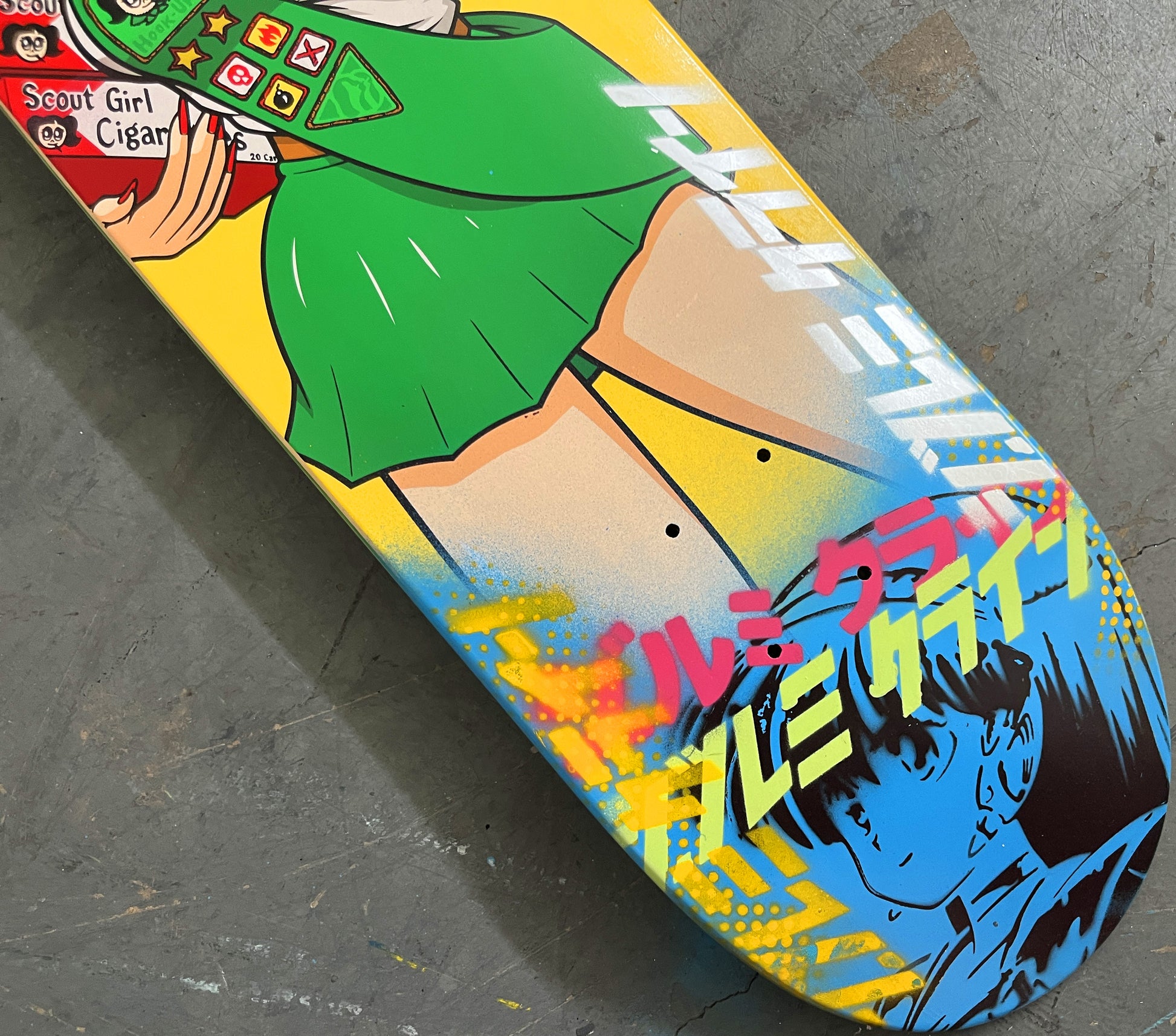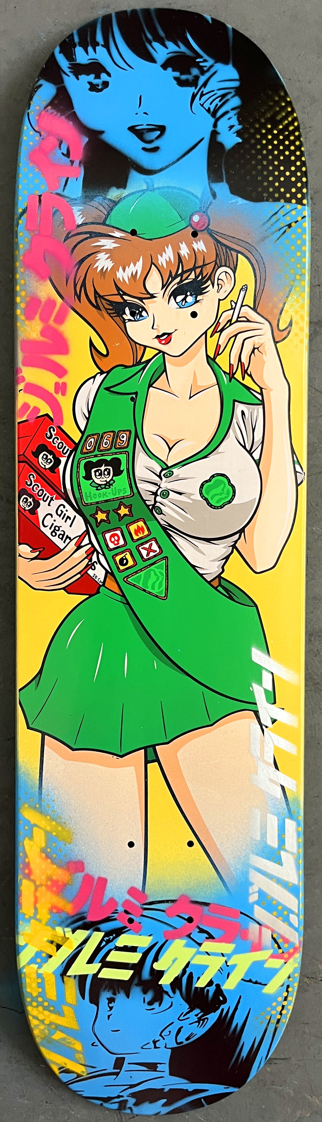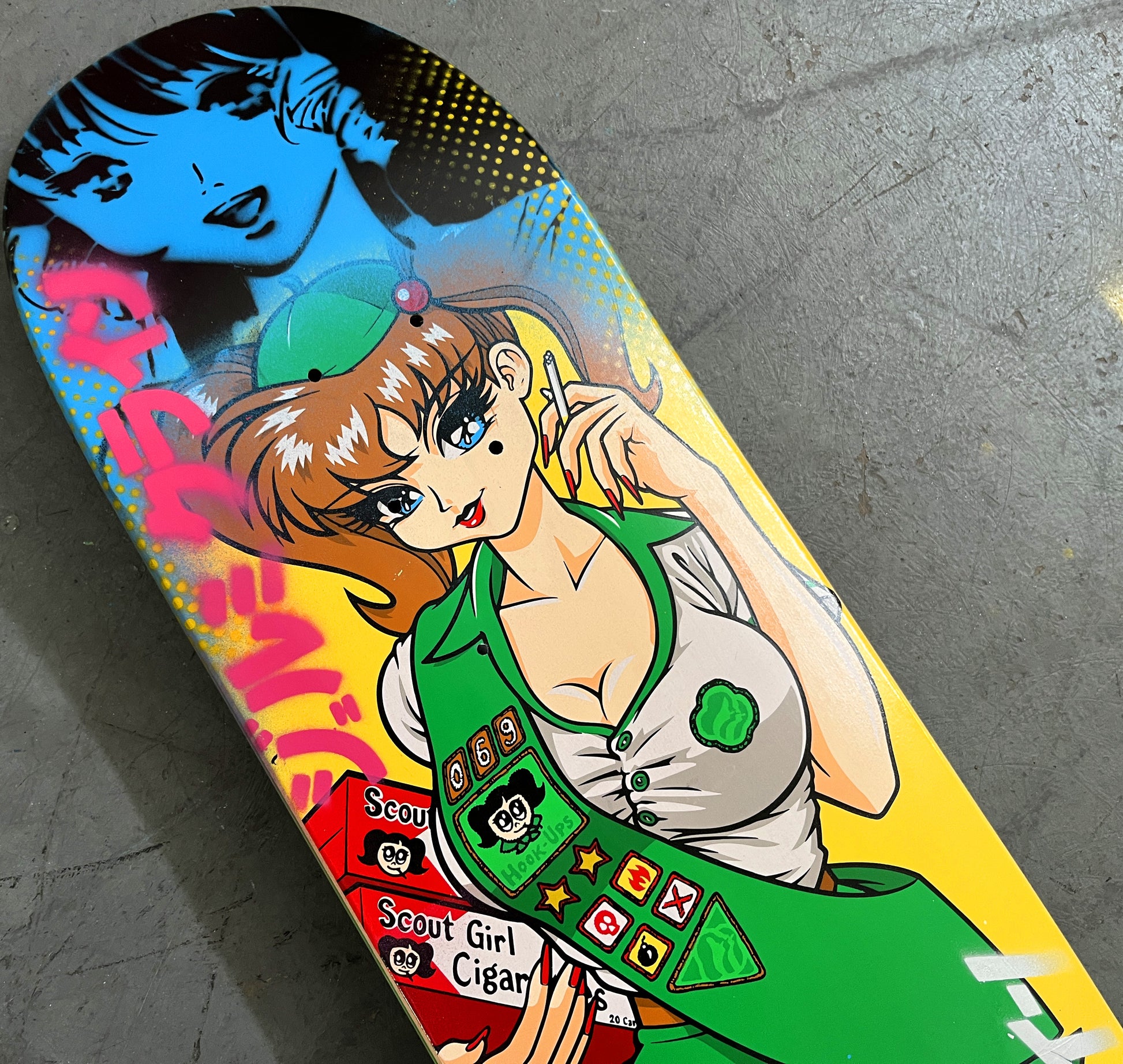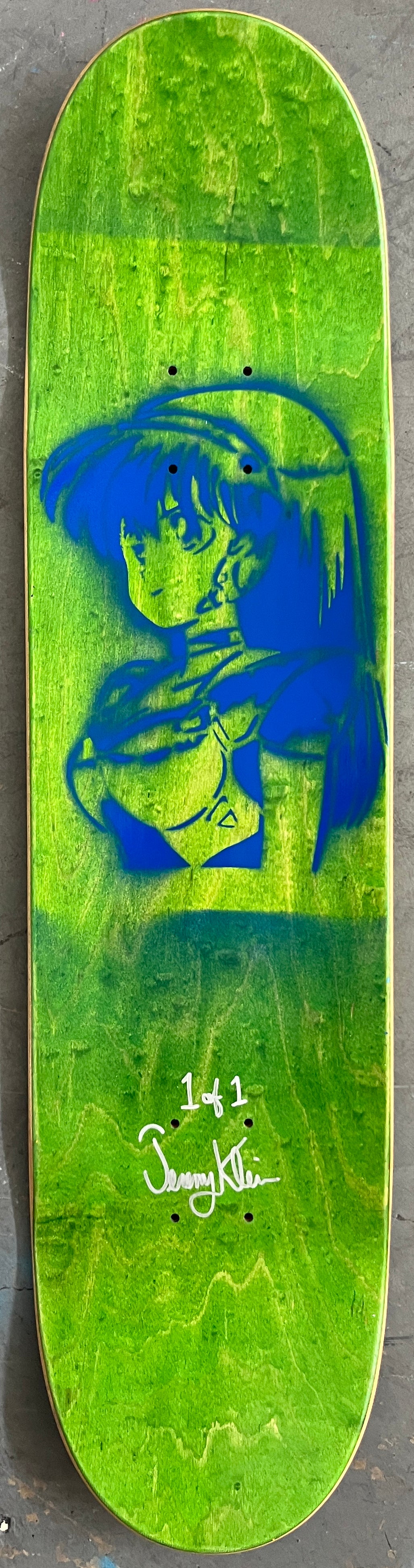 scout girl 7.88 X 31.75 BLUE MIXED PROCESS SIGNED 1 of 1, heat transfer with hand spray paint, and signed on top. 1 of 1