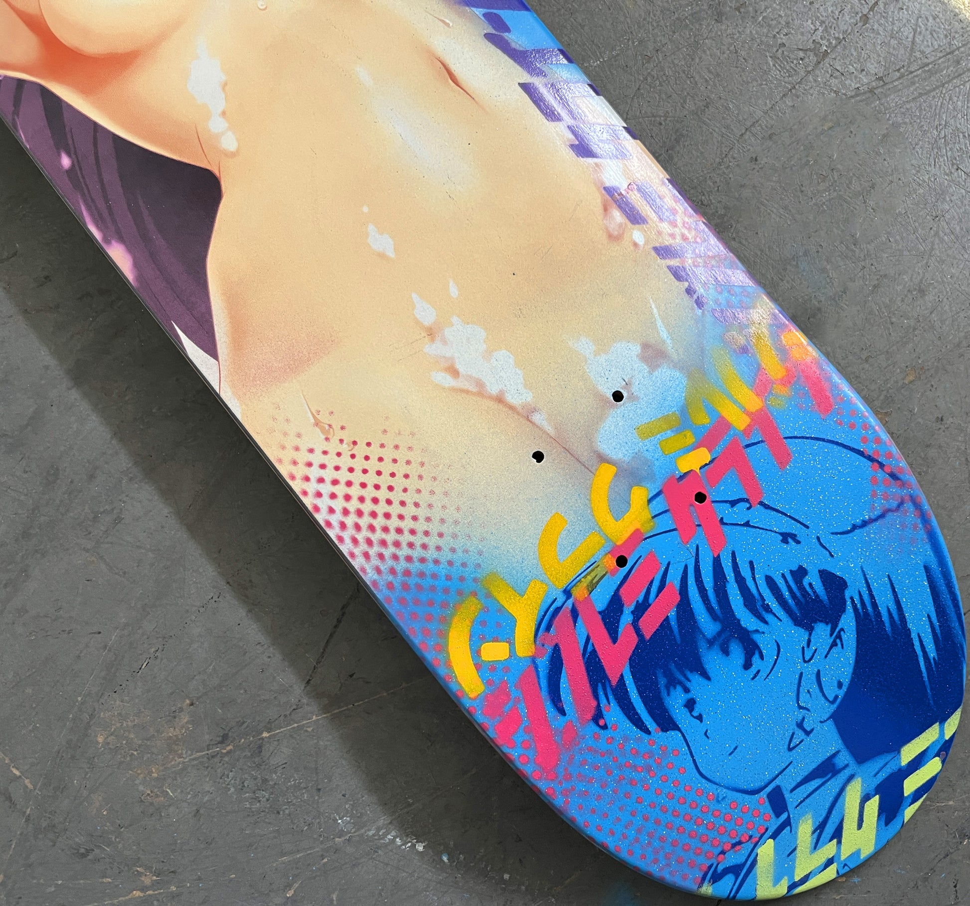 shower girl 8.25 X 32.25 BLUE MIXED PROCESS SIGNED 1 of 1, heat transfer with hand spray paint, and signed on top. 1 of 1