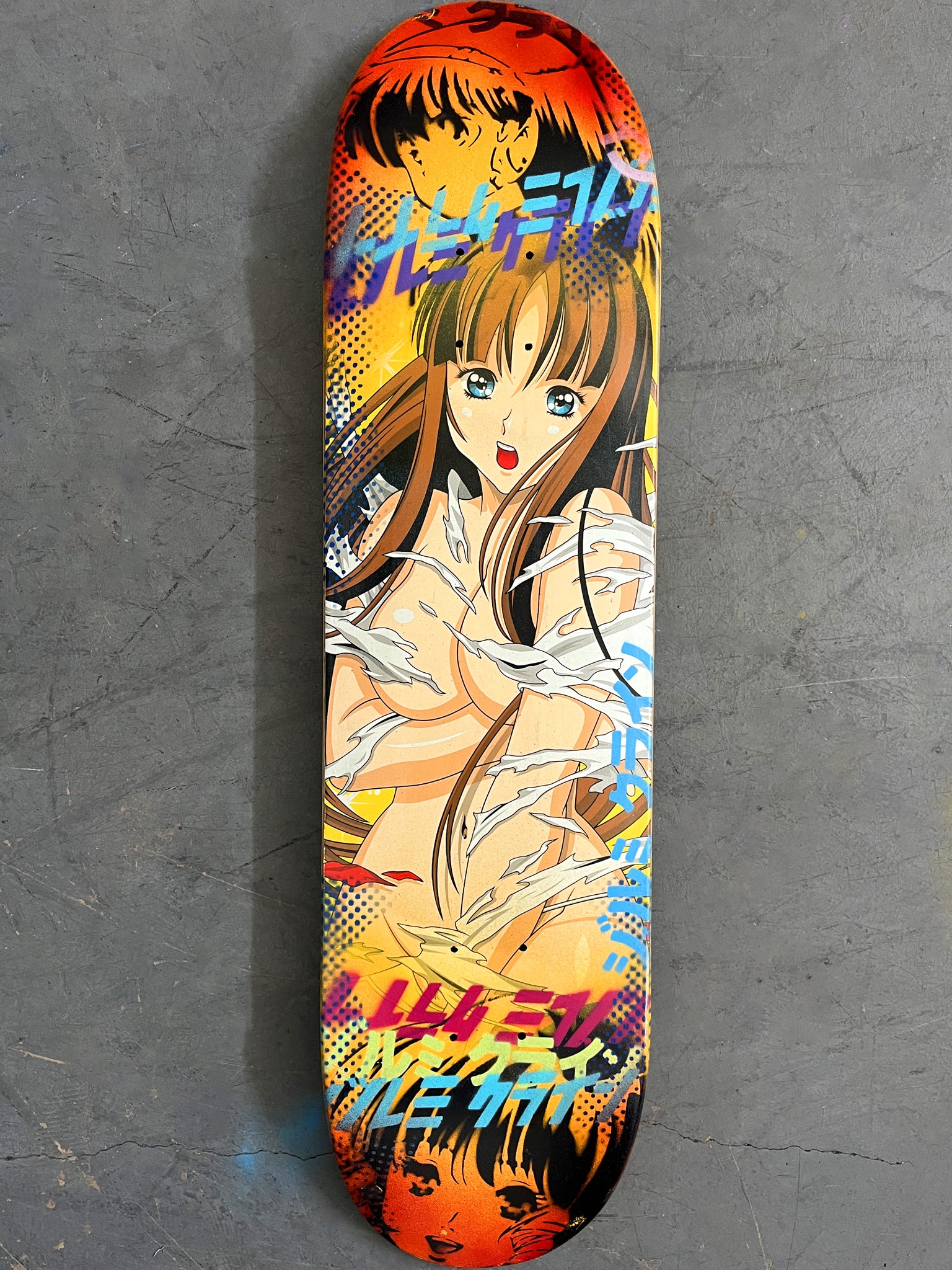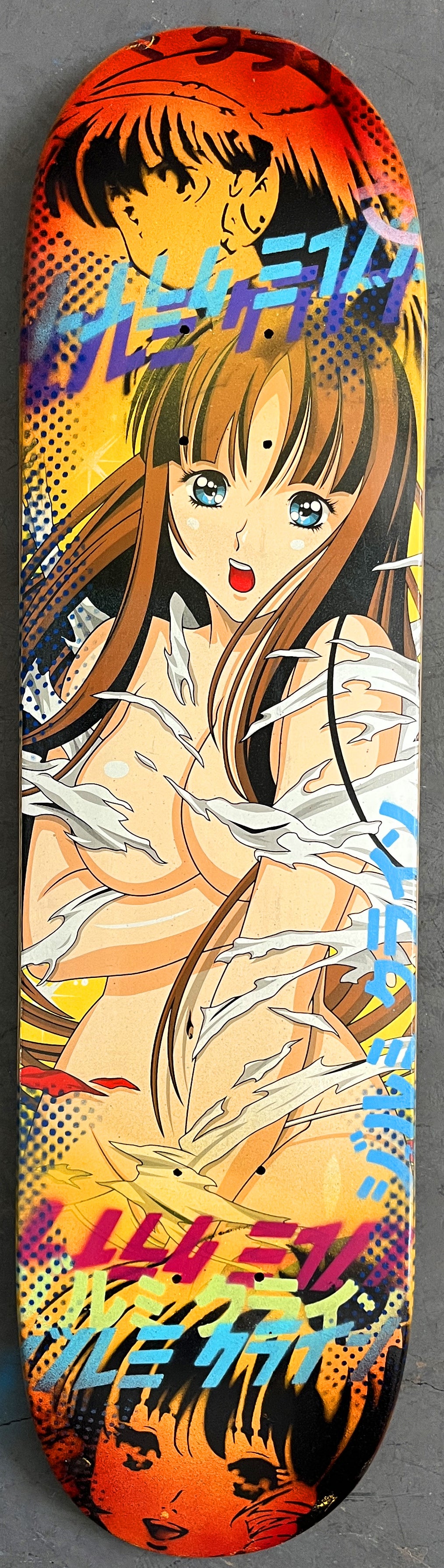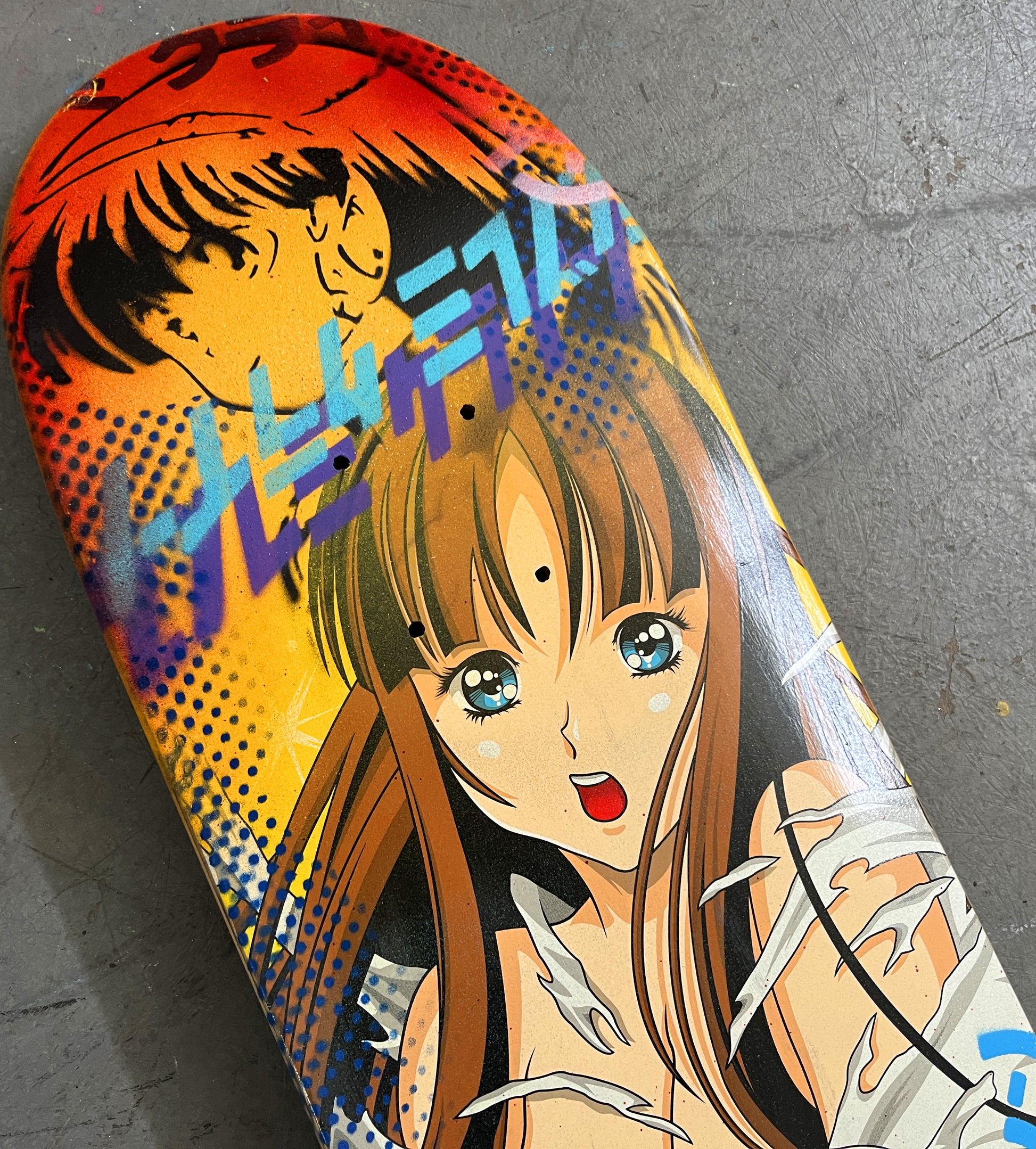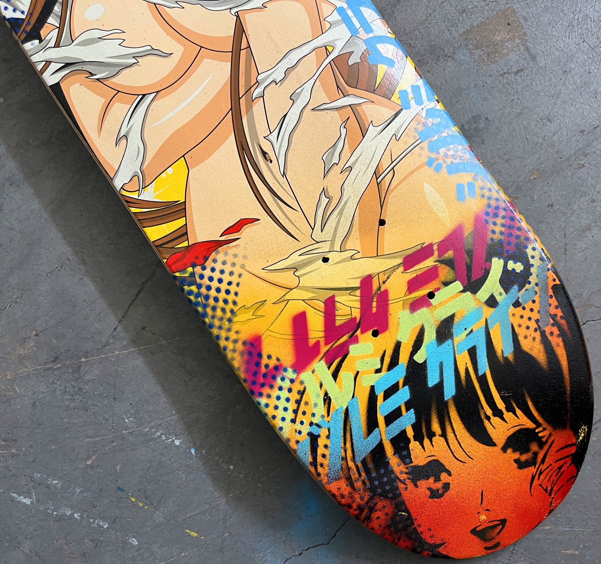 shredded 8.0 X 31.75 SUNSET GRADIENT MIXED PROCESS SIGNED 1 of 1, heat transfer with hand spray paint, and signed on top. 1 of 1