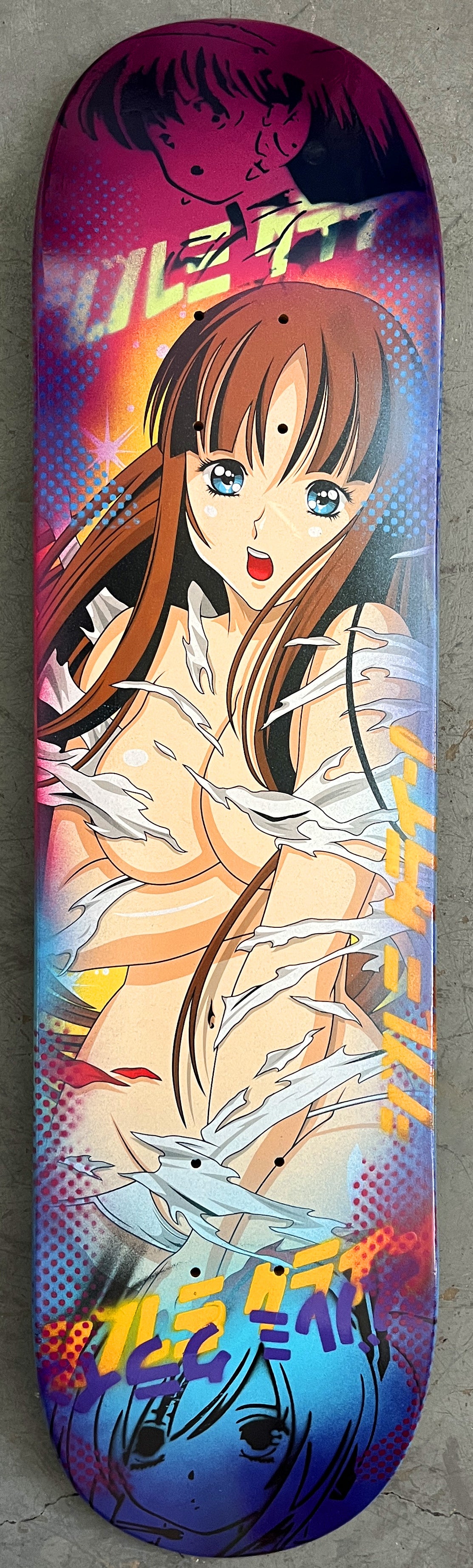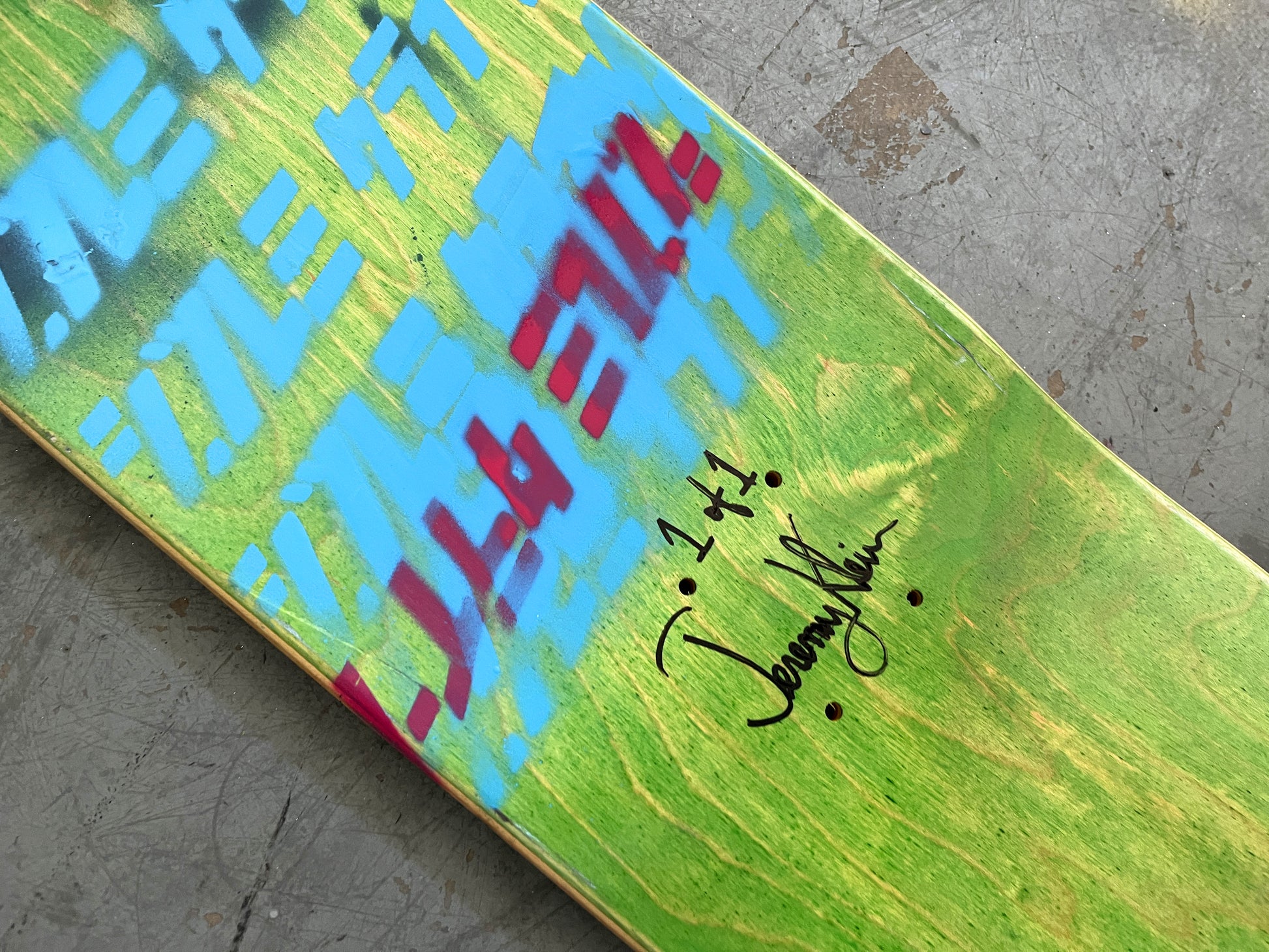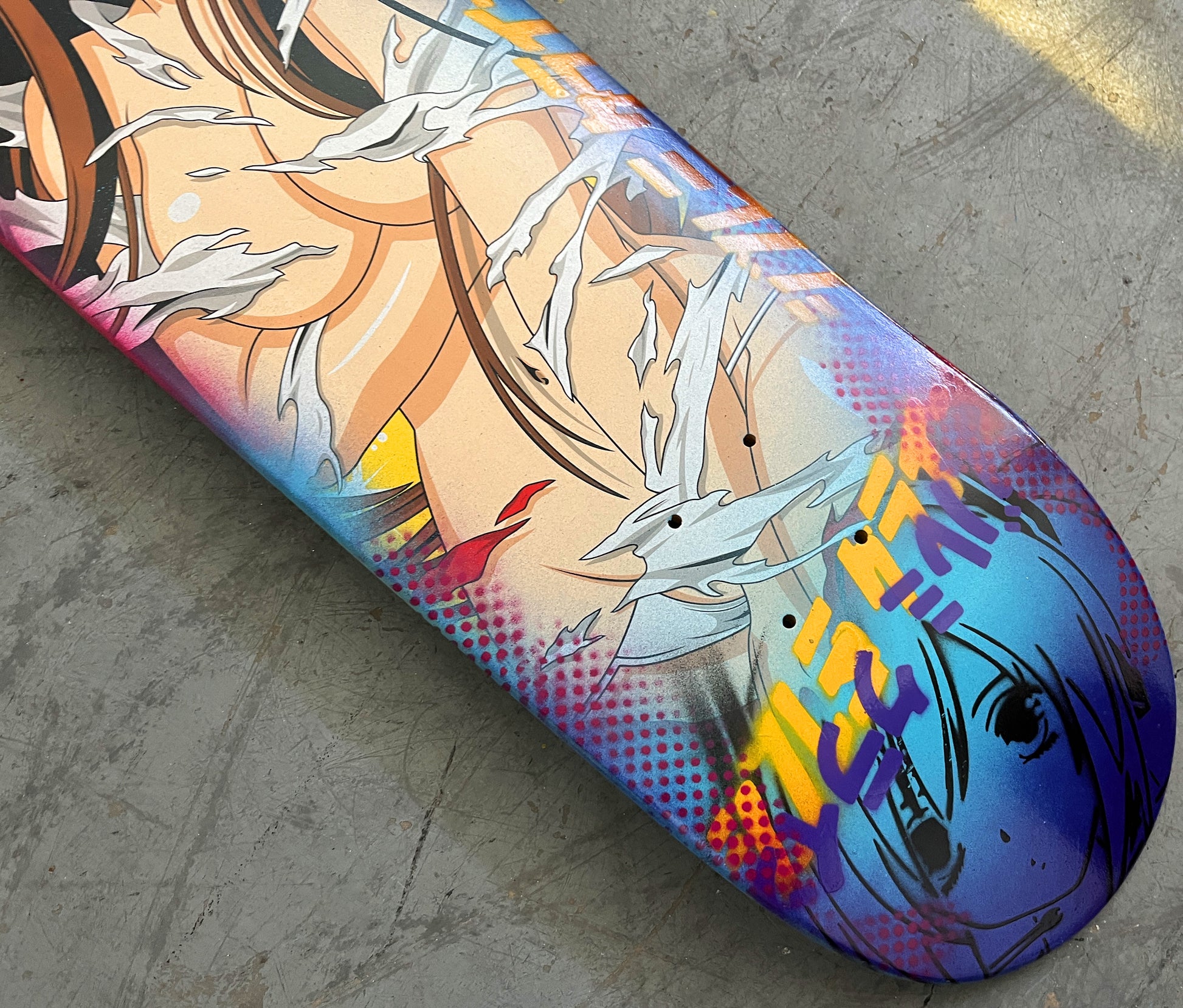 shredded 8 X 31.75 PINK/BUE/PURPLE ANODIZED MIXED PROCESS SIGNED 1 of 1, heat transfer with hand spray paint, and signed on top. 1 of 1