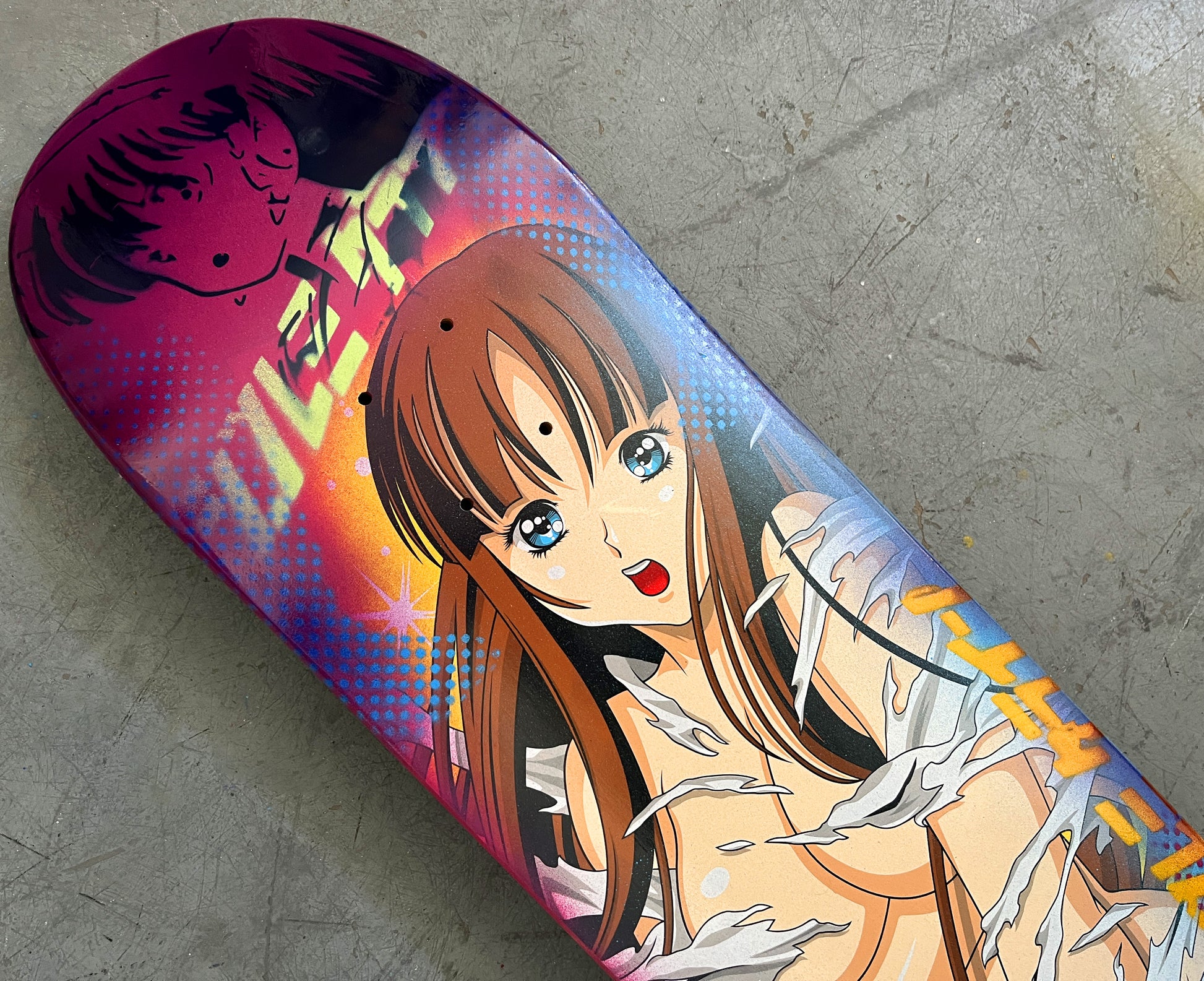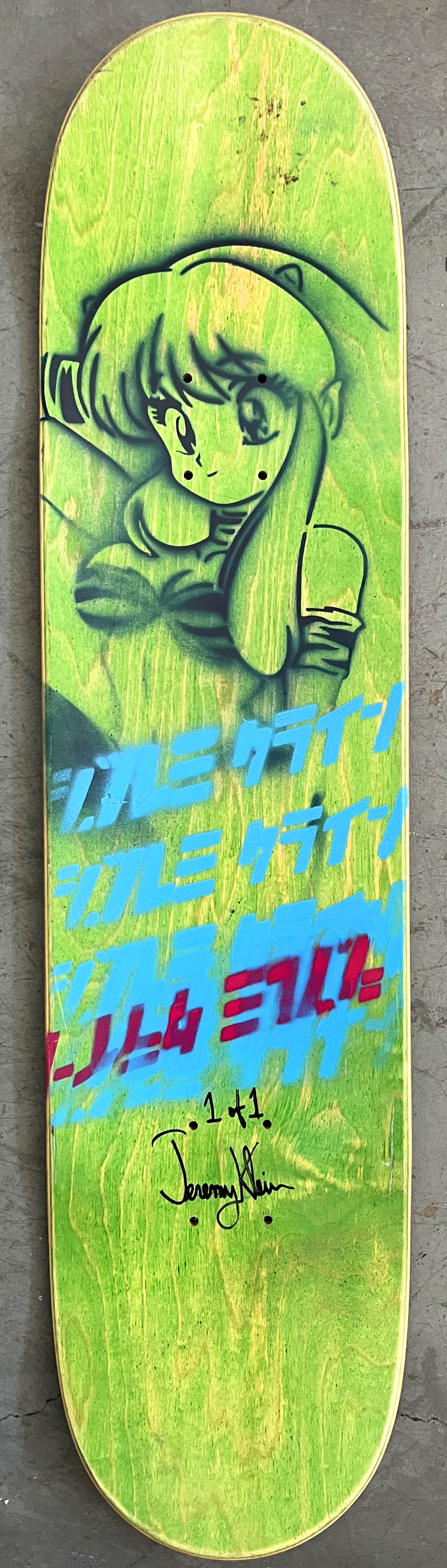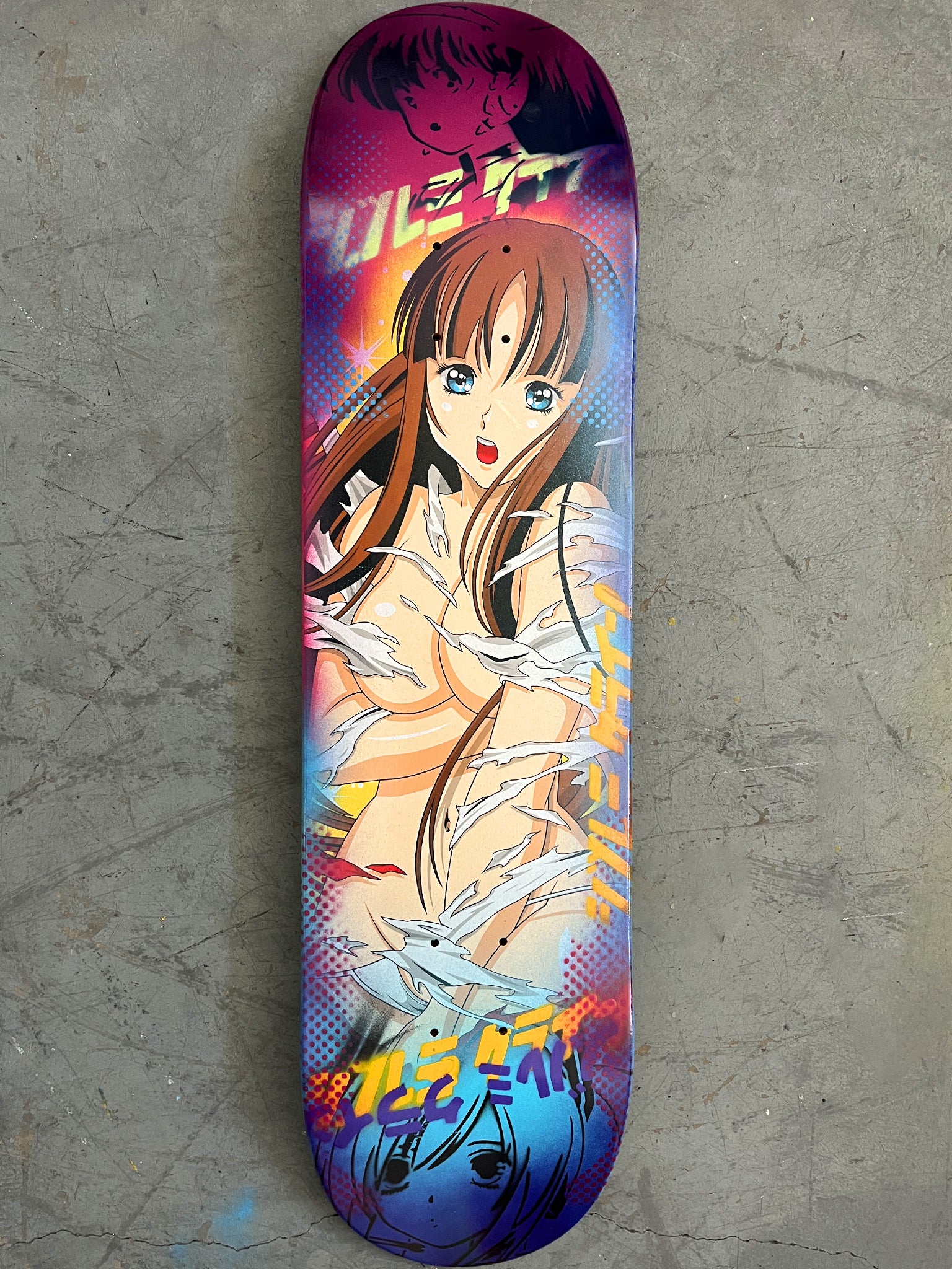 shredded 8 X 31.75 PINK/BUE/PURPLE ANODIZED MIXED PROCESS SIGNED 1 of 1, heat transfer with hand spray paint, and signed on top. 1 of 1