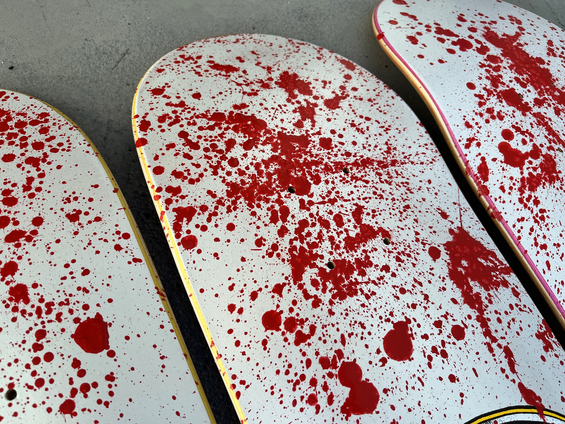SIGNED klein dragon 8.0 X 31.75 HAND SCREENED PEARL WHITE FATALITY VERSION, top color may vary. hand painted blood, each board is unique and one of a kind. mixed process screen printing and paint.