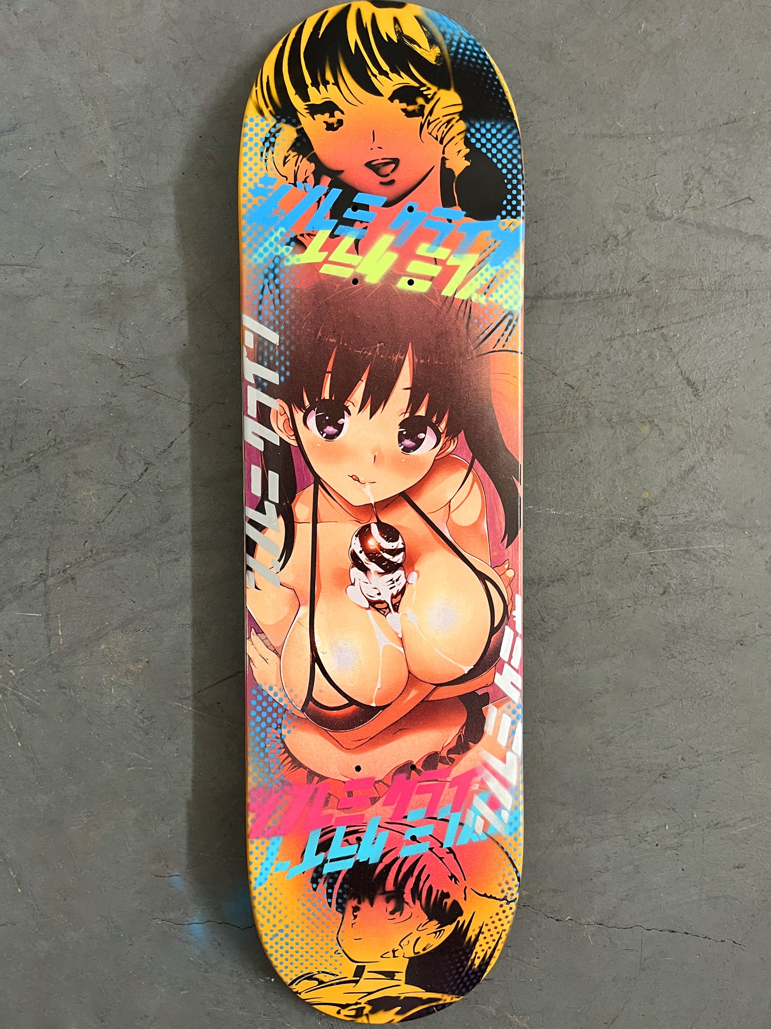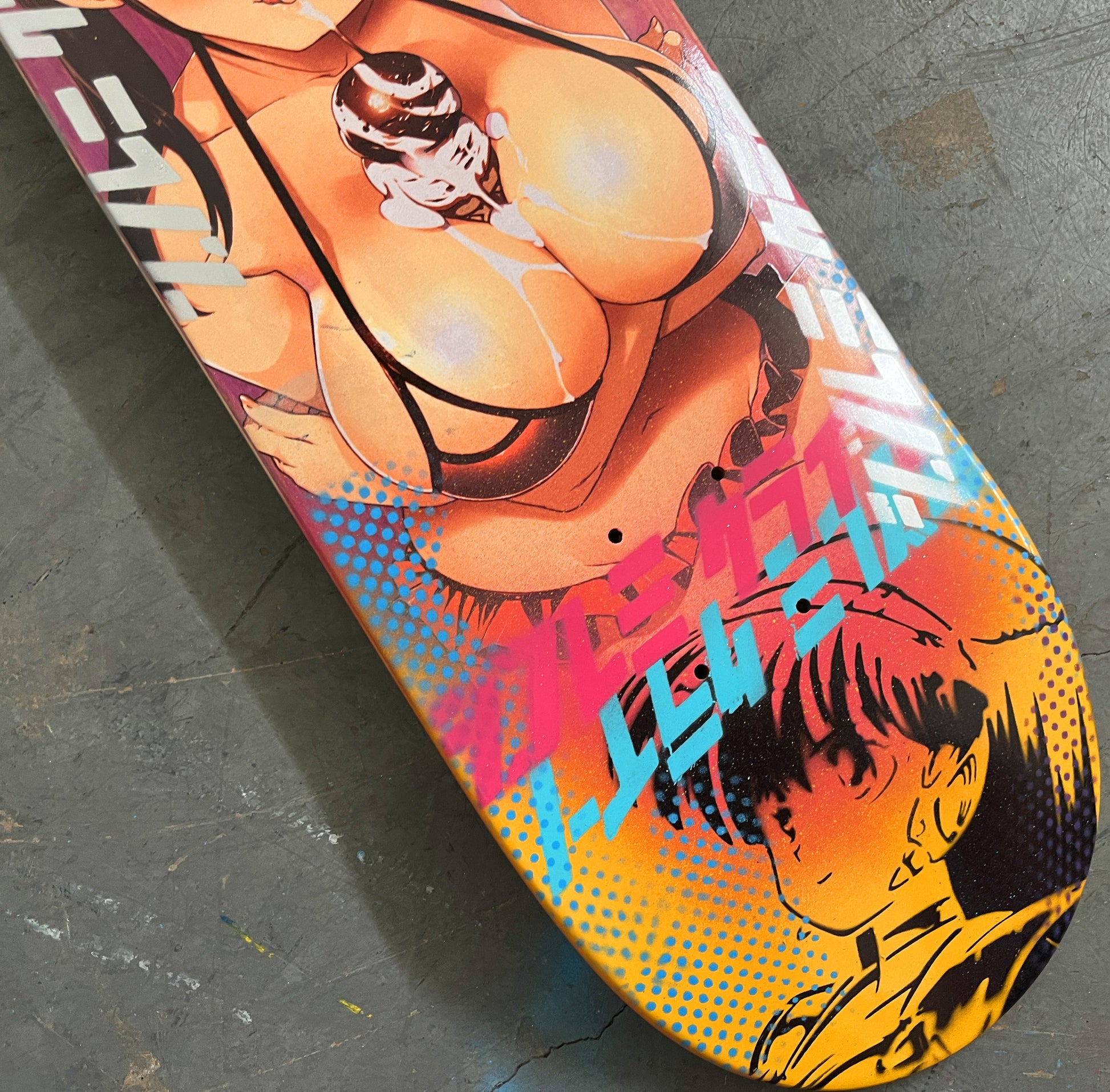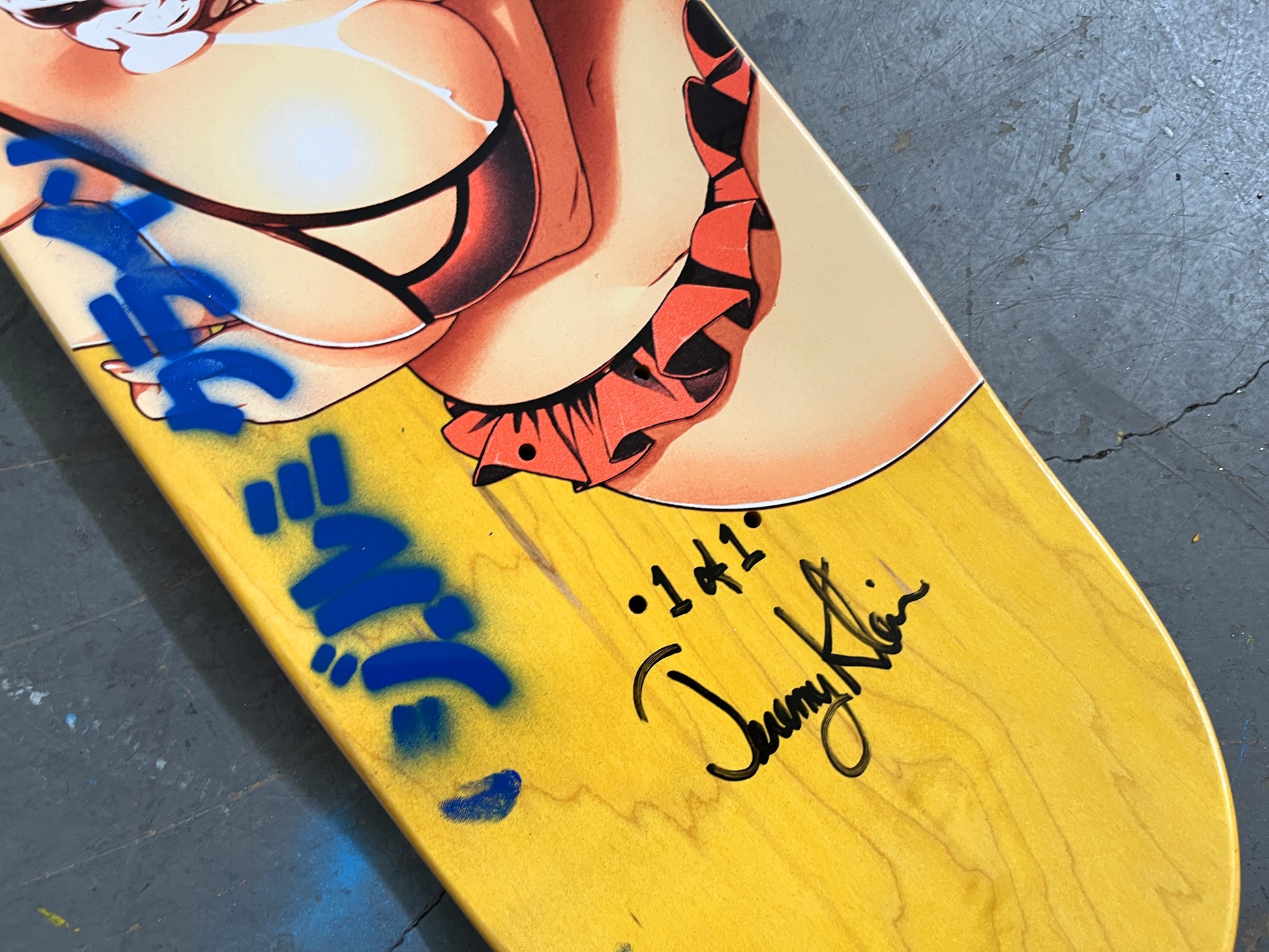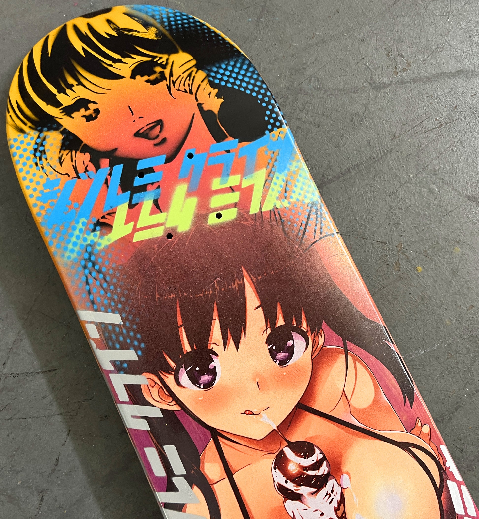 soft serve girl 8.5 X 32.25 BLUE/RED MIXED PROCESS SIGNED 1 of 1, heat transfer with hand spray paint, and signed on top. 1 of 1