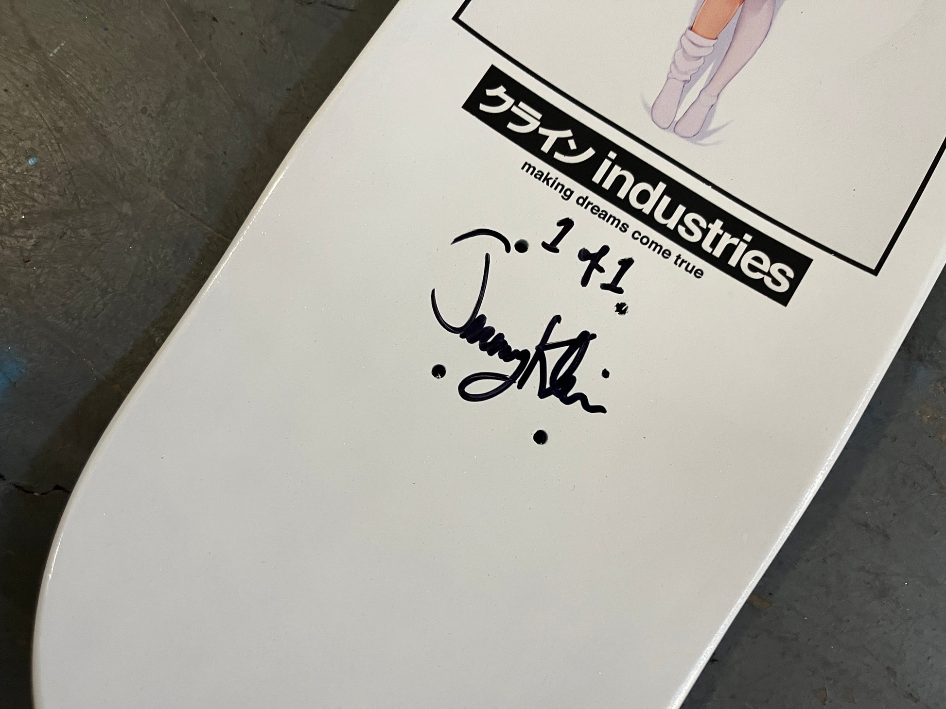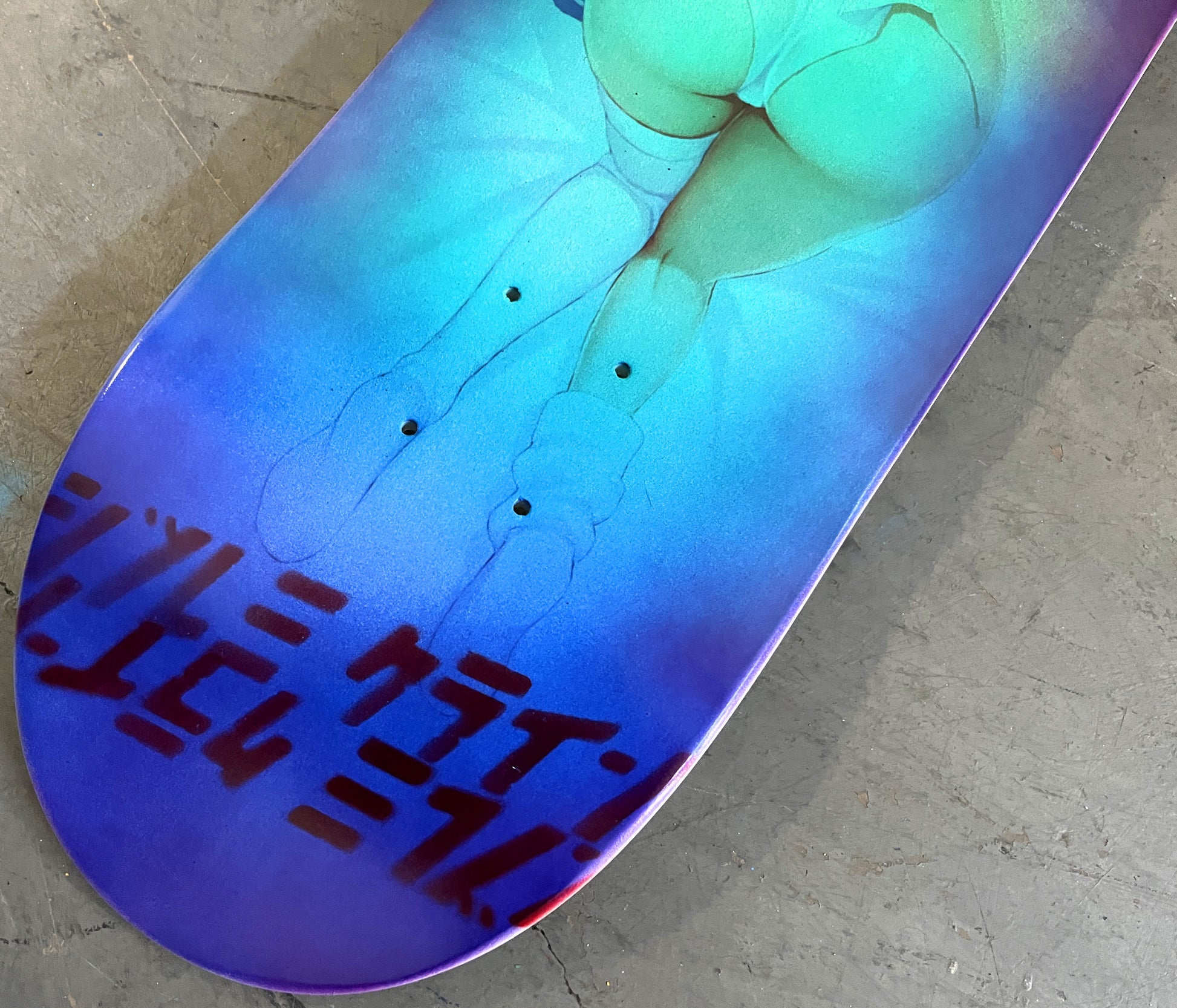 sonico 8.25 X 32.25 ANODIZED RED/BLUE/PURPLE/AQUA MIXED PROCESS SIGNED 1 of 1, heat transfer with hand spray paint, and signed on top. 1 of 1
