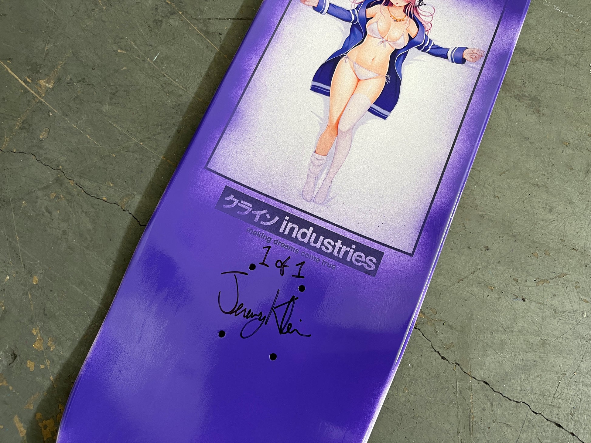 sonico 8.25 X 32.25 PEARL WHITE/ PURPLE/PINK MIXED PROCESS SIGNED 1 of 1, heat transfer with hand spray paint, and signed on top. 1 of 1