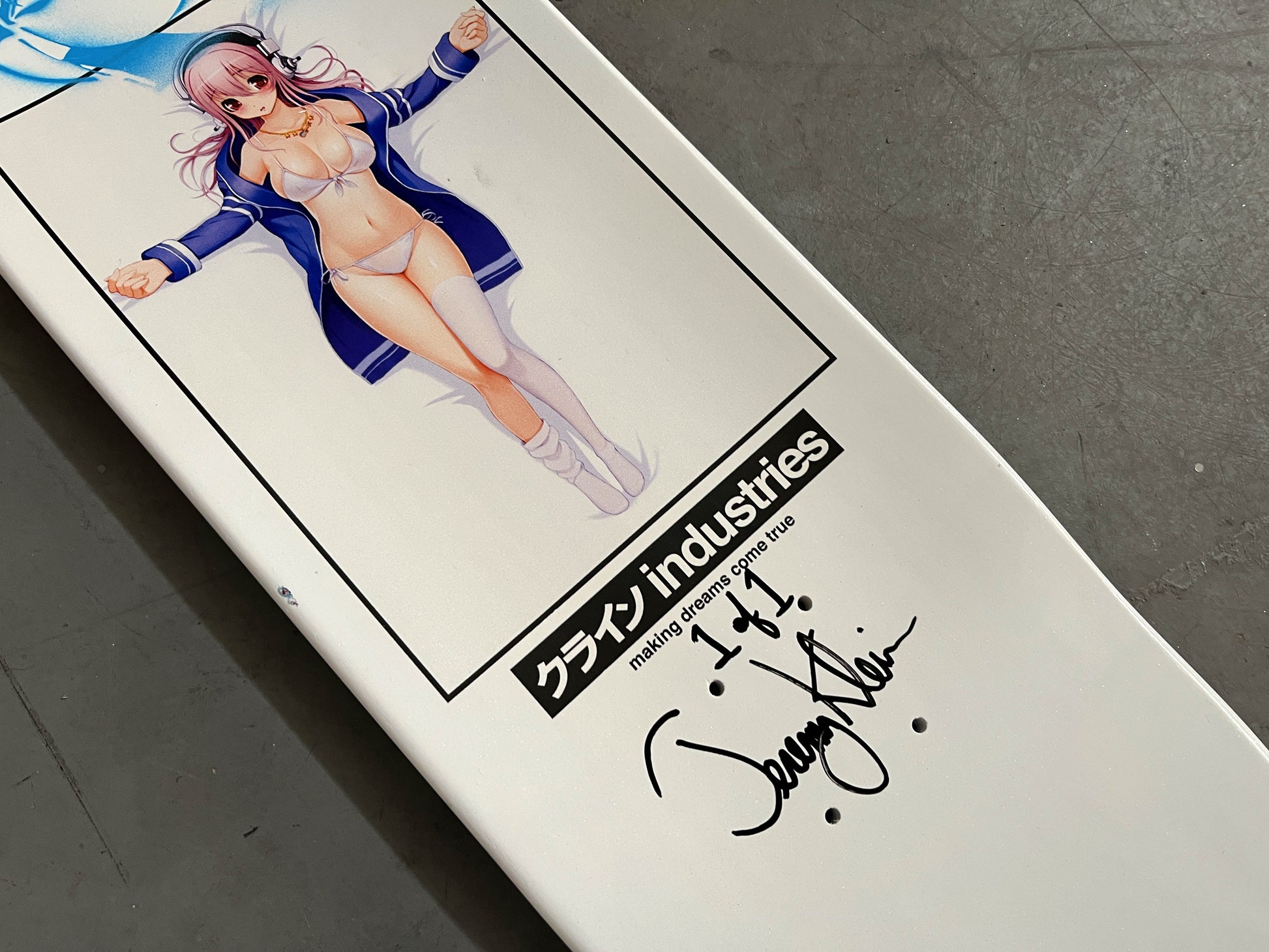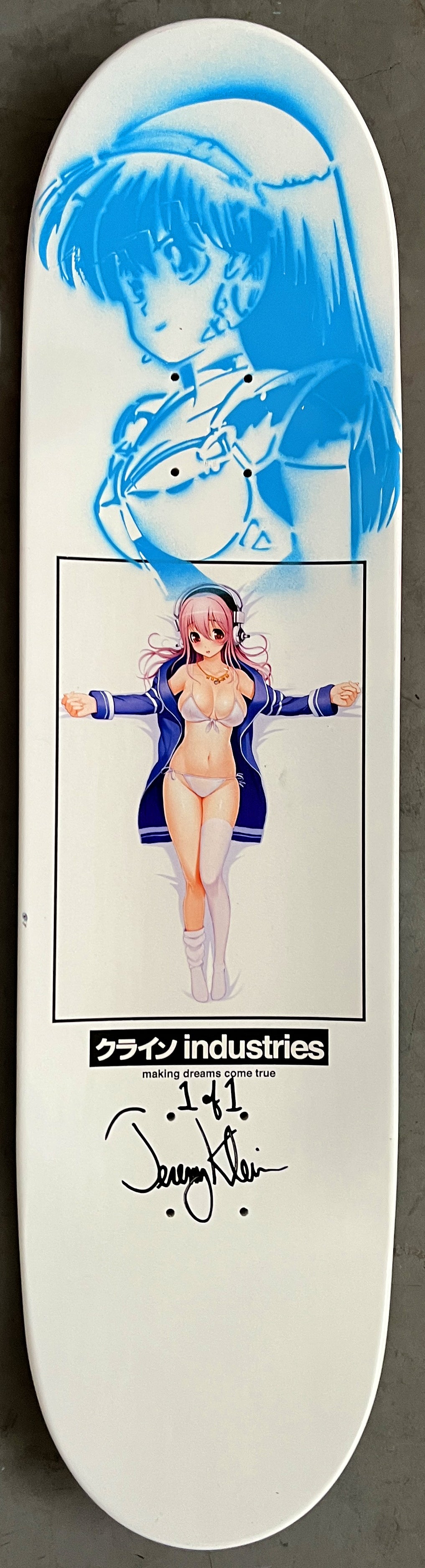 sonico 8.5 X 32.25 POWDER BLUE/PEARL WHITE/PINK MIXED PROCESS SIGNED 1 of 1, heat transfer with hand spray paint, and signed on top. 1 of 1