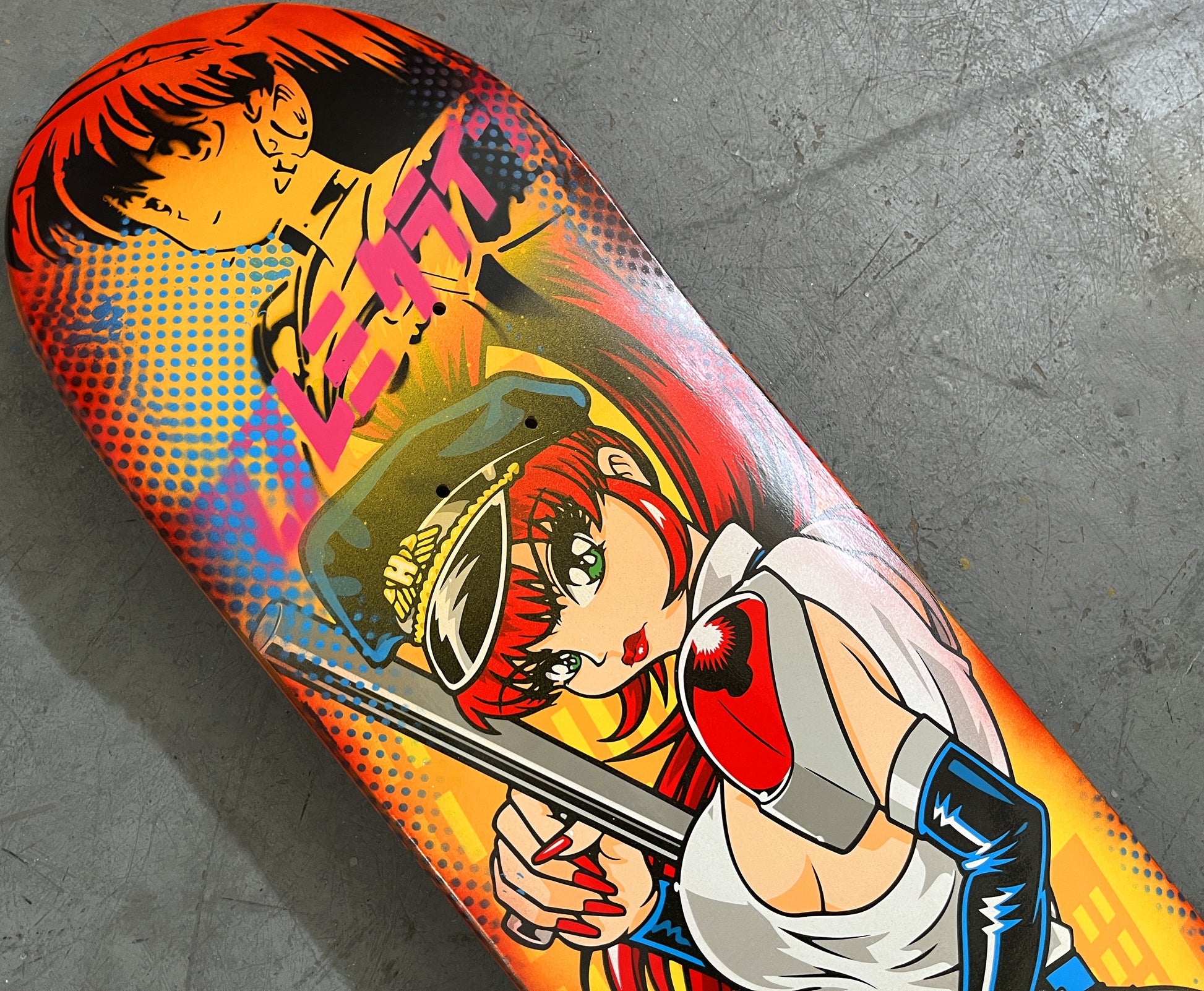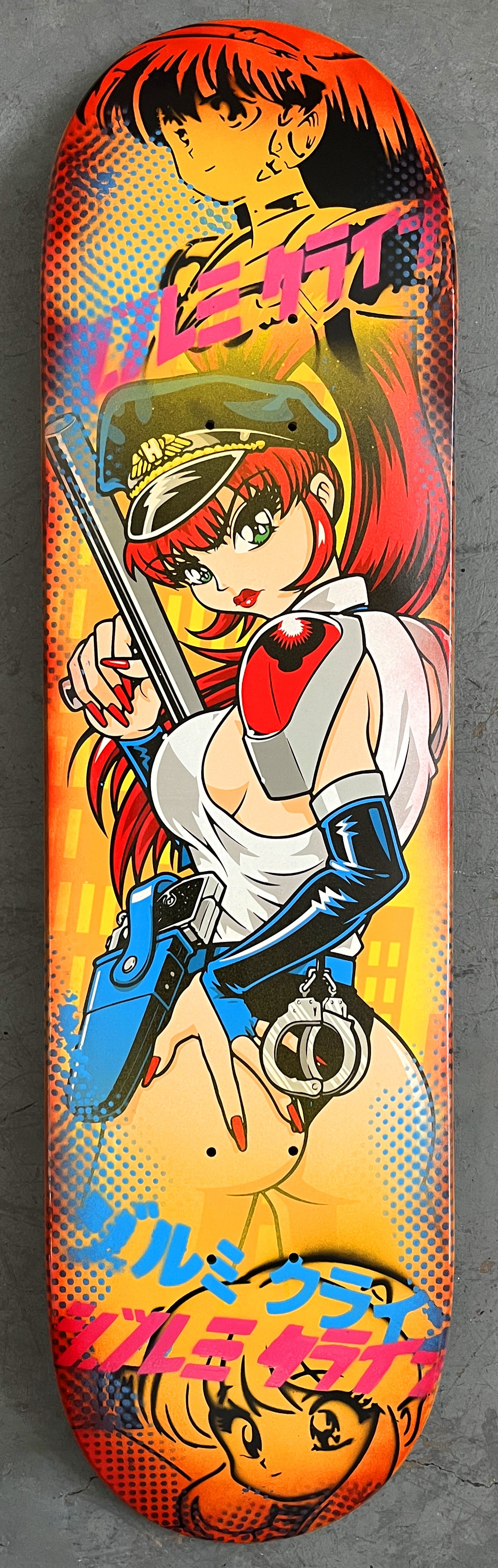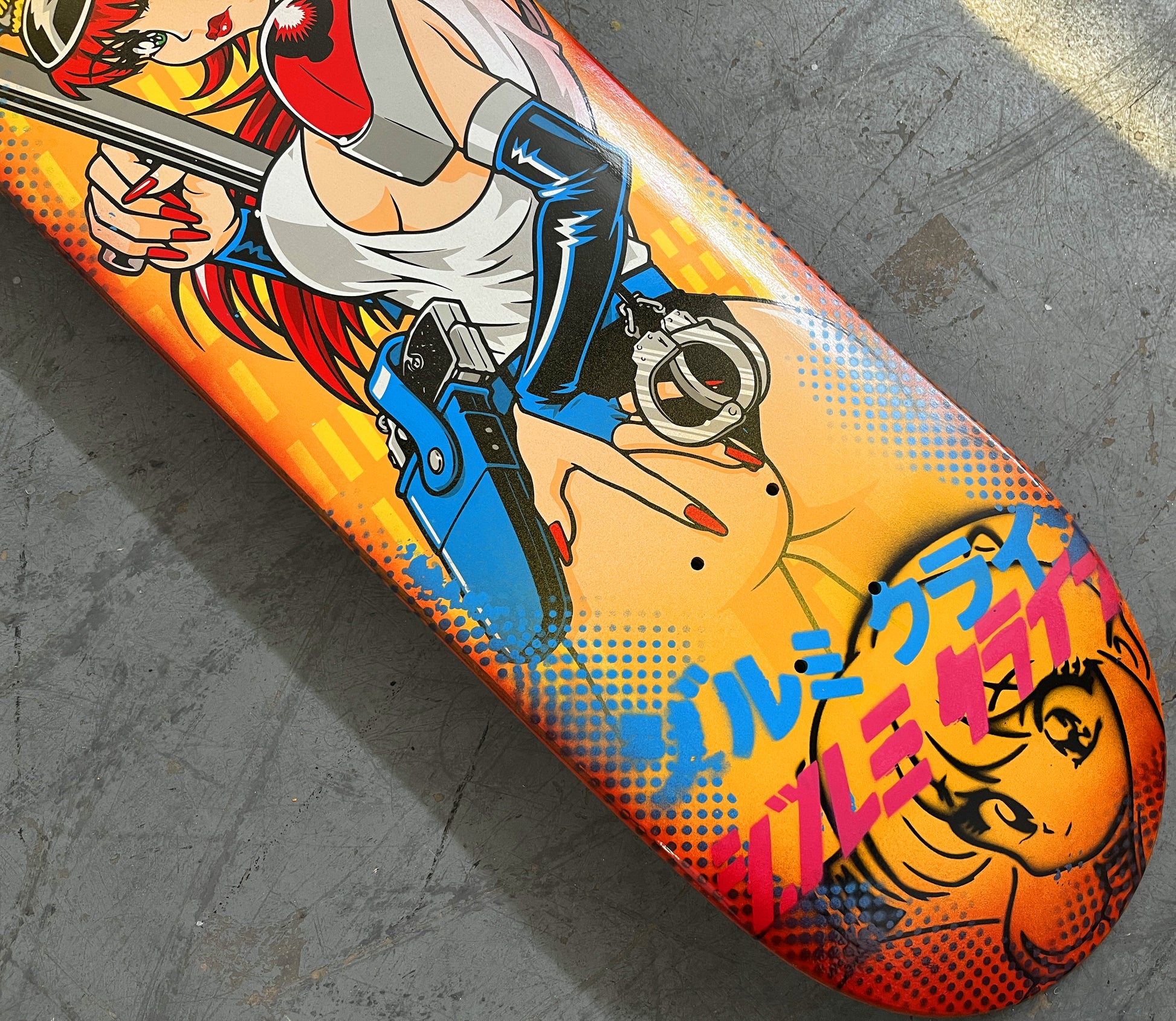 supercop 8.25 X 32.25 YELLOW/RED ANODIZED MIXED PROCESS SIGNED 1 of 1, hand screened with hand spray paint, and signed on top. 1 of 1