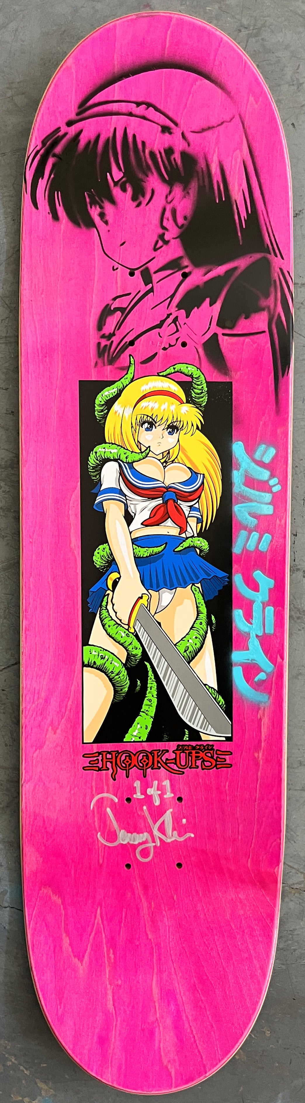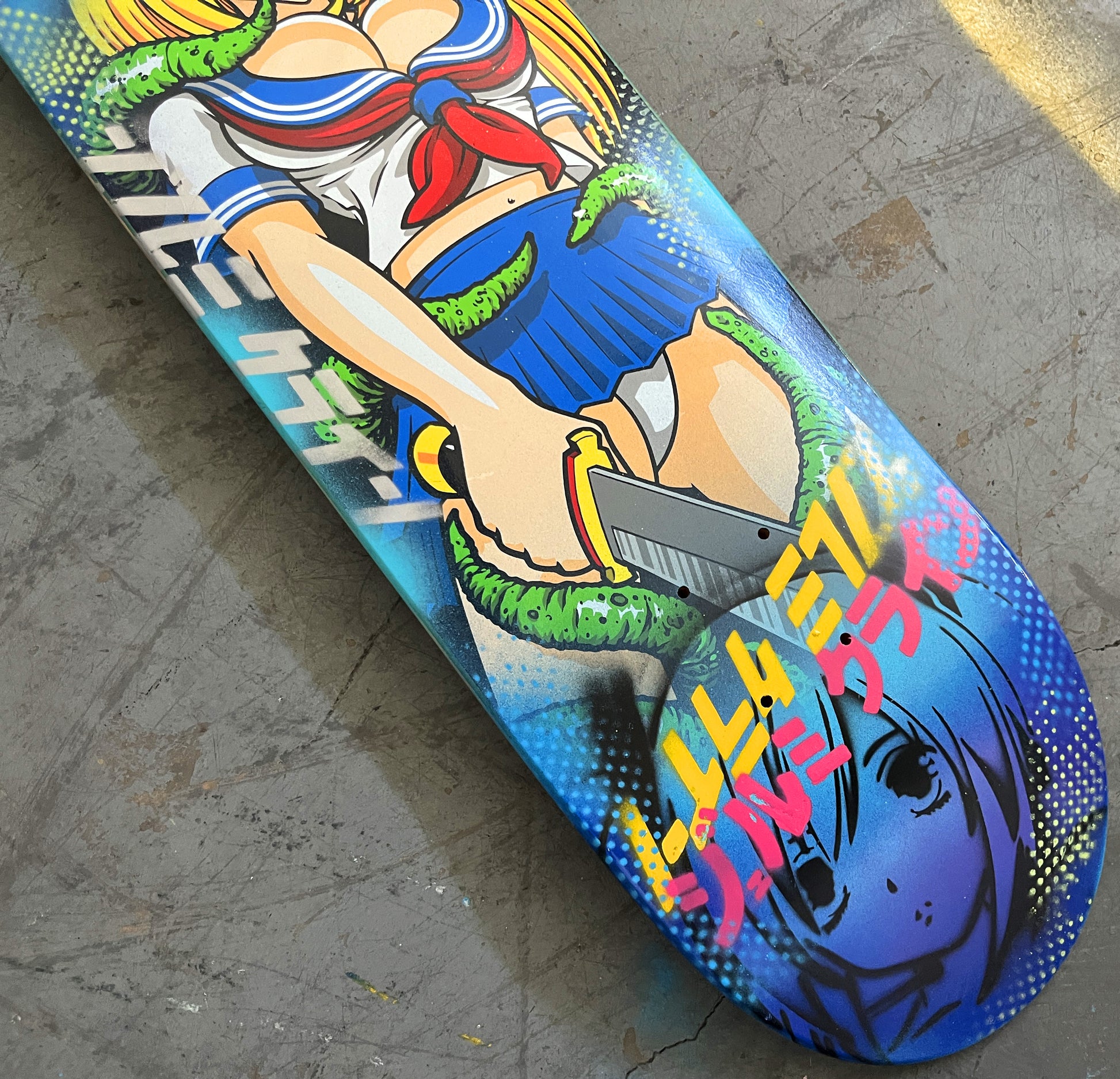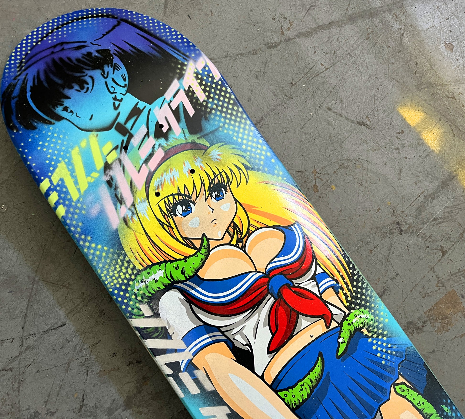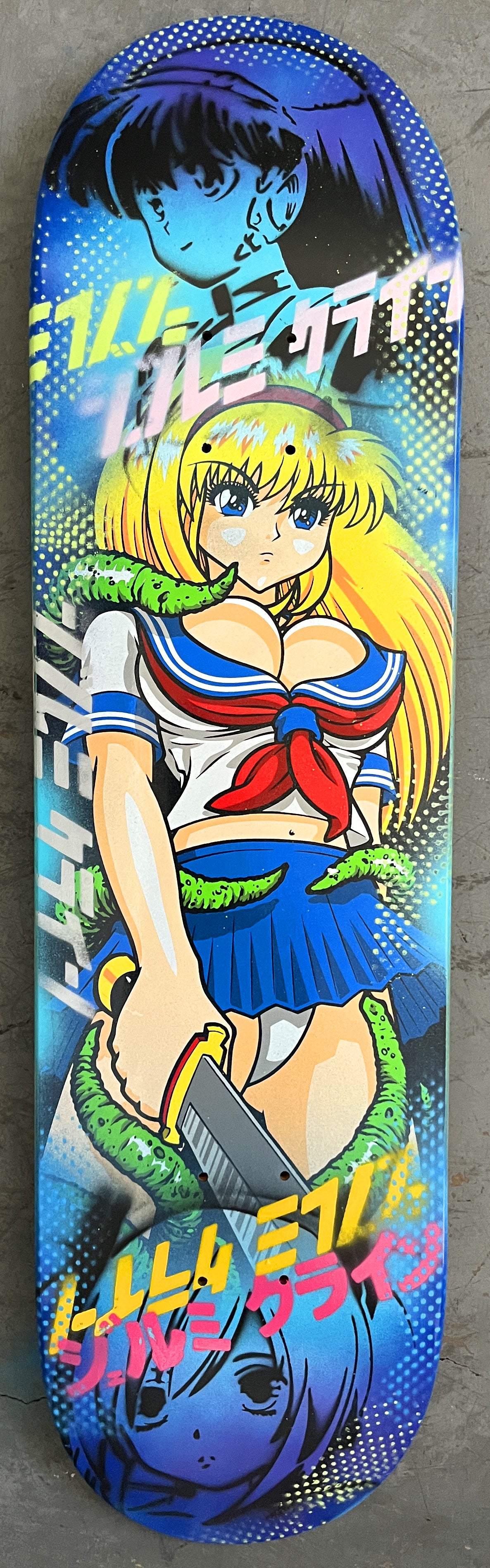 tentacle school girl 8.25 X 32.25 BLUE/BLUE BLUE MIXED PROCESS SIGNED 1 of 1, heat transfer with hand spray paint, and signed on top. 1 of 1