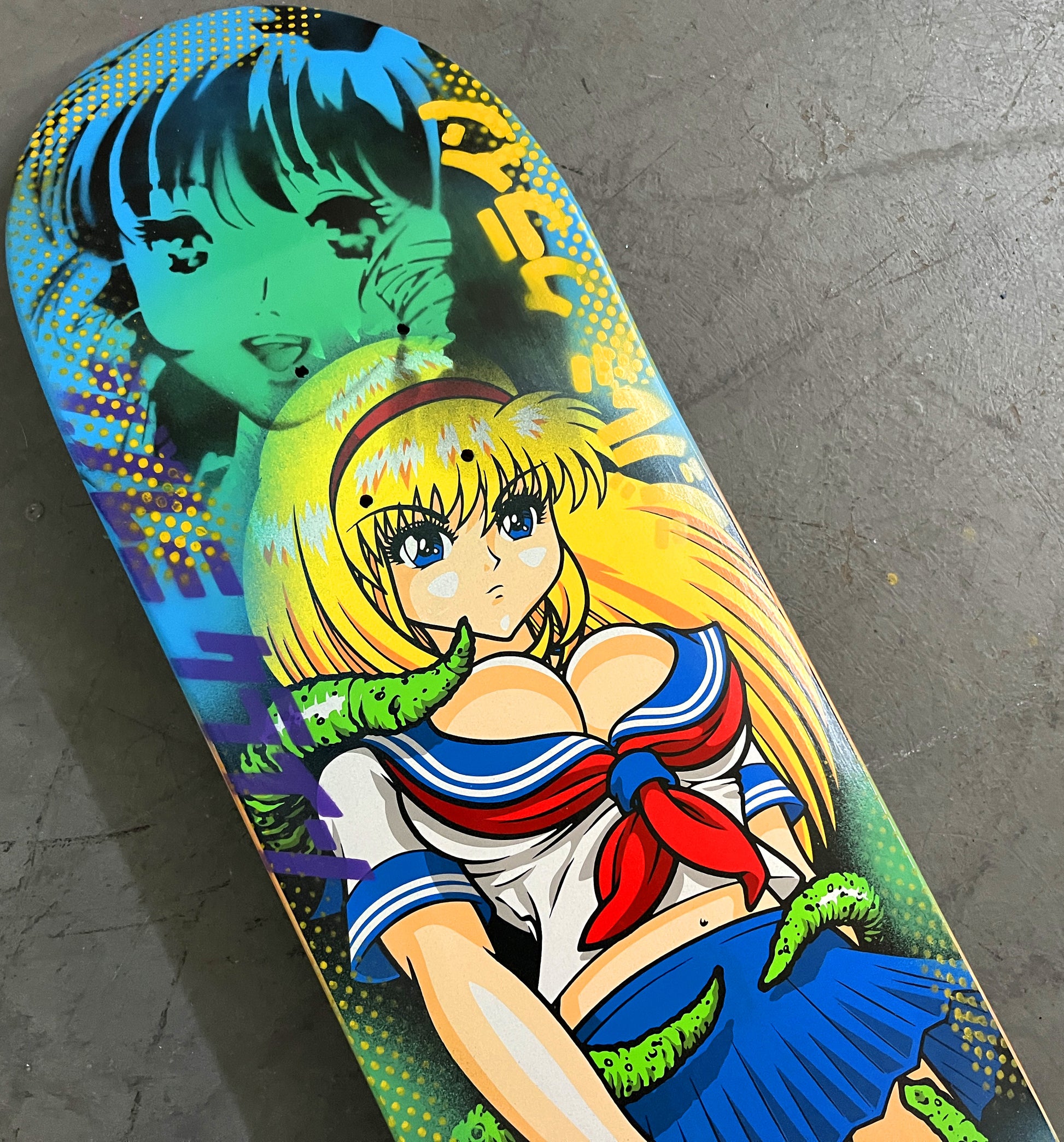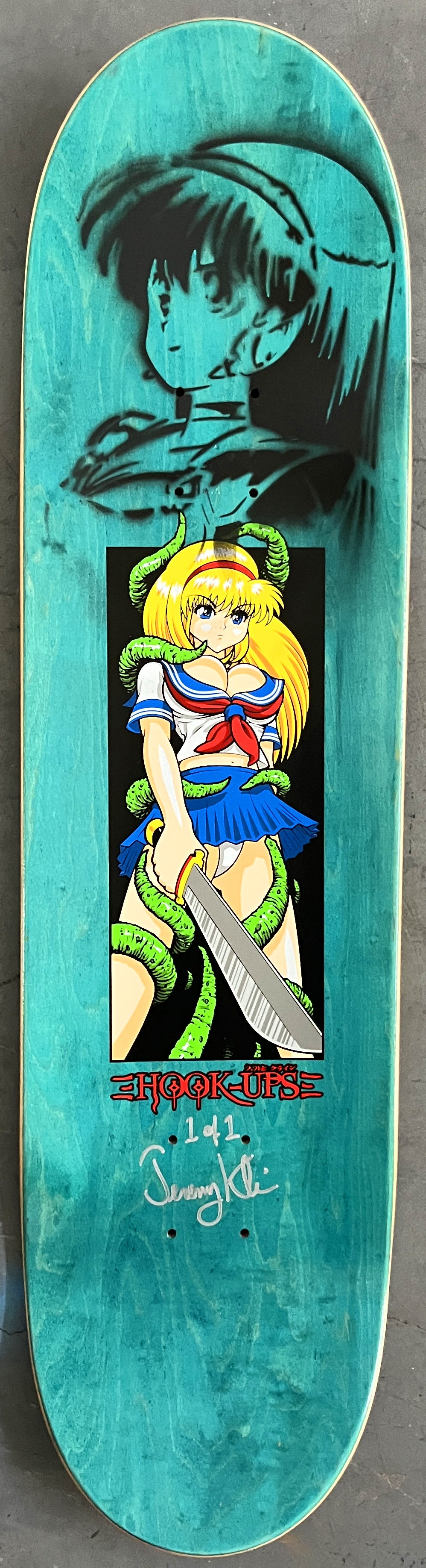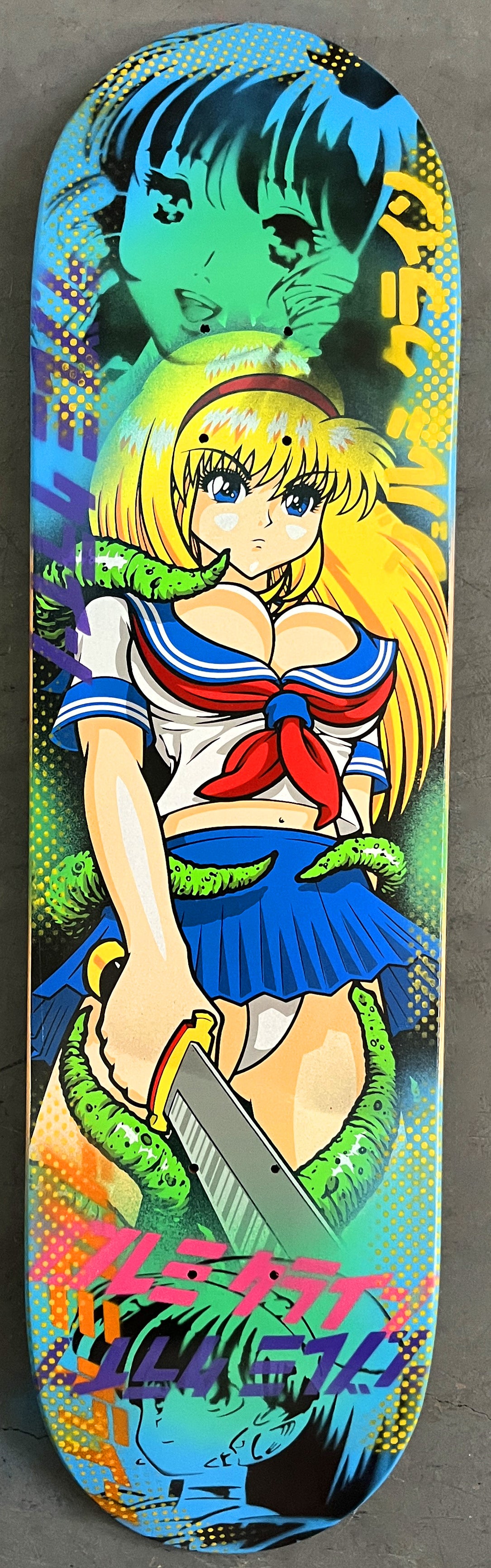 tentacle school girl 8.25 X 32.25 BLUE/GREEN BLUE MIXED PROCESS SIGNED 1 of 1, heat transfer with hand spray paint, and signed on top. 1 of 1