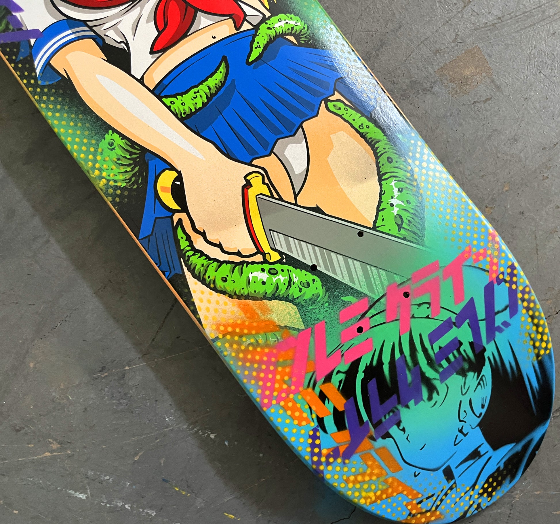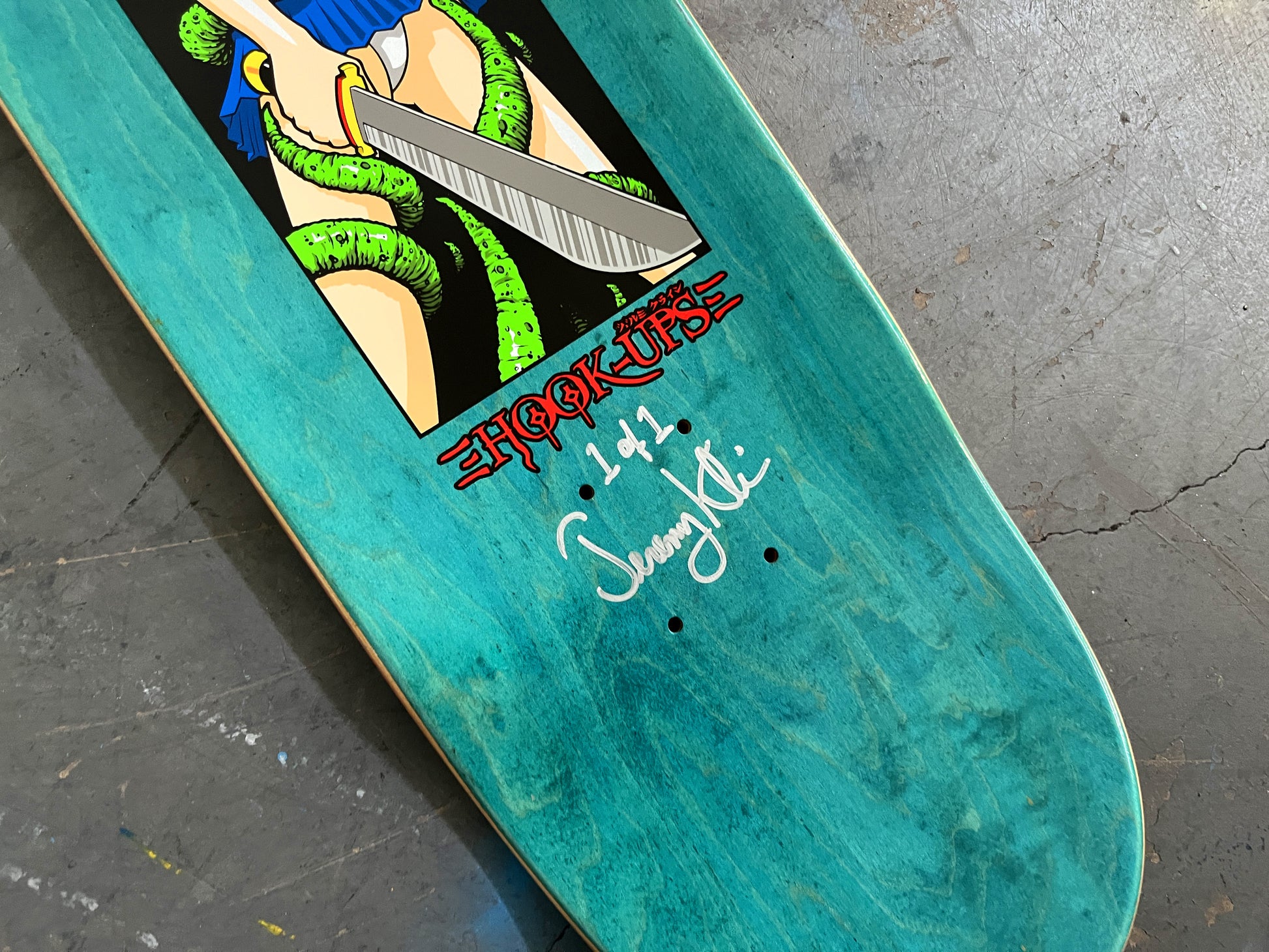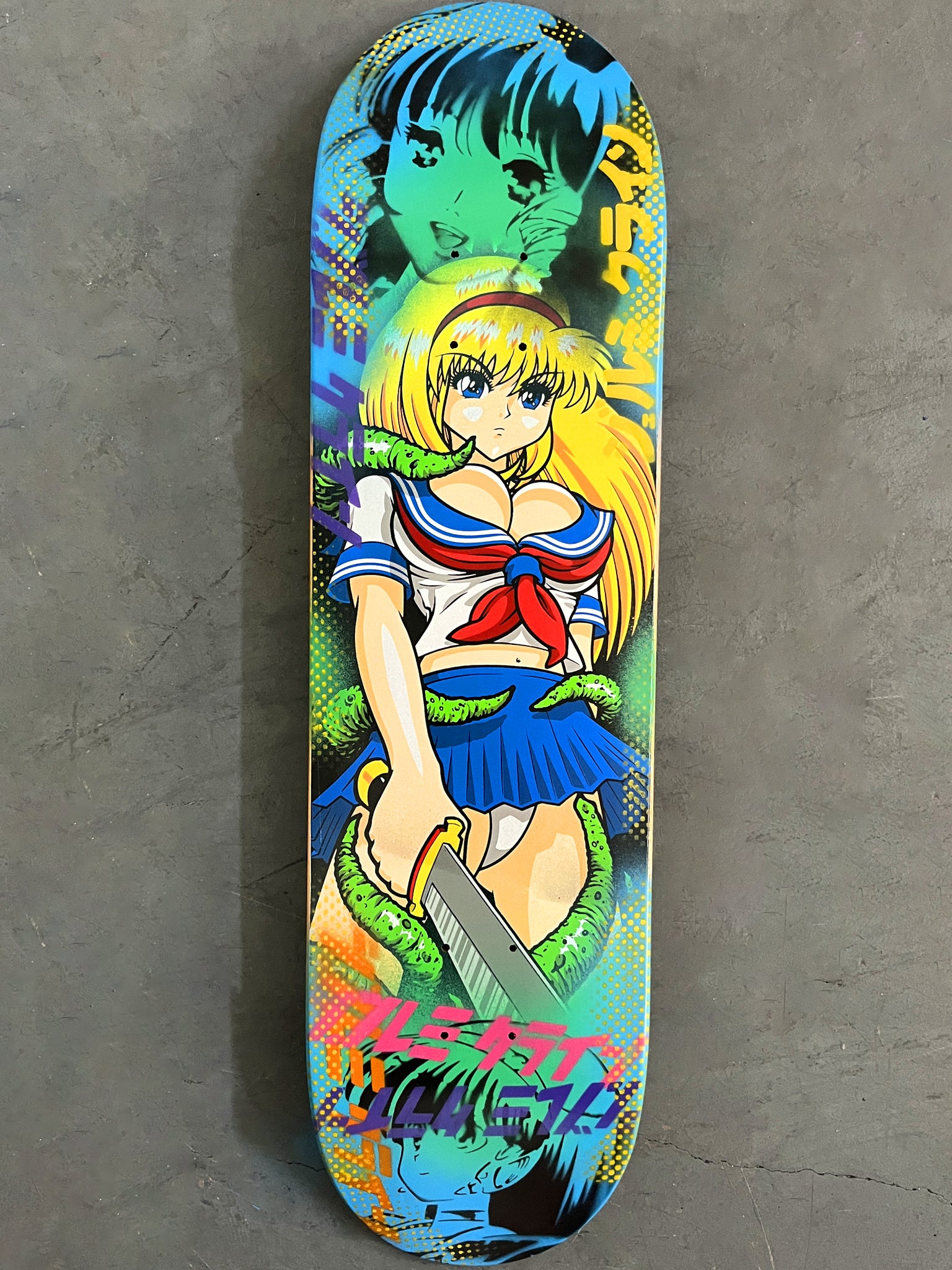 tentacle school girl 8.25 X 32.25 BLUE/GREEN BLUE MIXED PROCESS SIGNED 1 of 1, heat transfer with hand spray paint, and signed on top. 1 of 1