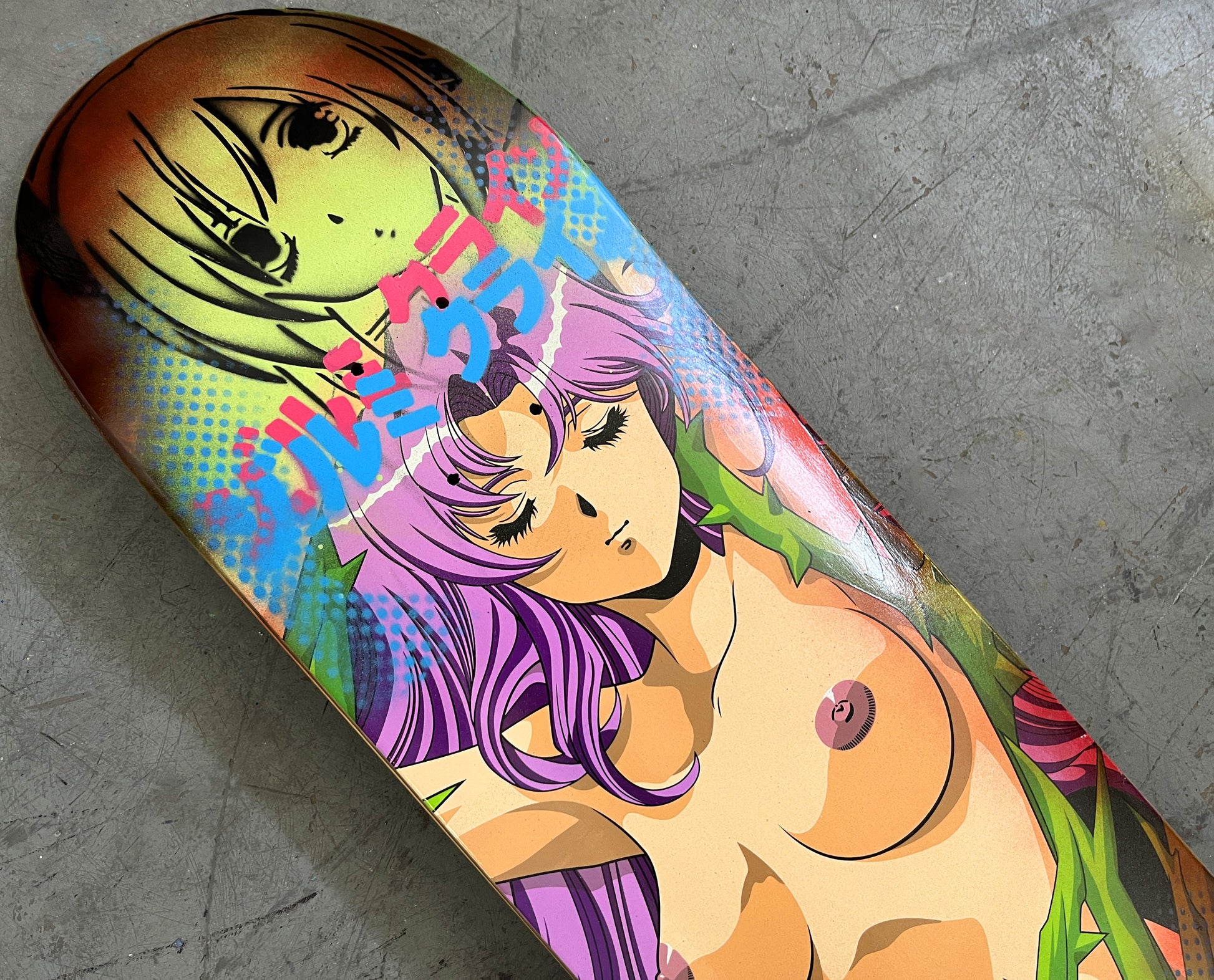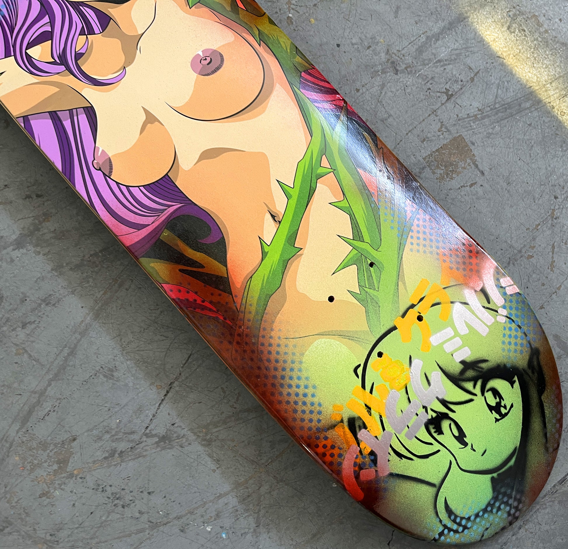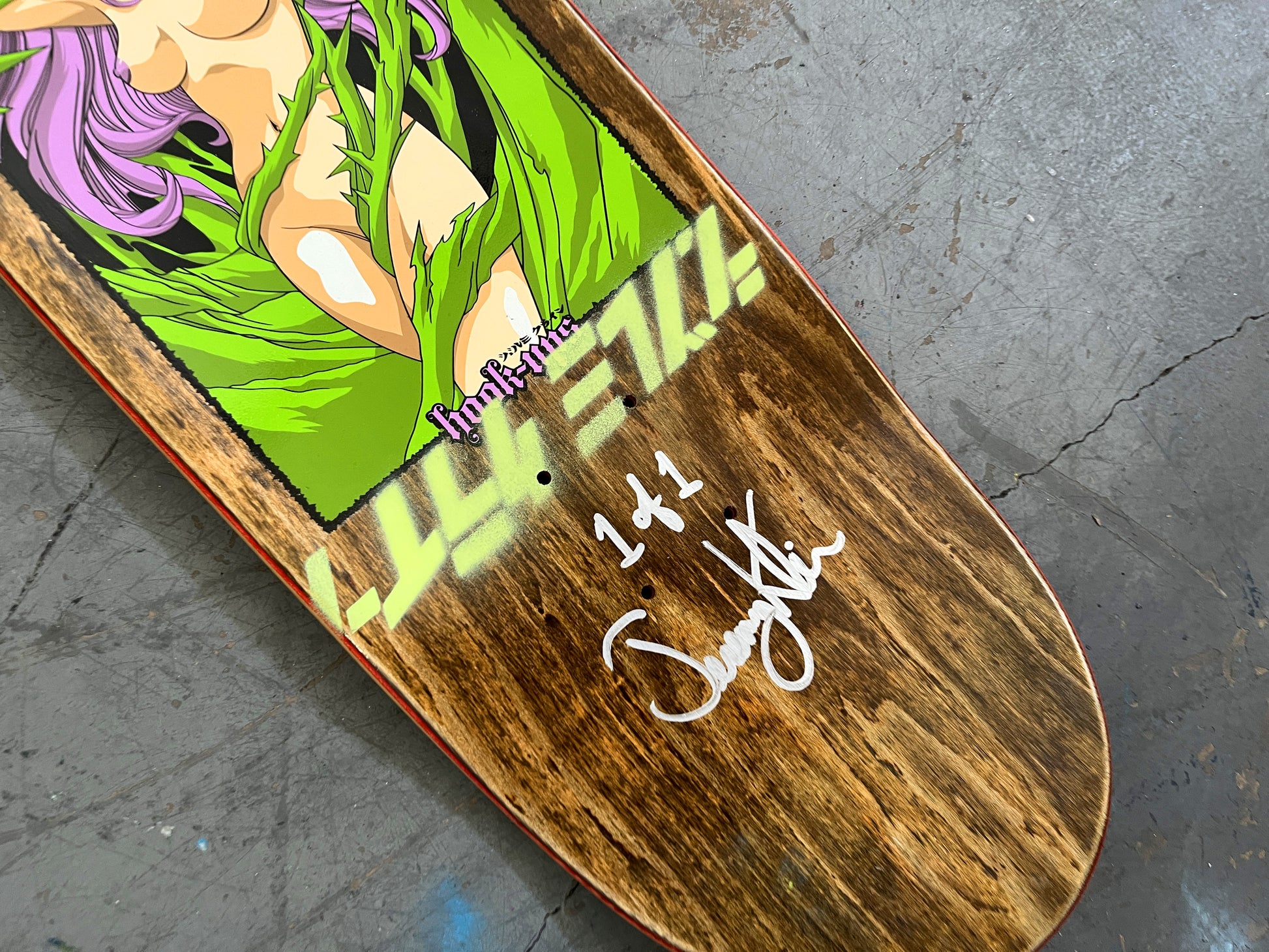 thorn paradise 8.25 X 32.25 GREEN MIXED PROCESS SIGNED 1 of 1, heat transfer with hand spray paint, and signed on top. 1 of 1