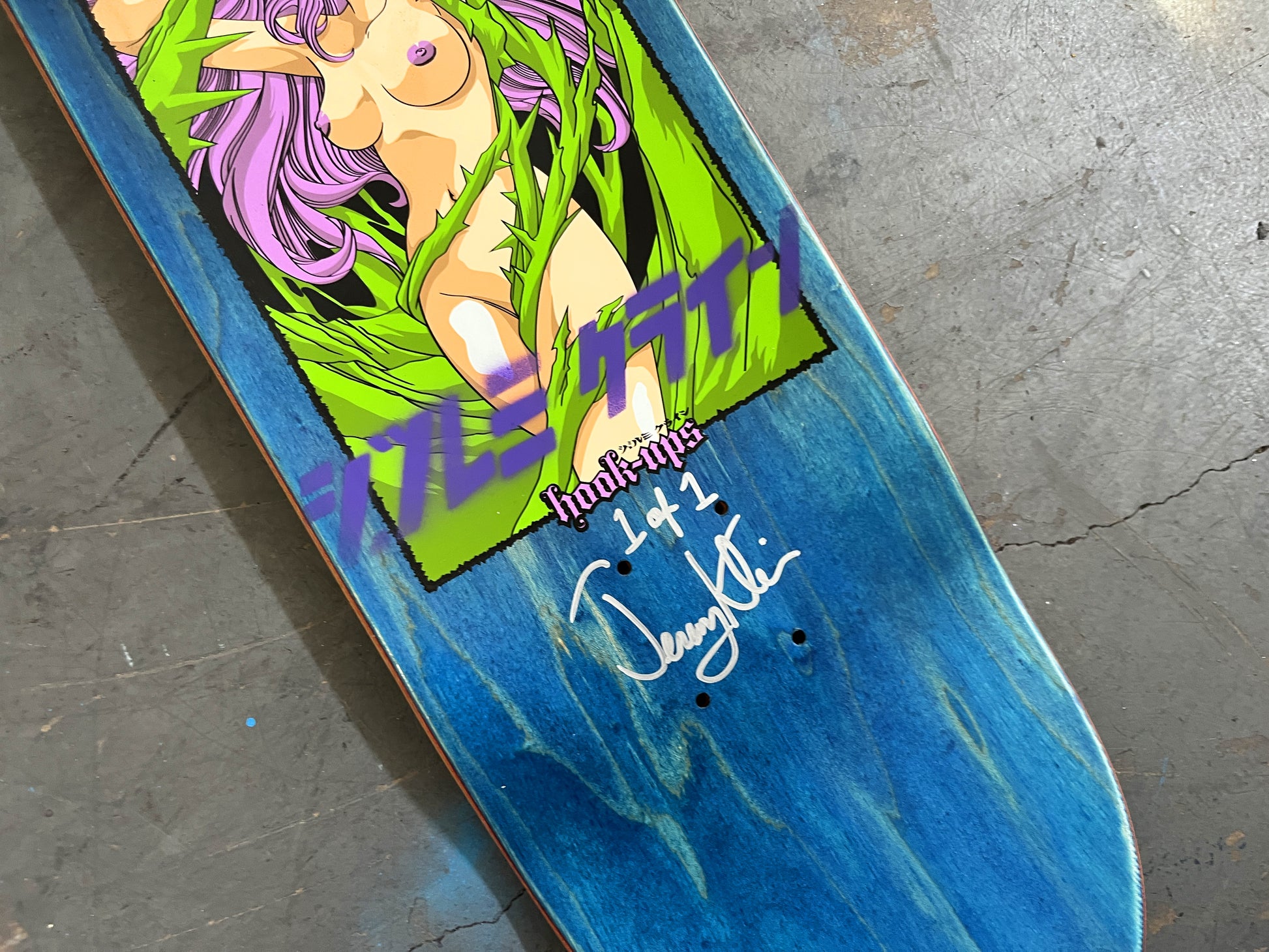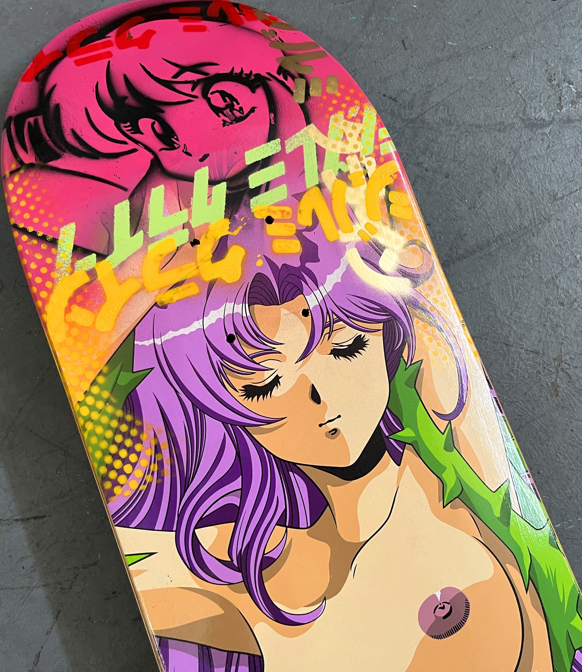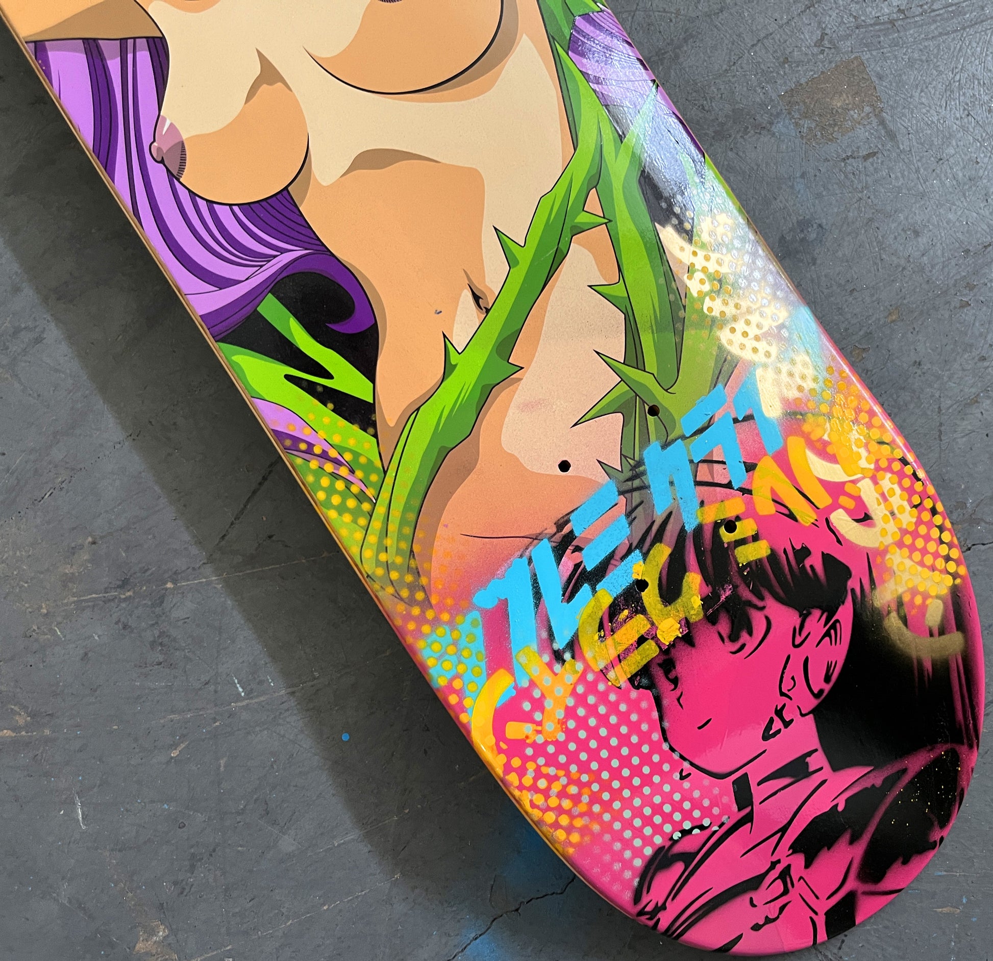 thorn paradise 8.25 X 32.25 PINK/YELLOW MIXED PROCESS SIGNED 1 of 1, heat transfer with hand spray paint, and signed on top. 1 of 1