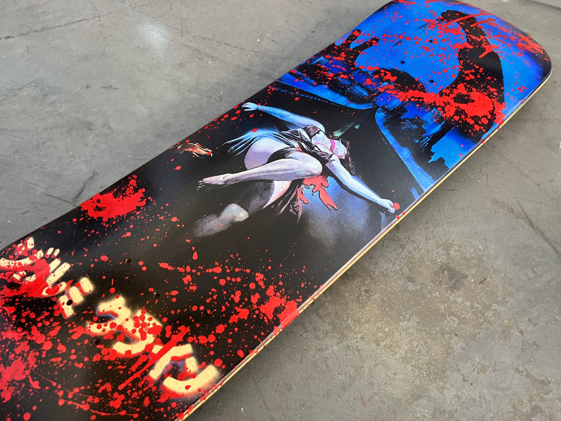 tokyo ripper 8.5 X 32 BLOOD EDITION ANODIZED BLUE SIGNED, 4 color process screen printed by screaming squeegees. HAND PAINTED BLOOD, EACH BOARD IS DIFFERENT AND UNIQUE