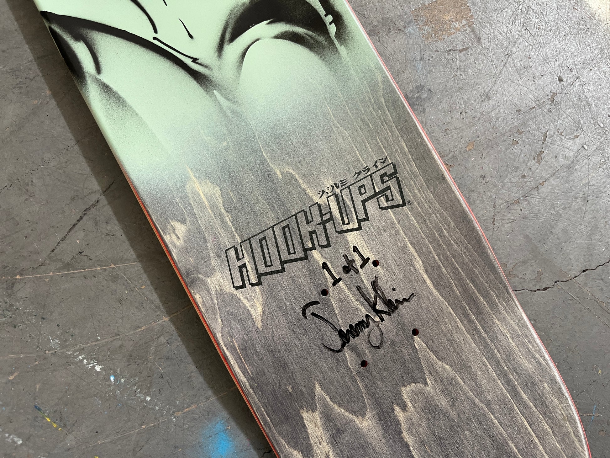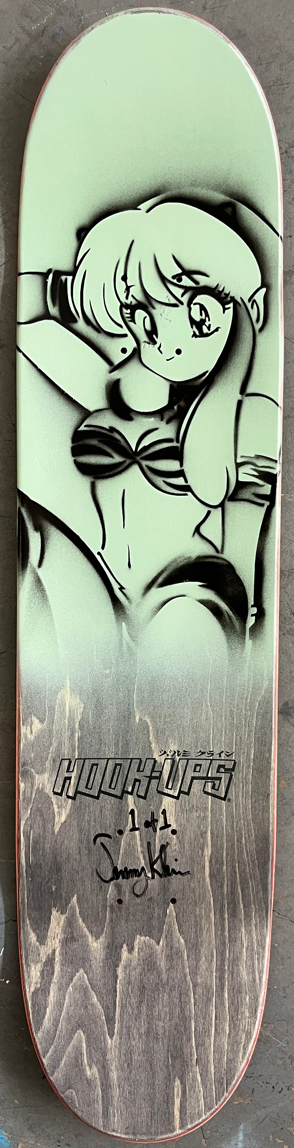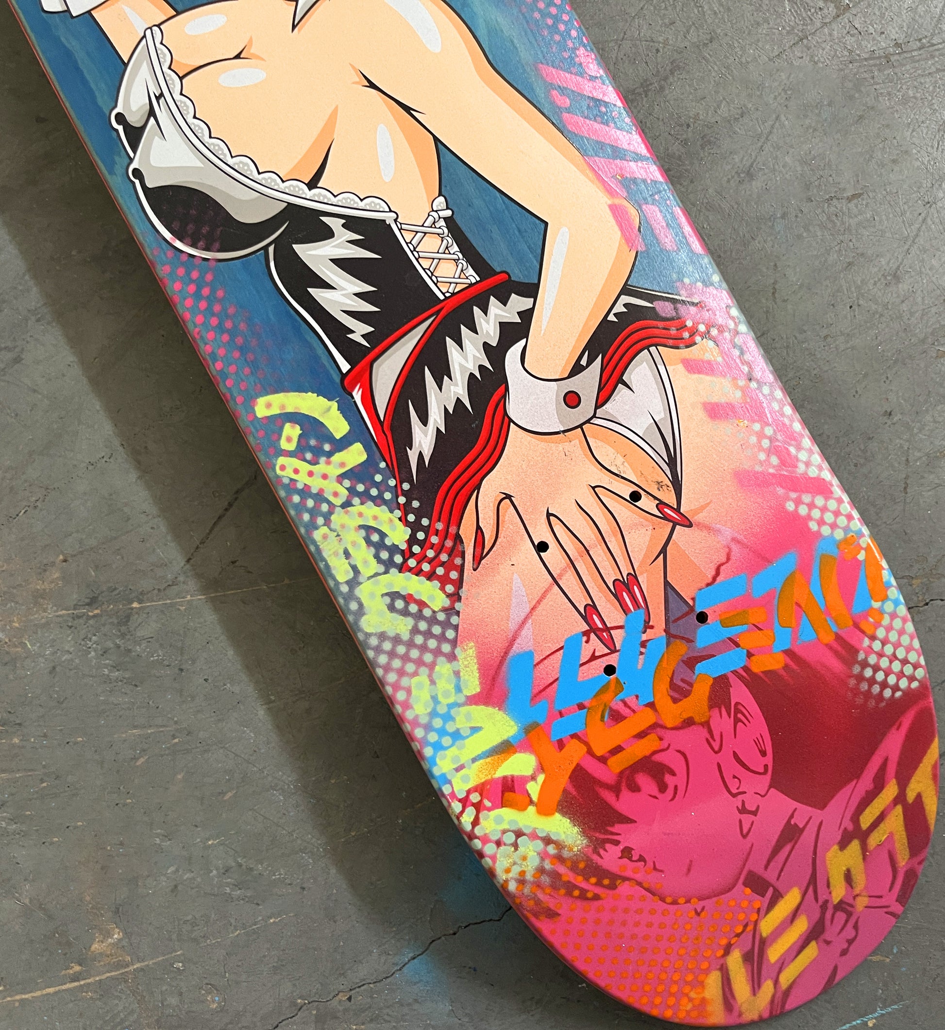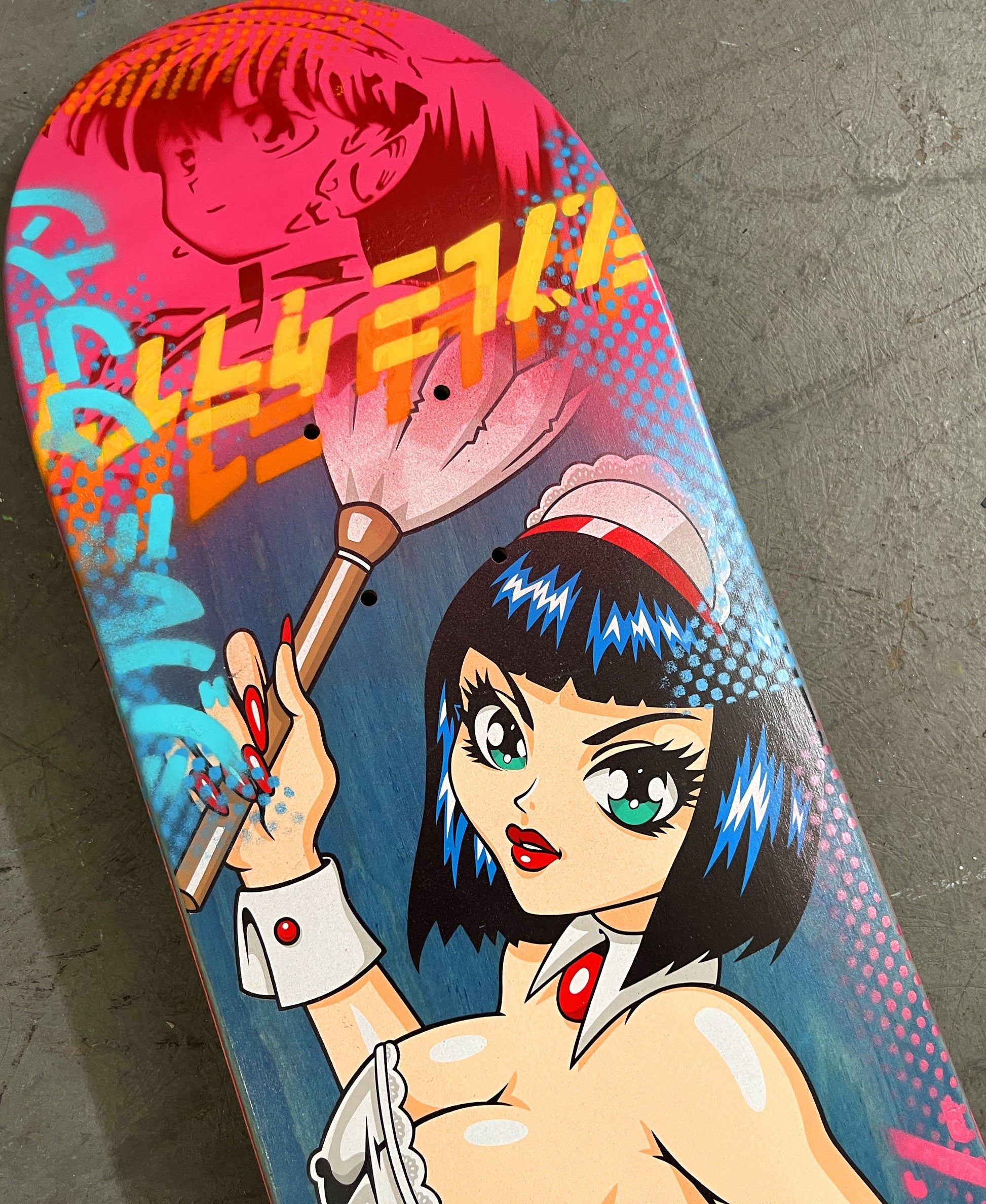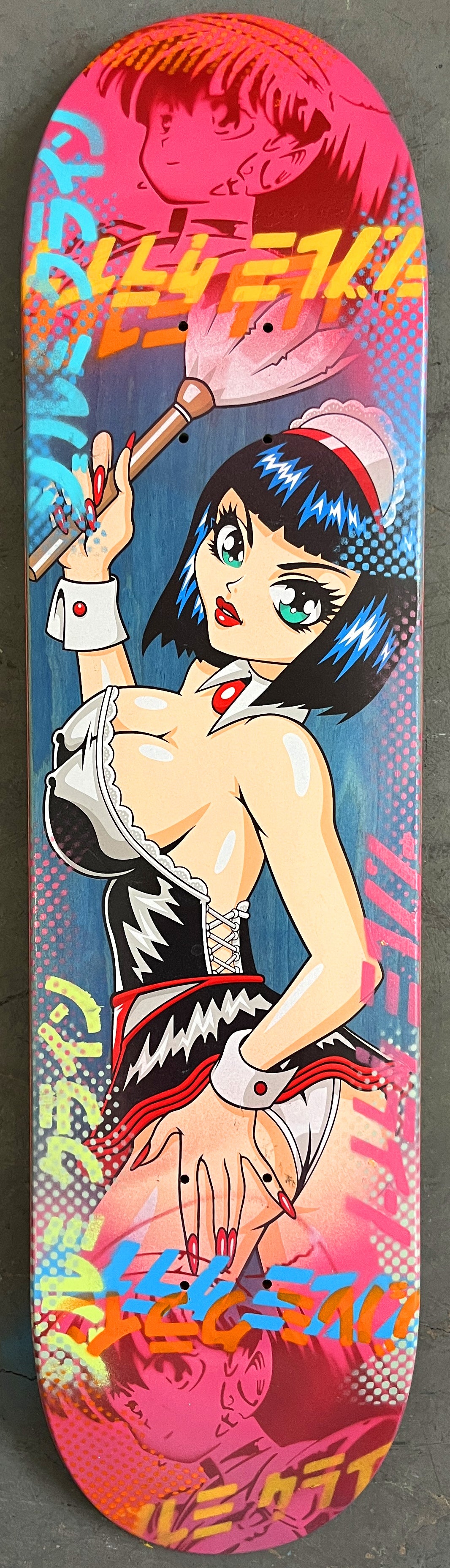 trixie 8.0 X 31.75 PINK MIXED PROCESS SIGNED 1 of 1, heat transfer with hand spray paint, and signed on top. 1 of 1