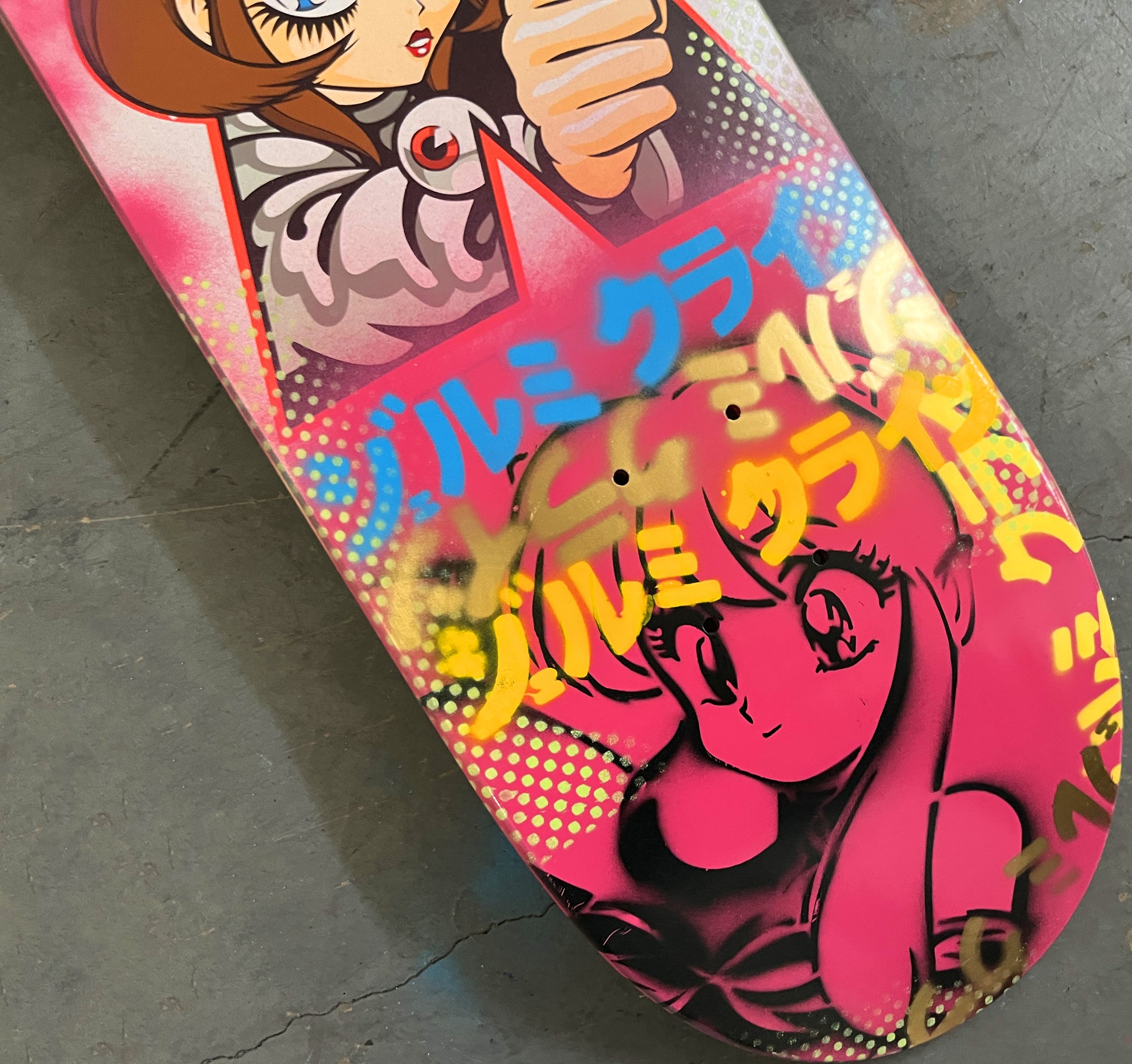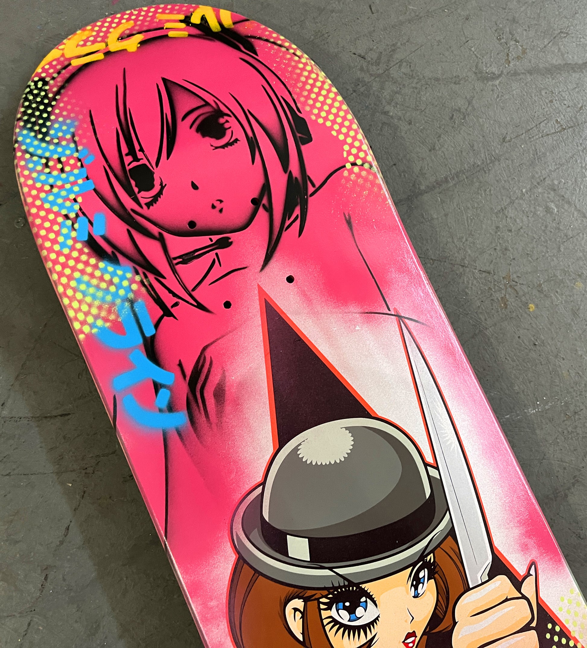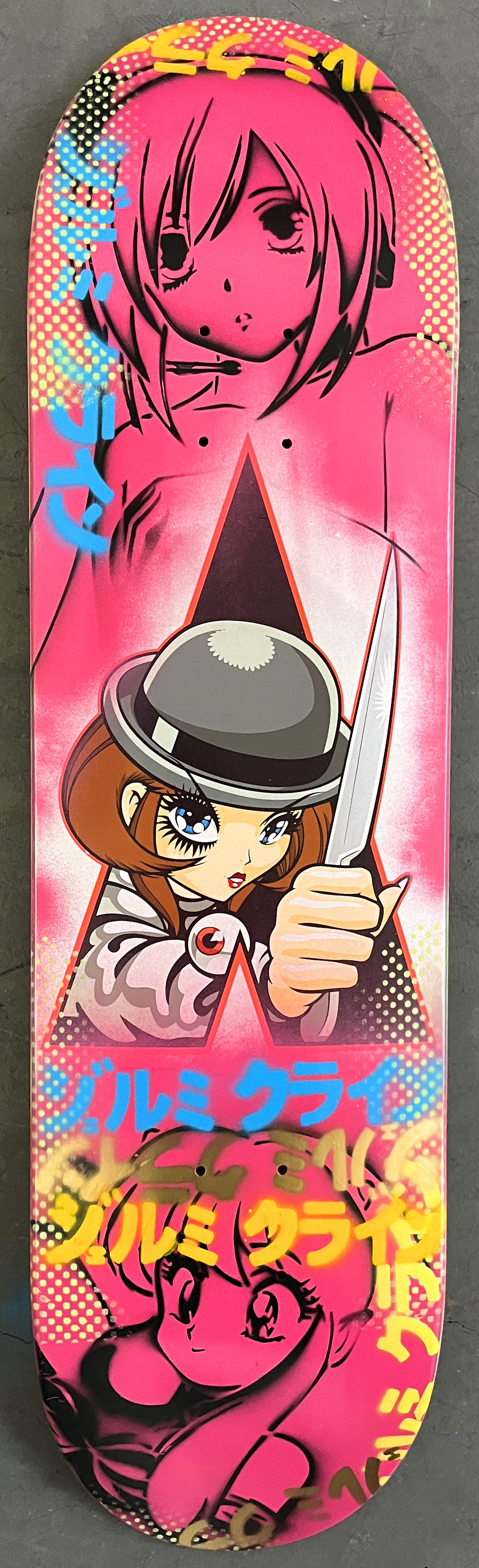 ultraviolence 8.25 X 32.25 WHITE/PINK MIST MIXED PROCESS SIGNED 1 of 1, heat transfer with hand spray paint, and signed on top. 1 of 1
